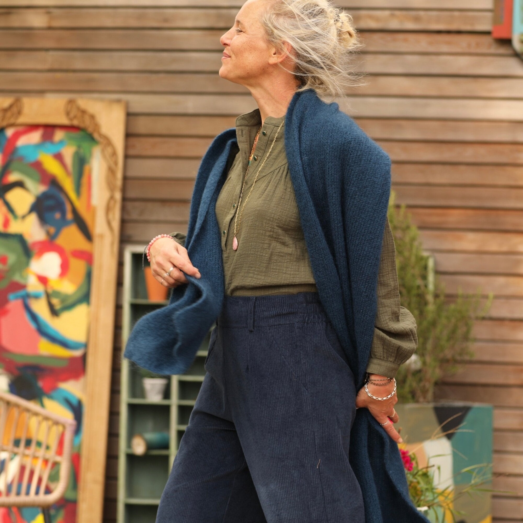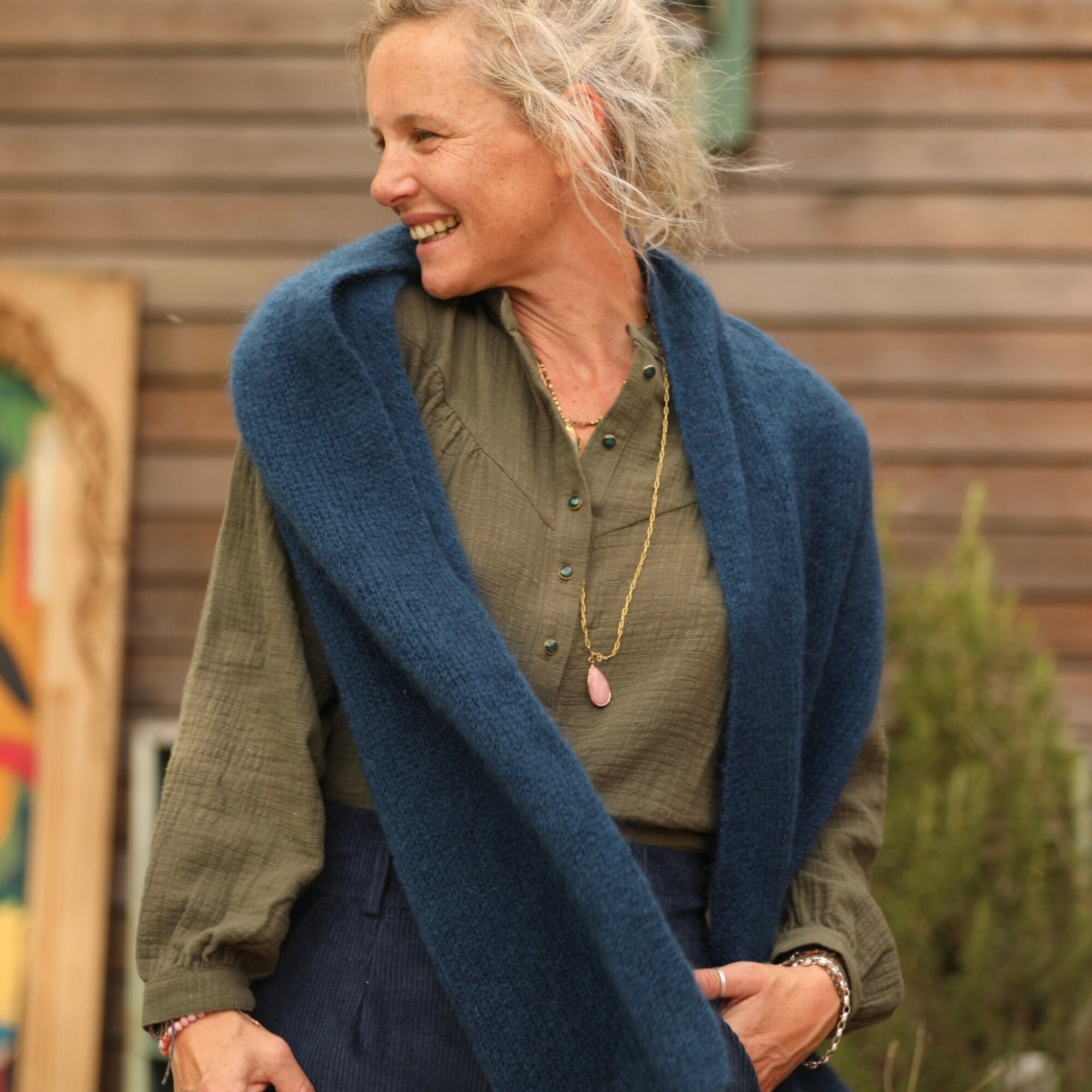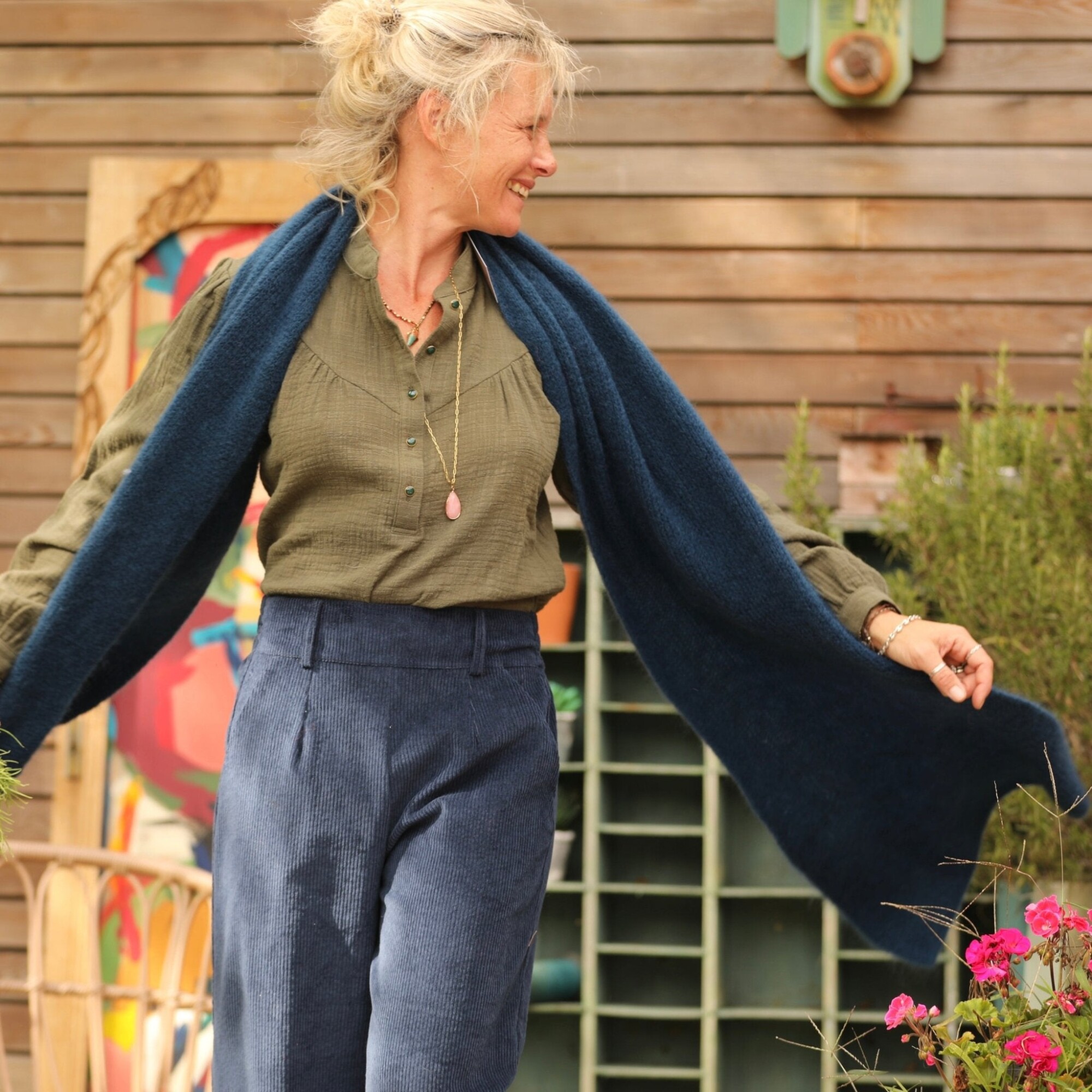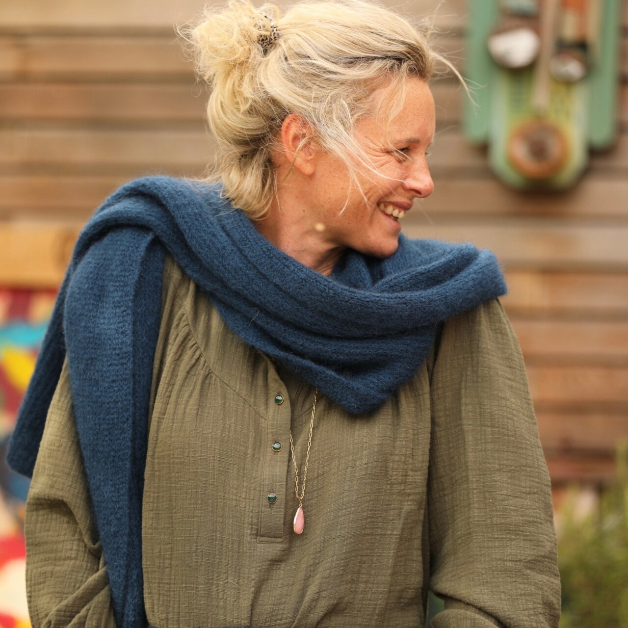 Véra – Une grande écharpe douce et enveloppante, tricotée en Italie. Large et longue, elle permet de s’enrouler confortablement tout en offrant une belle ampleur au porté.