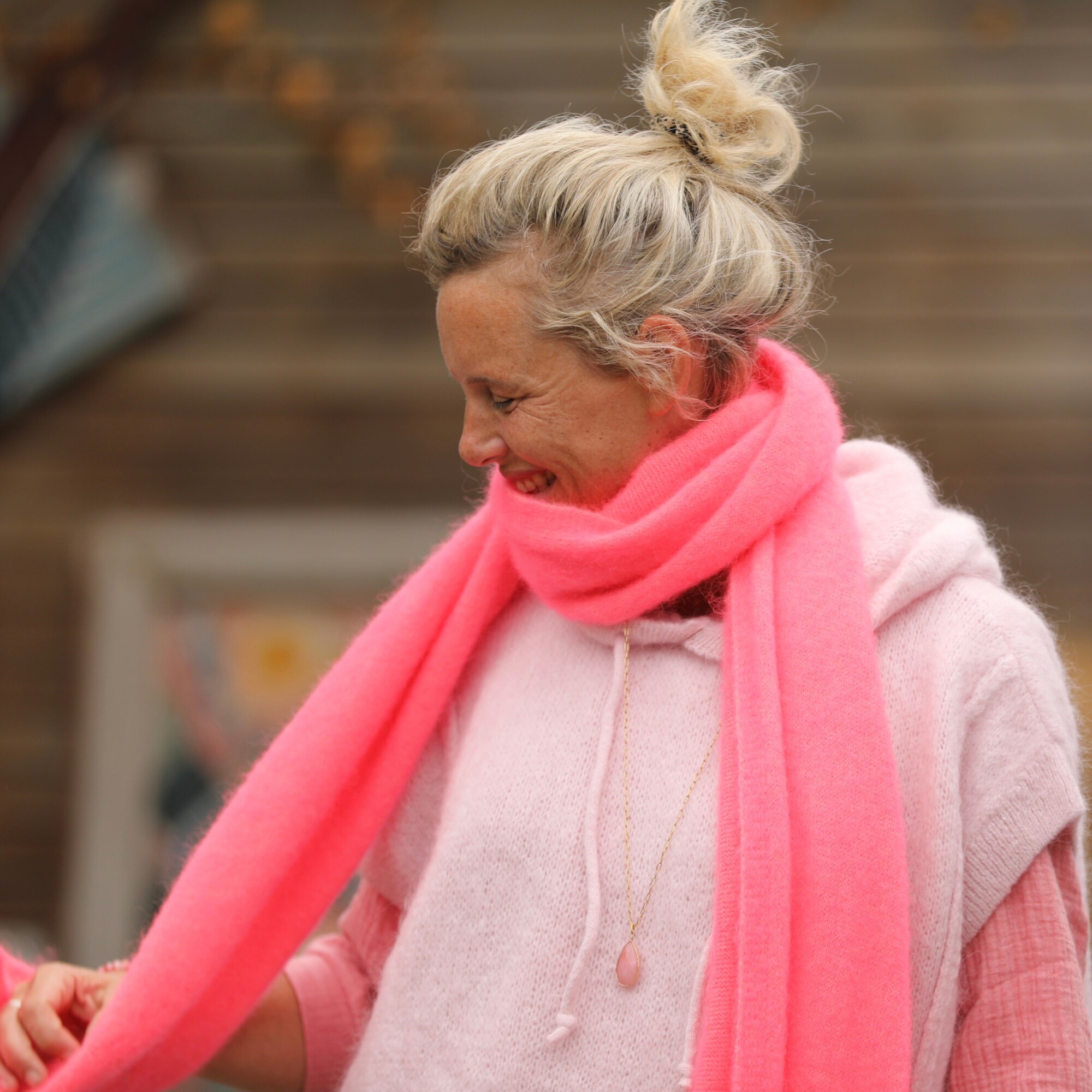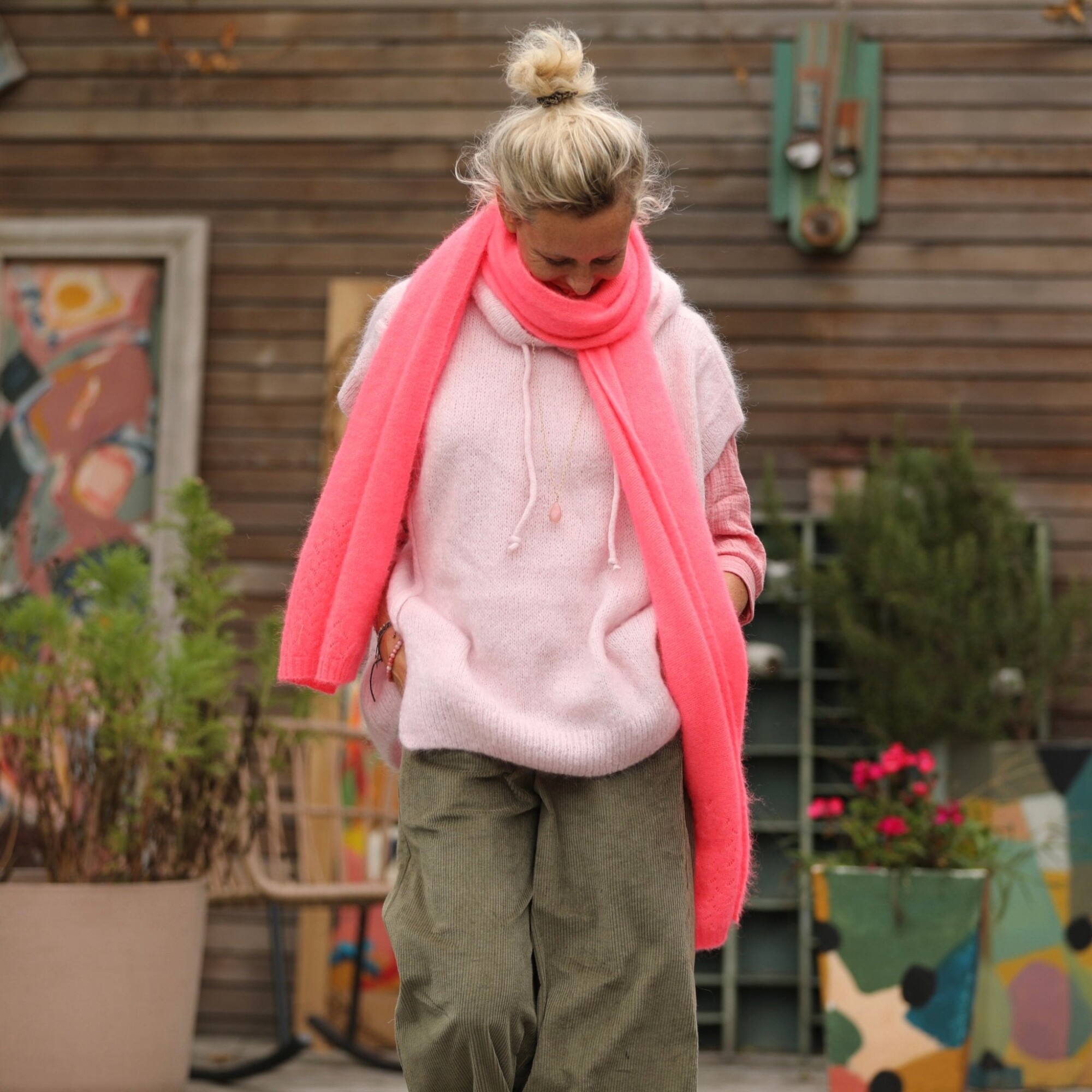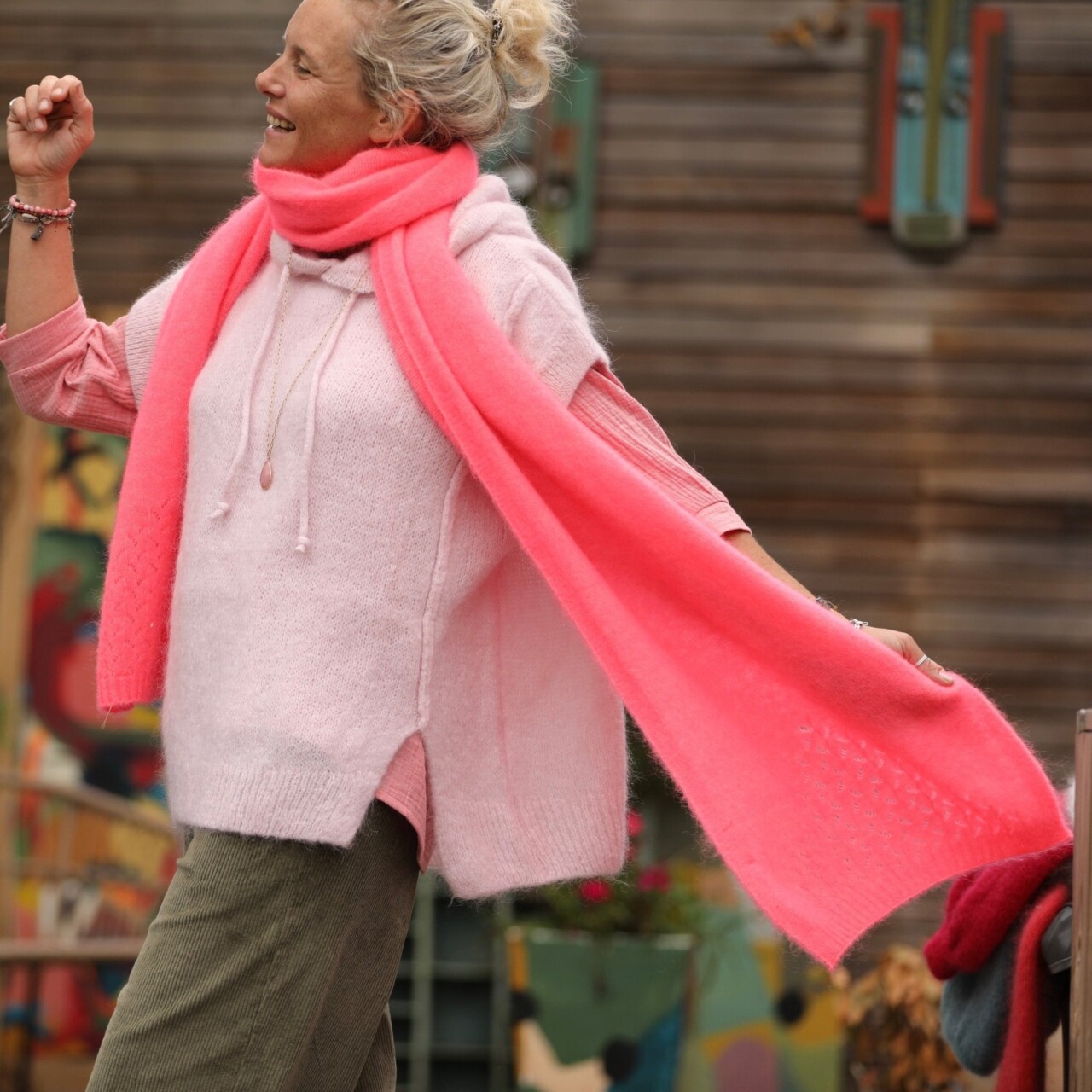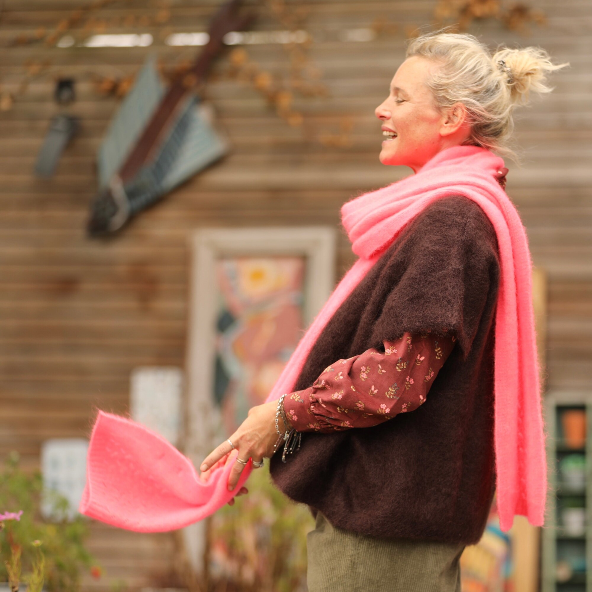 Zénia – Une grande écharpe enveloppante tricotée en Italie, qui allie douceur et élégance. Réalisée avec de l’alpaga, elle séduit par sa texture moelleuse et réconfortante.