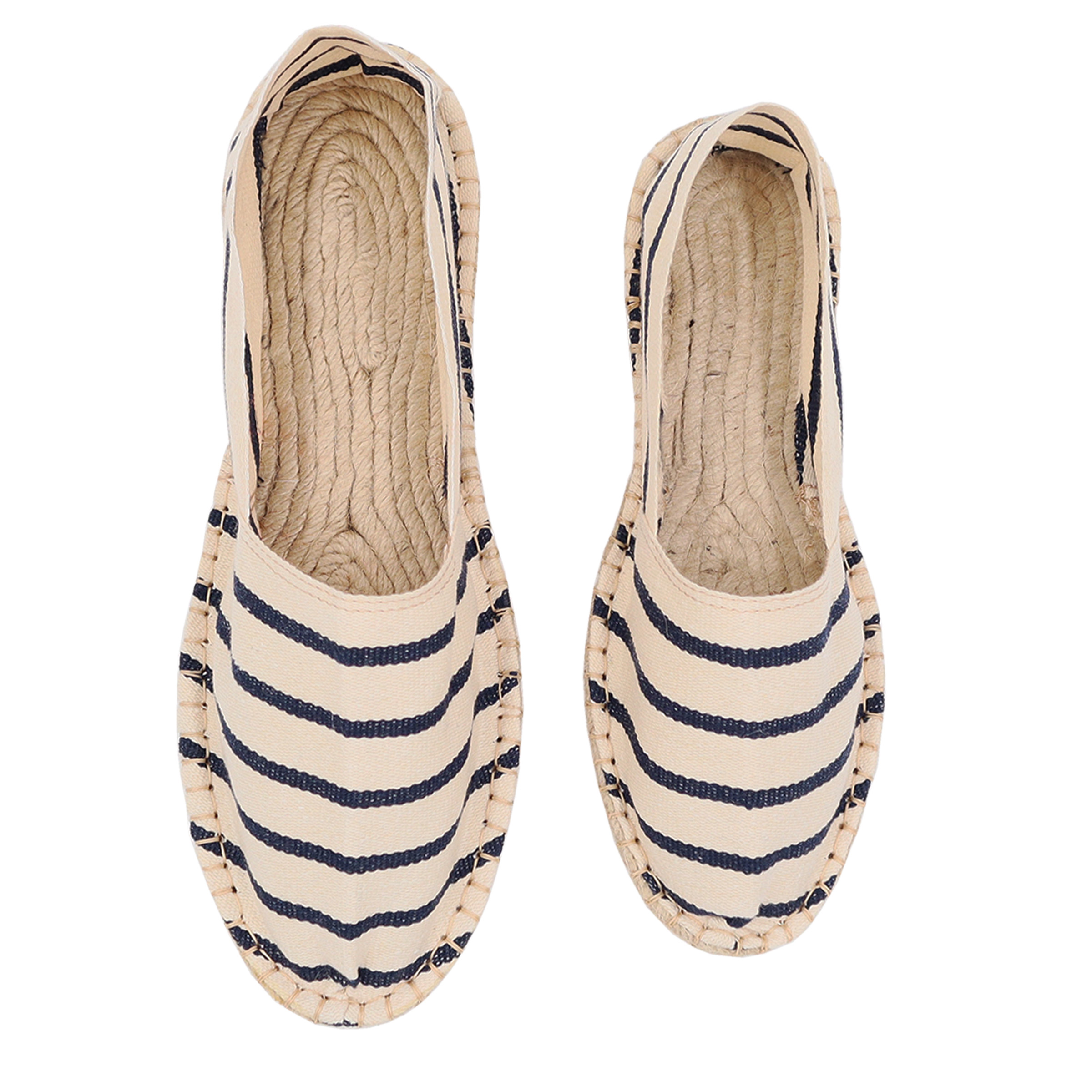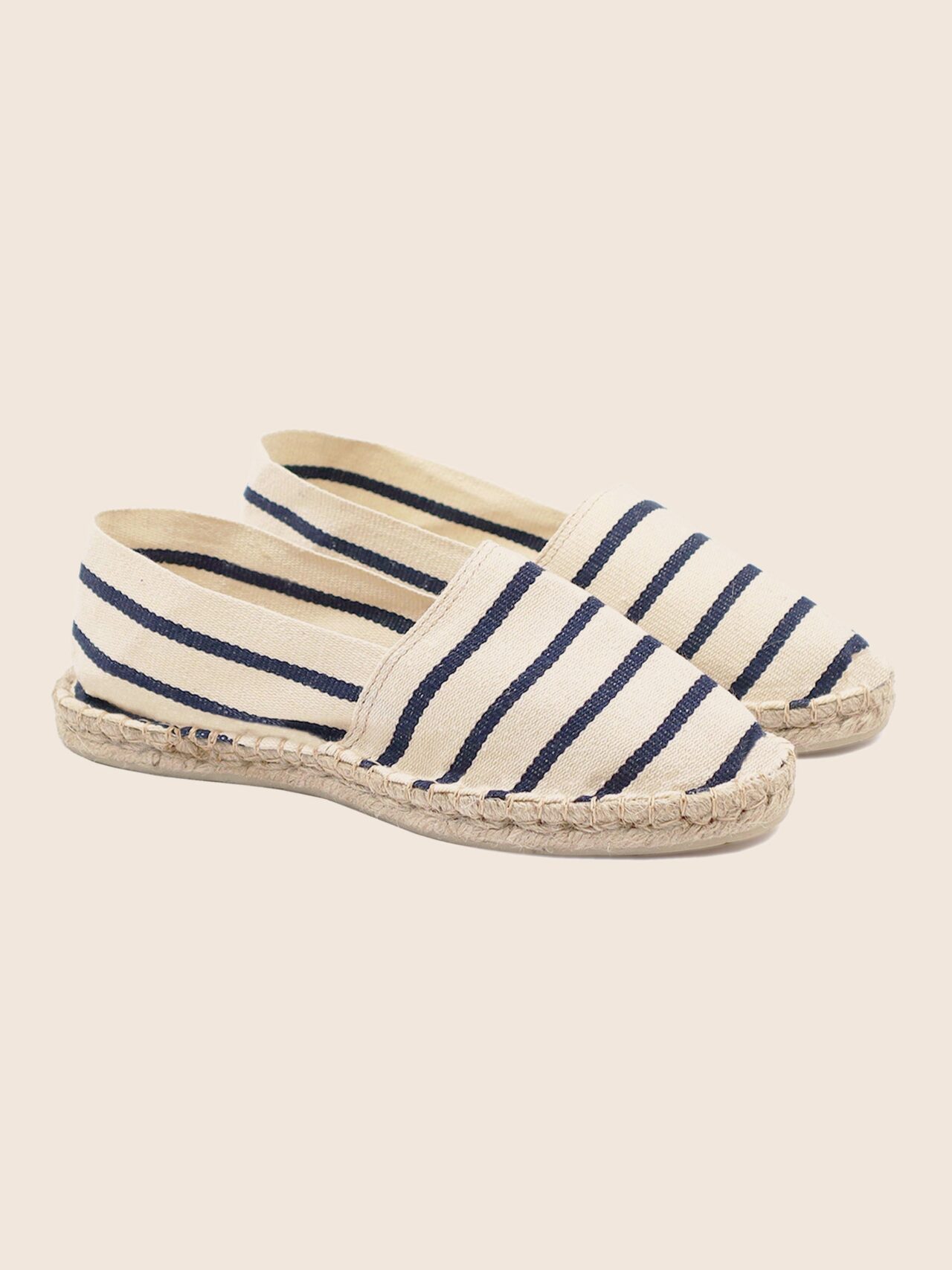 Espadrilles en toile coton blanc et bleu, fabriquées en France à Mauléon, au cœur du Pays Basque. Aussi appelées espadrilles basques ou espadrilles françaises artisanales, ces espadrilles unisexes perpétuent le savoir-faire traditionnel de la région. La toile se détend après quelques jours pour prendre la forme du pied. Espadrilles en toile coton blanc et bleu. Non doublé. Semelle intérieure jute 18 fils, semelle extérieure caoutchouc, épaisseur 2 cm. Surpiqûre beige. Étiquette discrète cousue sur la toile. 100 % fabriquées en France, à Mauléon (Pays Basque), dans un atelier artisanal familial. Couture du rebord à l'italienne, finition traditionnelle caractéristique. Livrées dans leur pochon en coton biologique certifié GOTS. Unisexe, disponible du 36 au 46. Pour ce modèle, prenez votre pointure habituelle. Si vous êtes entre 2 pointures, prenez la pointure supérieure. Si ce modèle vous serre, sachez que la toile se détend après quelques heures. Appliquez un imperméabilisant avant la première utilisation et nettoyez localement avec un chiffon et de l'eau légèrement savonneuse en cas de taches.