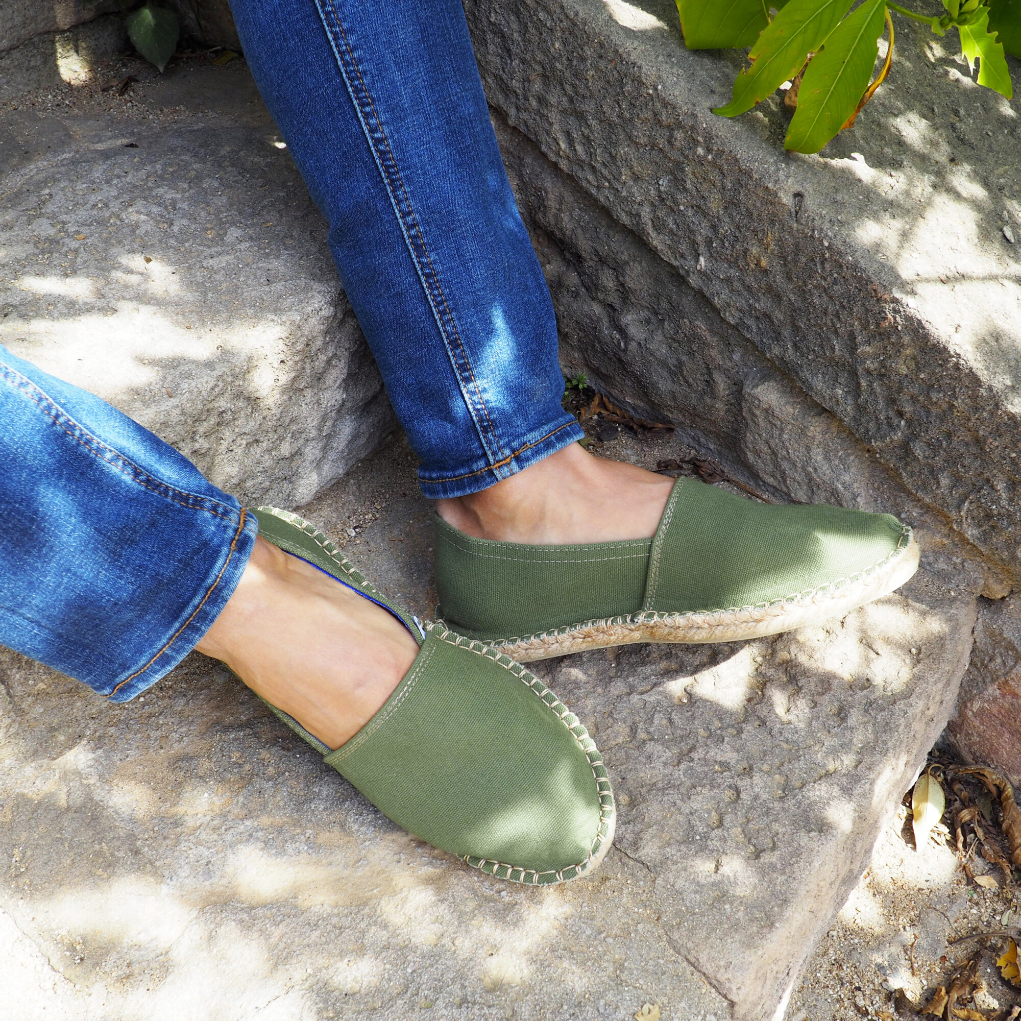 Espadrilles en toile coton recyclé kaki, fabriquées en France à Mauléon, au cœur du Pays Basque. Aussi appelées espadrilles éco-responsables ou espadrilles françaises recyclées, ces espadrilles unisexes en toile recyclée à 60 % perpétuent le savoir-faire artisanal basque. La toile se détend après quelques jours pour prendre la forme du pied. Espadrilles en toile coton recyclé kaki. Toile recyclée à 60 %. Liseré intérieur rayé bleu blanc rouge. Semelle intérieure jute, semelle extérieure caoutchouc rehaussée de jute naturelle d'Espagne. Épaisseur de la semelle 2 cm. 100 % fabriquées en France, à Mauléon (Pays Basque), dans un atelier artisanal familial. Livrées dans leur pochon en coton biologique certifié GOTS. Unisexe, disponible du 36 au 46. Pour ce modèle, prenez votre pointure habituelle. Si vous êtes entre 2 pointures, prenez la pointure supérieure. Si ce modèle vous serre, sachez que la toile se détend après quelques heures. Appliquez un imperméabilisant avant la première utilisation et nettoyez localement avec un chiffon et de l'eau légèrement savonneuse en cas de taches.