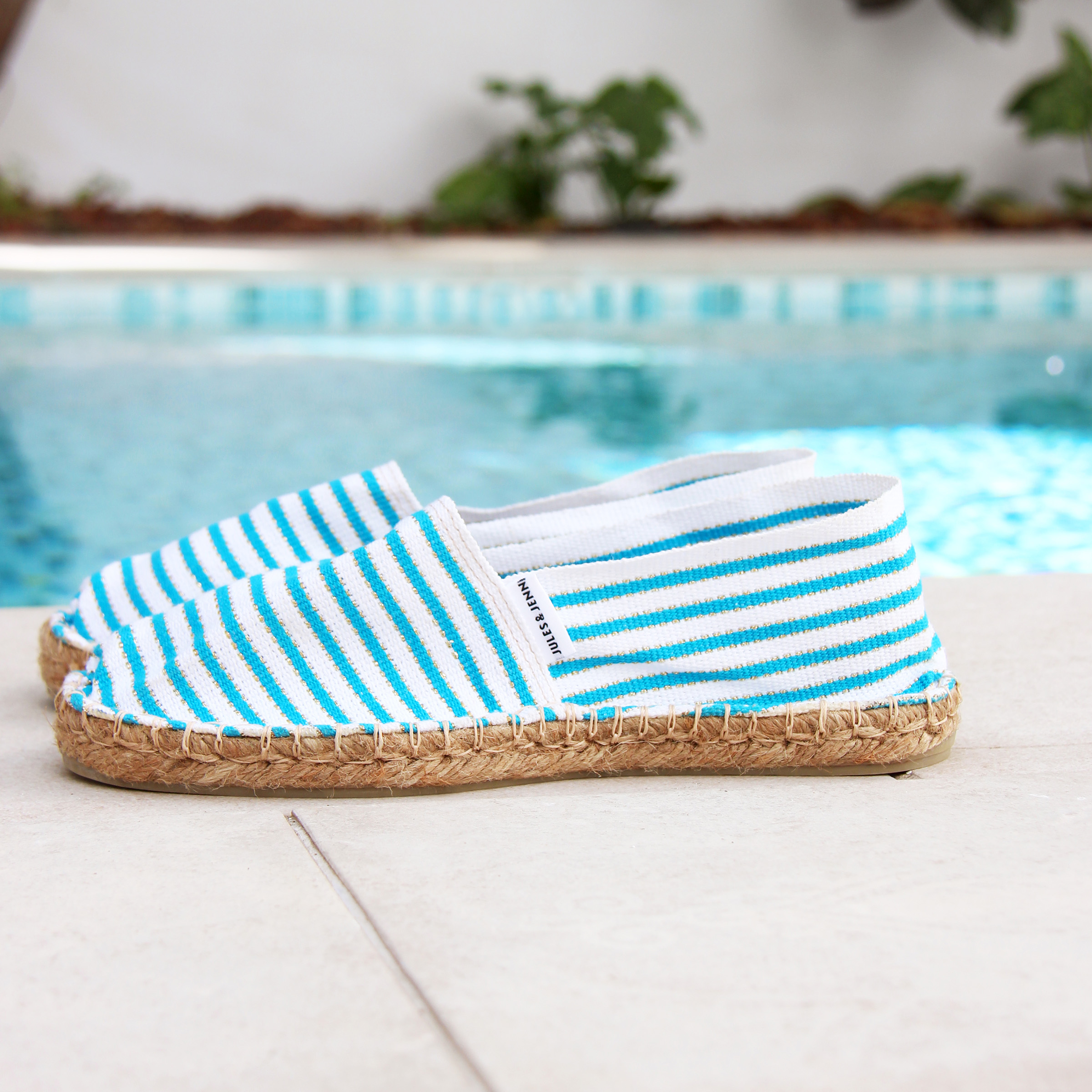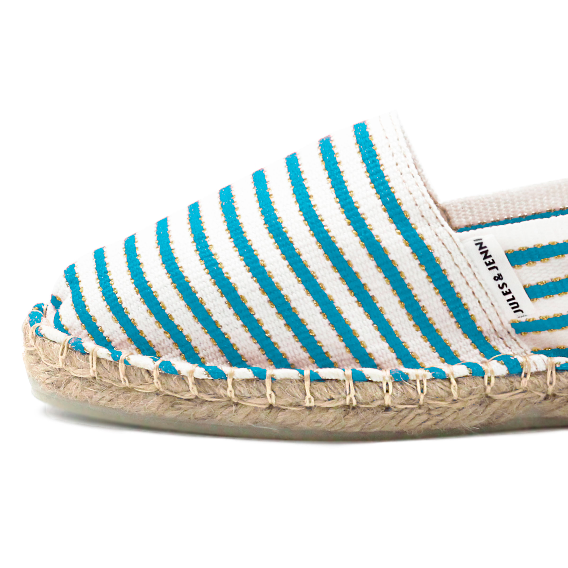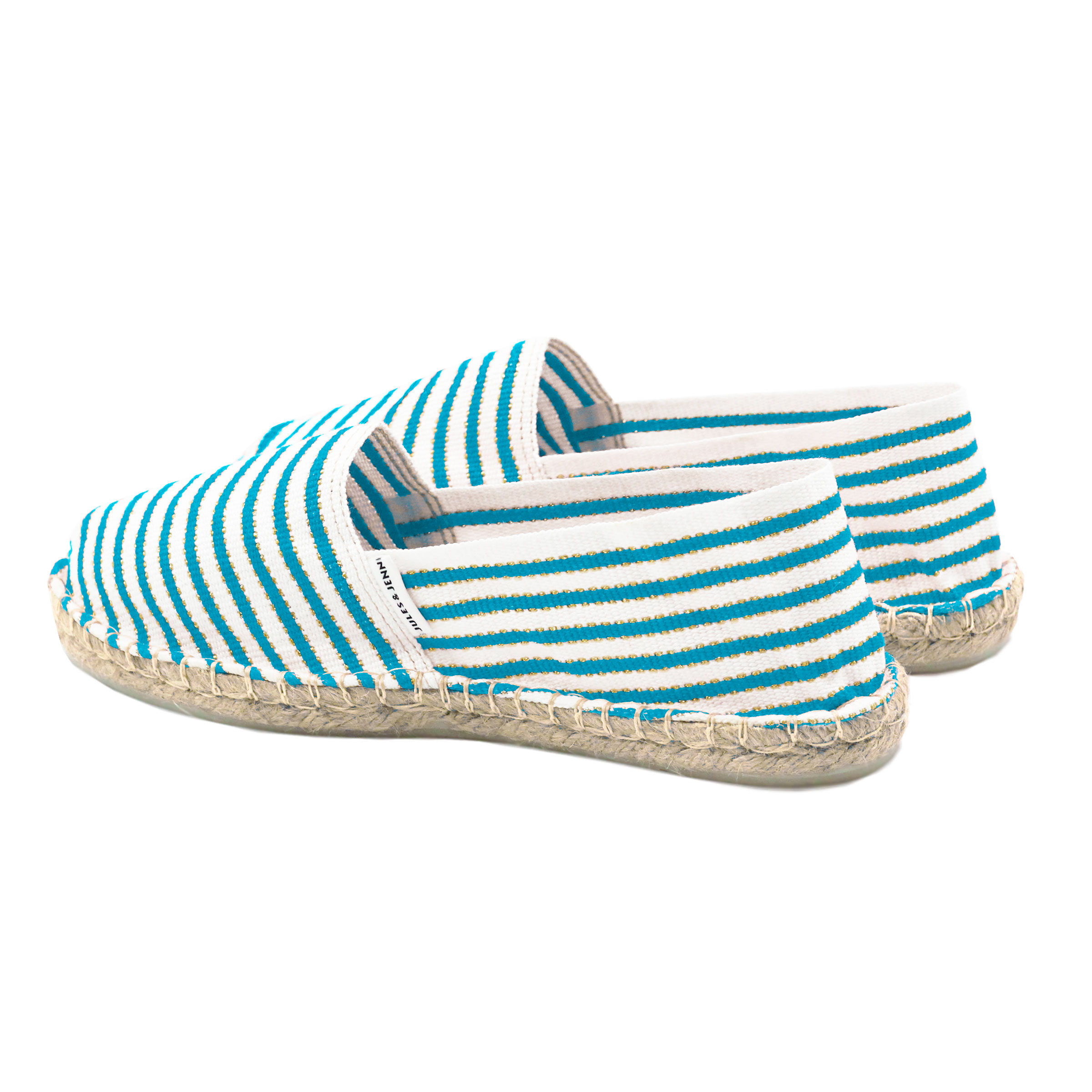 Espadrilles en toile coton turquoise et doré, fabriquées en France à Mauléon, au cœur du Pays Basque. Aussi appelées espadrilles basques ou espadrilles françaises artisanales, ces espadrilles unisexes perpétuent le savoir-faire traditionnel de la région. La toile se détend après quelques jours pour prendre la forme du pied. Espadrilles en toile coton turquoise et doré. Non doublé. Semelle intérieure jute 18 fils, semelle extérieure caoutchouc, épaisseur 2 cm. Surpiqûre beige. Étiquette discrète cousue sur la toile. 100 % fabriquées en France, à Mauléon (Pays Basque), dans un atelier artisanal familial. Couture du rebord à l'italienne, finition traditionnelle caractéristique. Livrées dans leur pochon en coton biologique certifié GOTS. Unisexe, disponible du 36 au 46. Pour ce modèle, prenez votre pointure habituelle. Si vous êtes entre 2 pointures, prenez la pointure supérieure. Si ce modèle vous serre, sachez que la toile se détend après quelques heures. Appliquez un imperméabilisant avant la première utilisation et nettoyez localement avec un chiffon et de l'eau légèrement savonneuse en cas de taches.