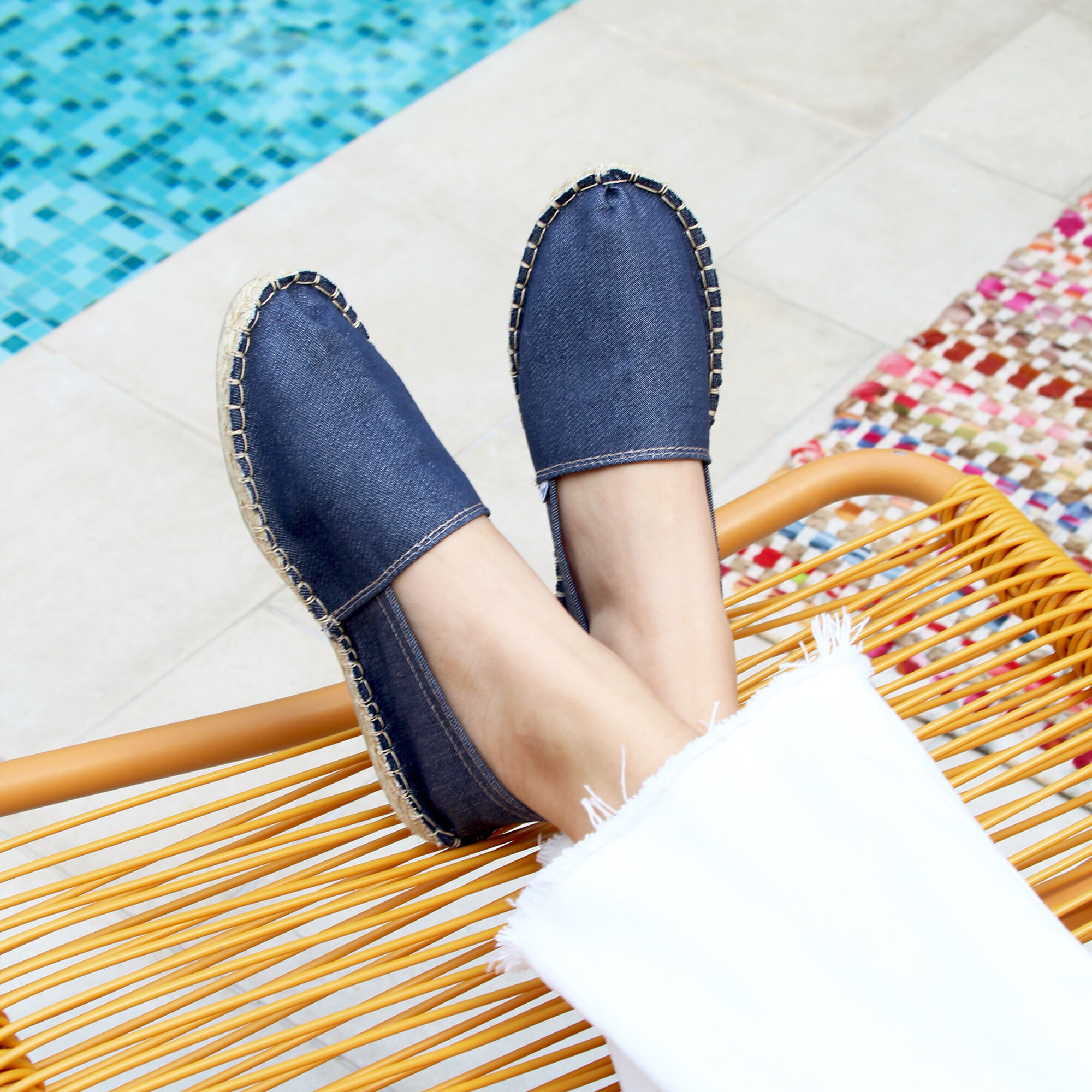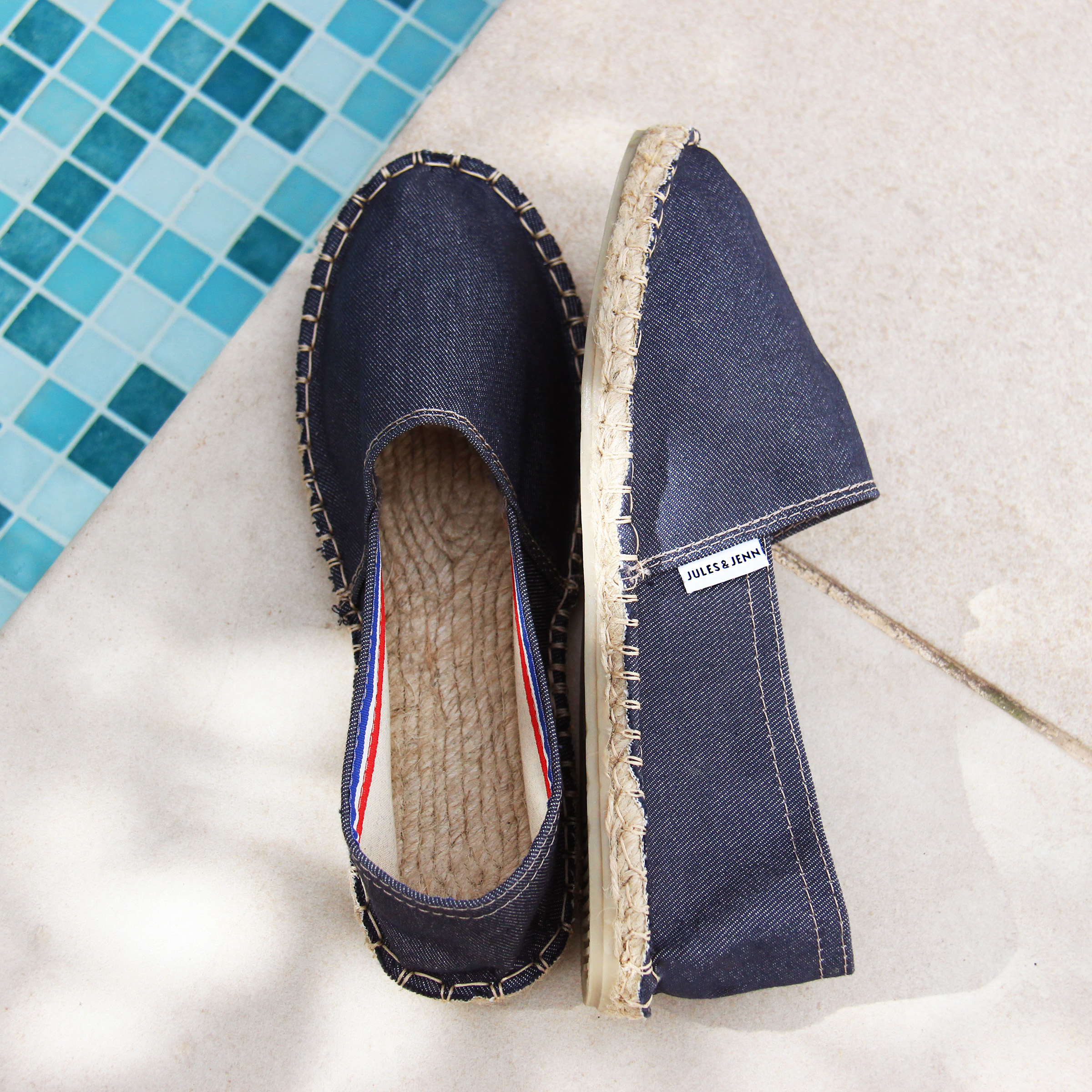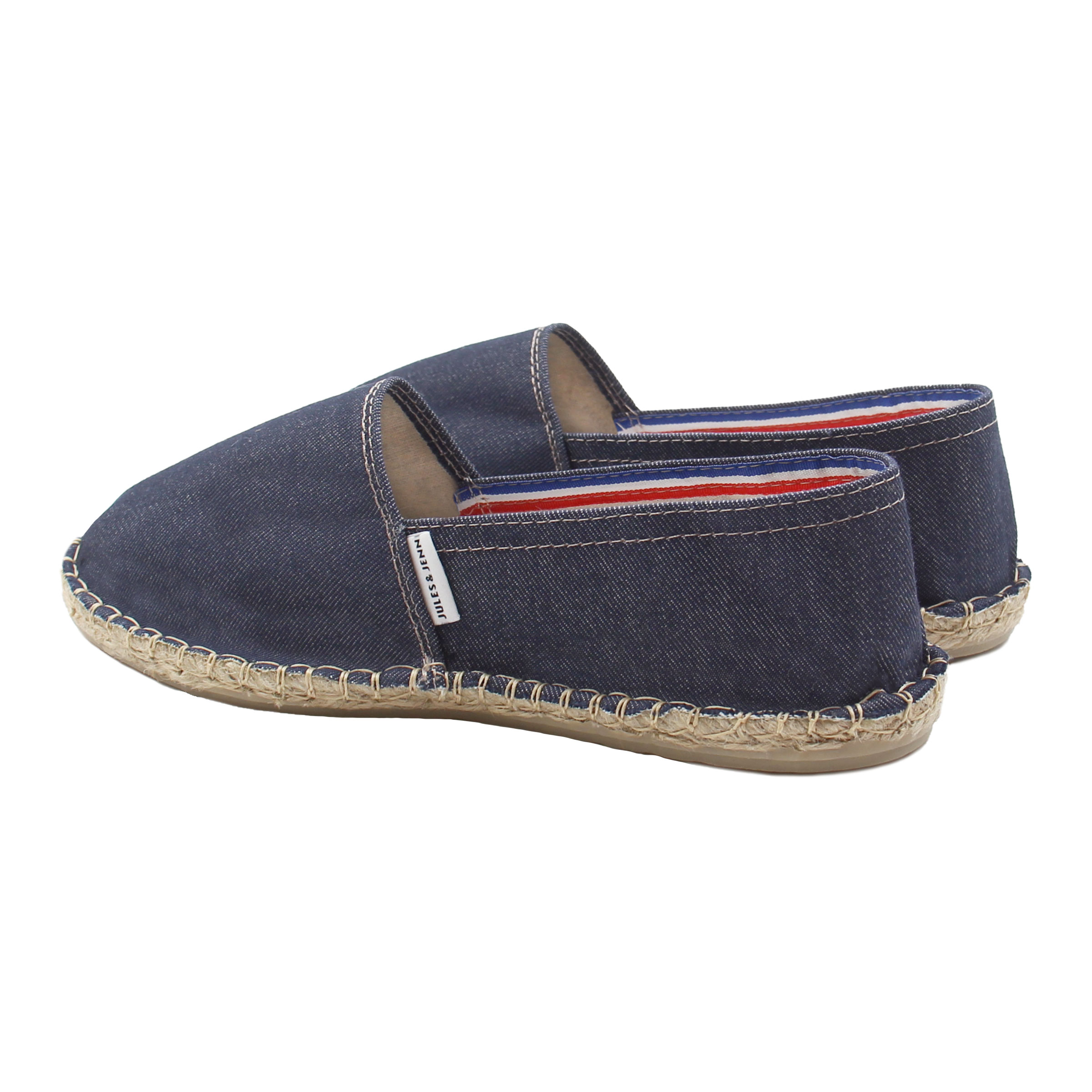 Espadrilles en toile de jean bleu, fabriquées en France à Mauléon, au cœur du Pays Basque. Aussi appelées espadrilles basques ou espadrilles françaises, ces espadrilles unisexes perpétuent le savoir-faire artisanal traditionnel de la région. La toile se détend après quelques jours pour prendre la forme du pied. Espadrilles en toile de jean bleu. Doublure coton. Semelle intérieure jute 18 fils, semelle extérieure caoutchouc, épaisseur 2 cm. Surpiqûre beige. Étiquette discrète cousue sur la toile. 100 % fabriquées en France, à Mauléon (Pays Basque), dans un atelier artisanal familial. Couture du rebord à l'italienne, finition traditionnelle caractéristique. Livrées dans leur pochon en coton biologique certifié GOTS. Unisexe, disponible du 36 au 46. Pour ce modèle, prenez votre pointure habituelle. Si vous êtes entre 2 pointures, prenez la pointure supérieure. Appliquez un imperméabilisant avant la première utilisation et nettoyez localement avec un chiffon et de l'eau légèrement savonneuse en cas de taches.