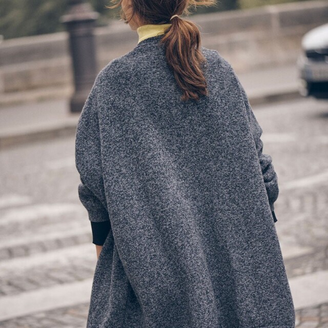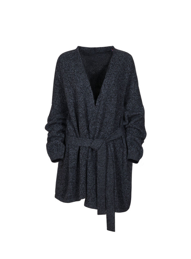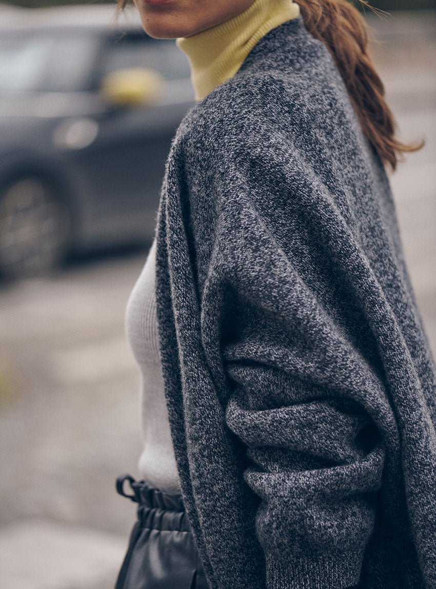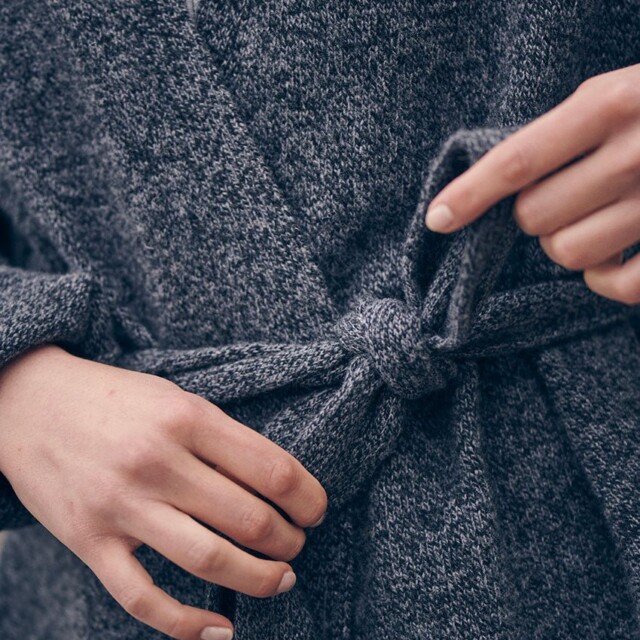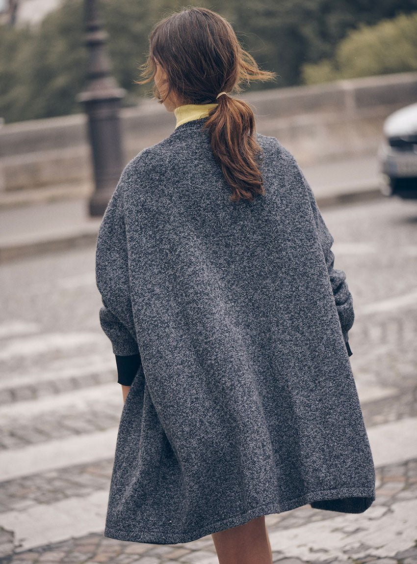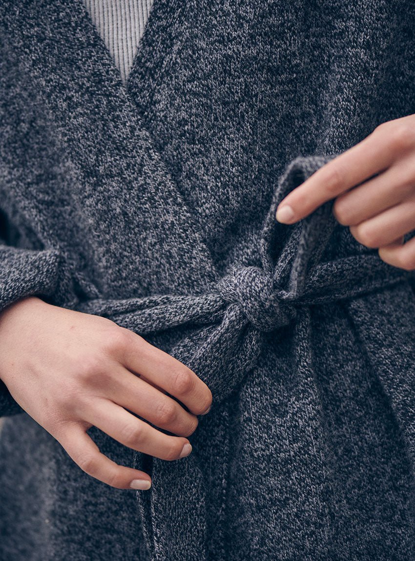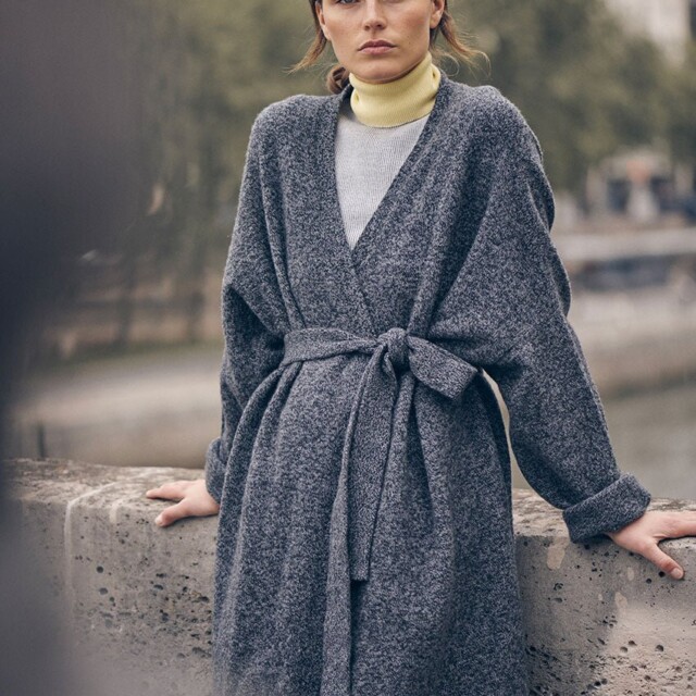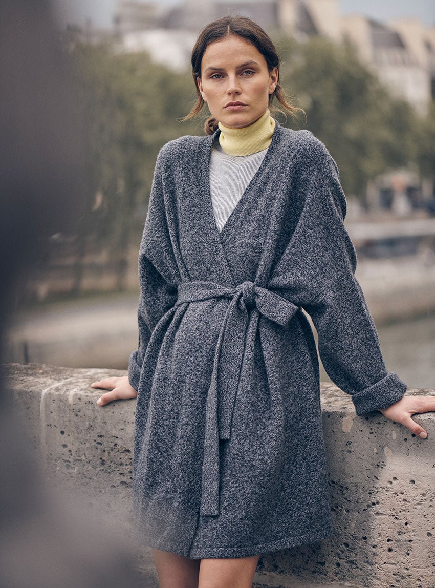 Le gilet Axelle en gris mouliné adopte une allure longue et épurée façon kimono. Tricoté en maille jersey de laine, avec emmanchures descendues, encolure en V et ceinture à passants, il offre un tombé fluide et un confort optimal. Une pièce élégante et polyvalente, parfaite pour superposer vos tenues avec style.