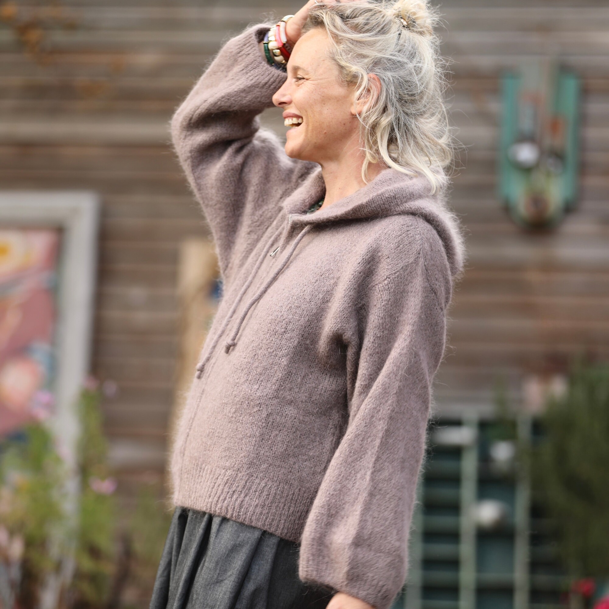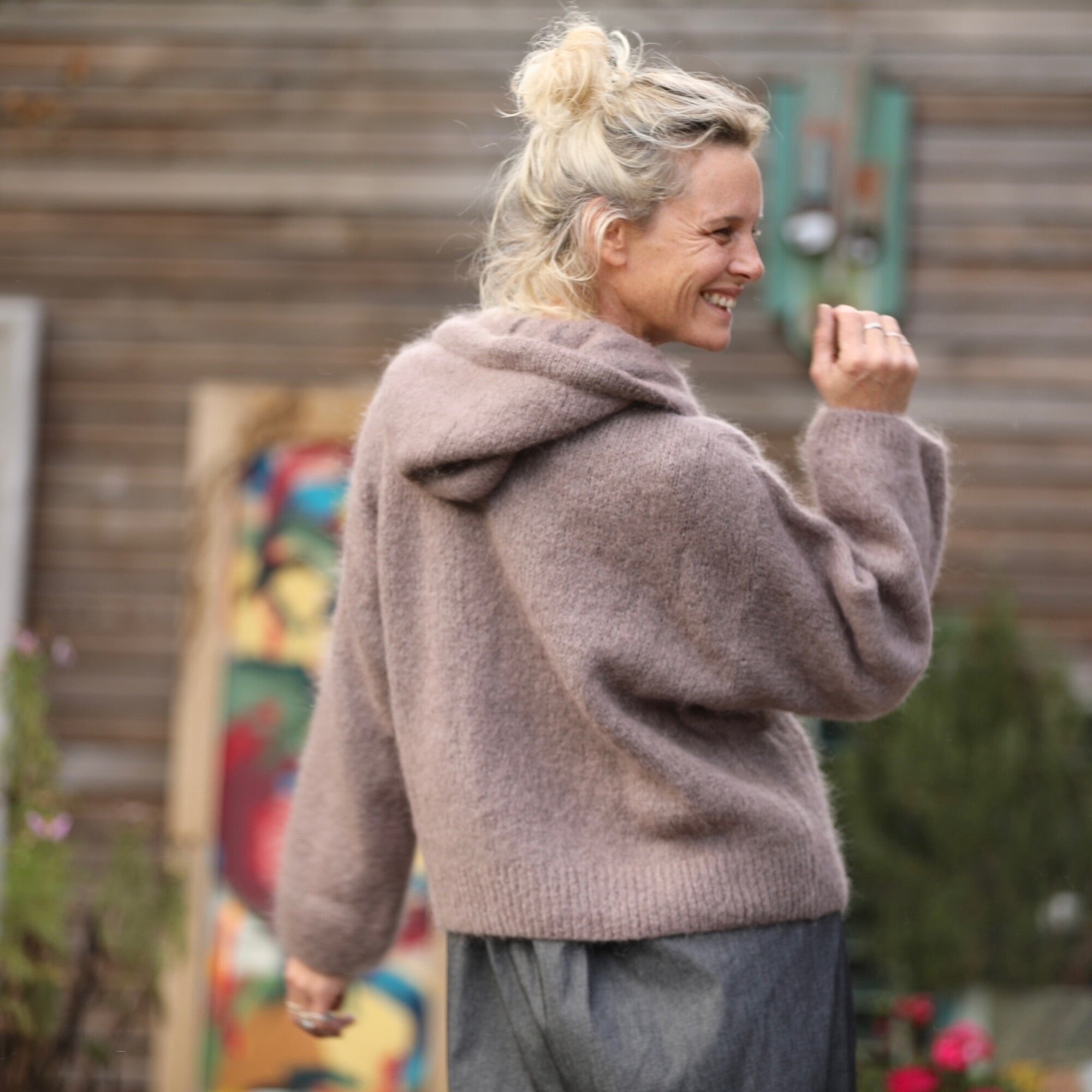 Tulia est un gilet ample et enveloppant, inspiré du pull Calypso mais revisité avec des manches longues et une ouverture zippée sur le devant. Il conserve la douceur et le confort caractéristiques de la maille Calypso, tout en offrant une allure plus structurée et pratique.