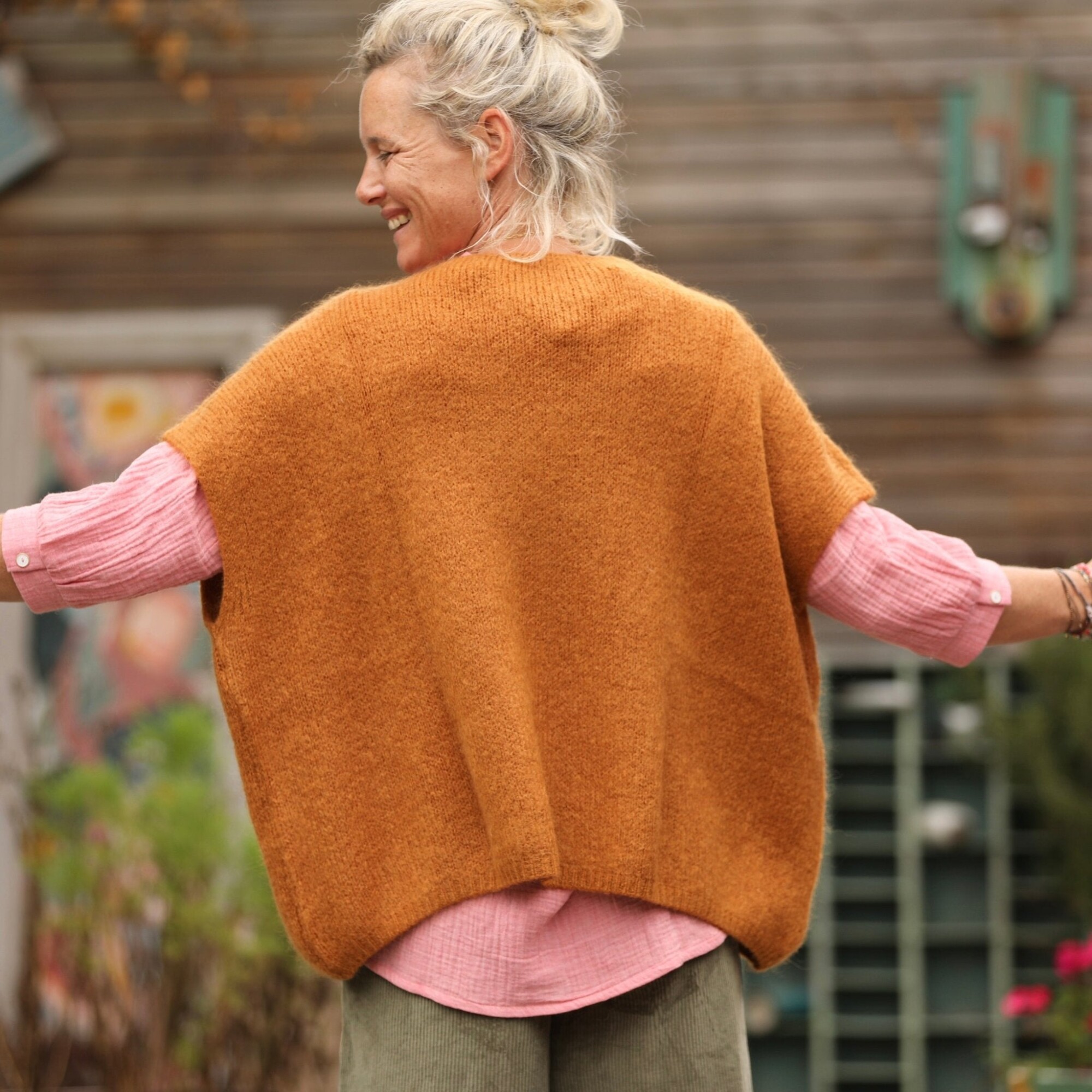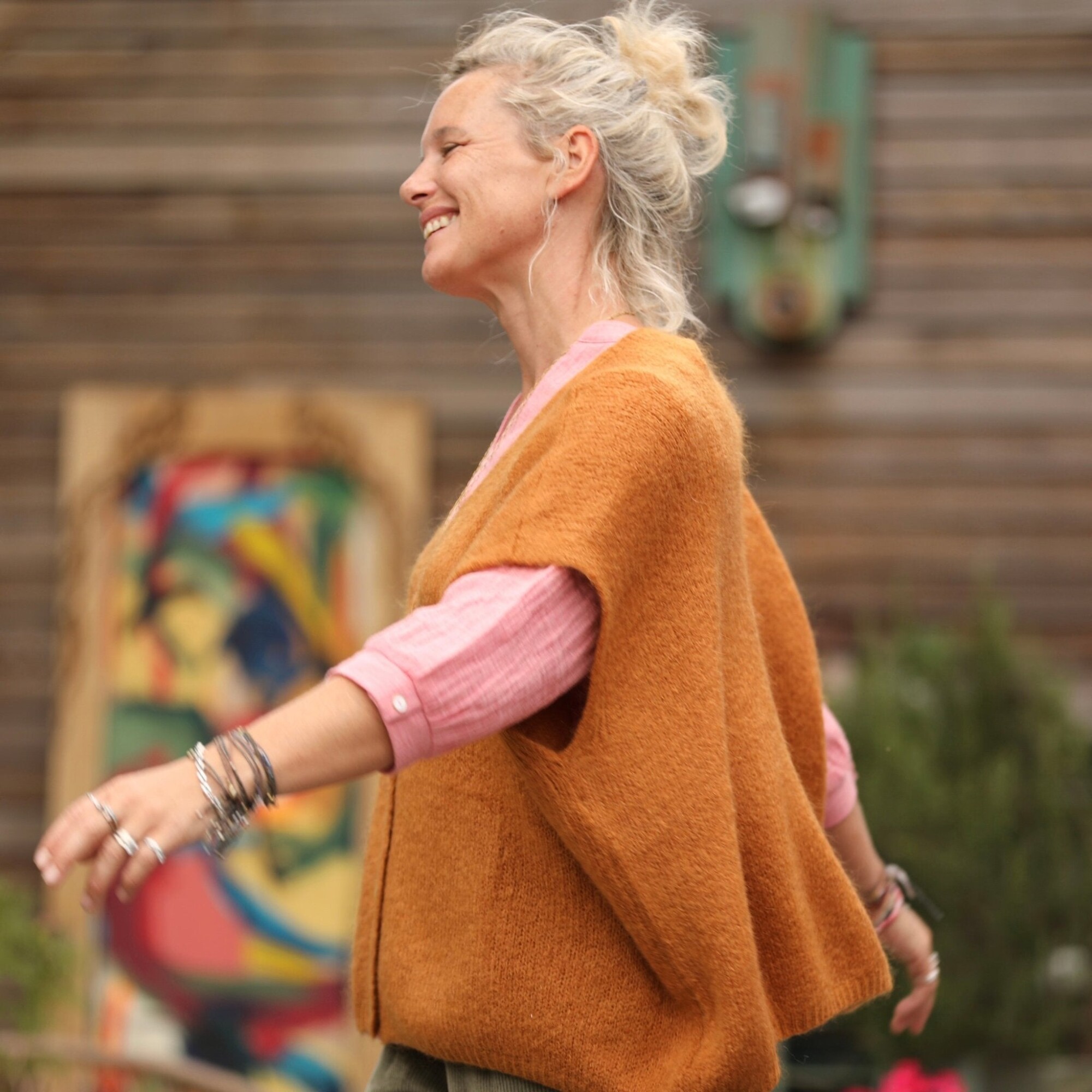 Claudia, un gilet enveloppant et rassurant, conçu en Italie pour ses lignes généreuses et son esprit décontracté. Disponible en taille unique, il s’adapte avec élégance à toutes les silhouettes, du XS au XXL, grâce à sa coupe ample qui marie confort et style sans compromis.