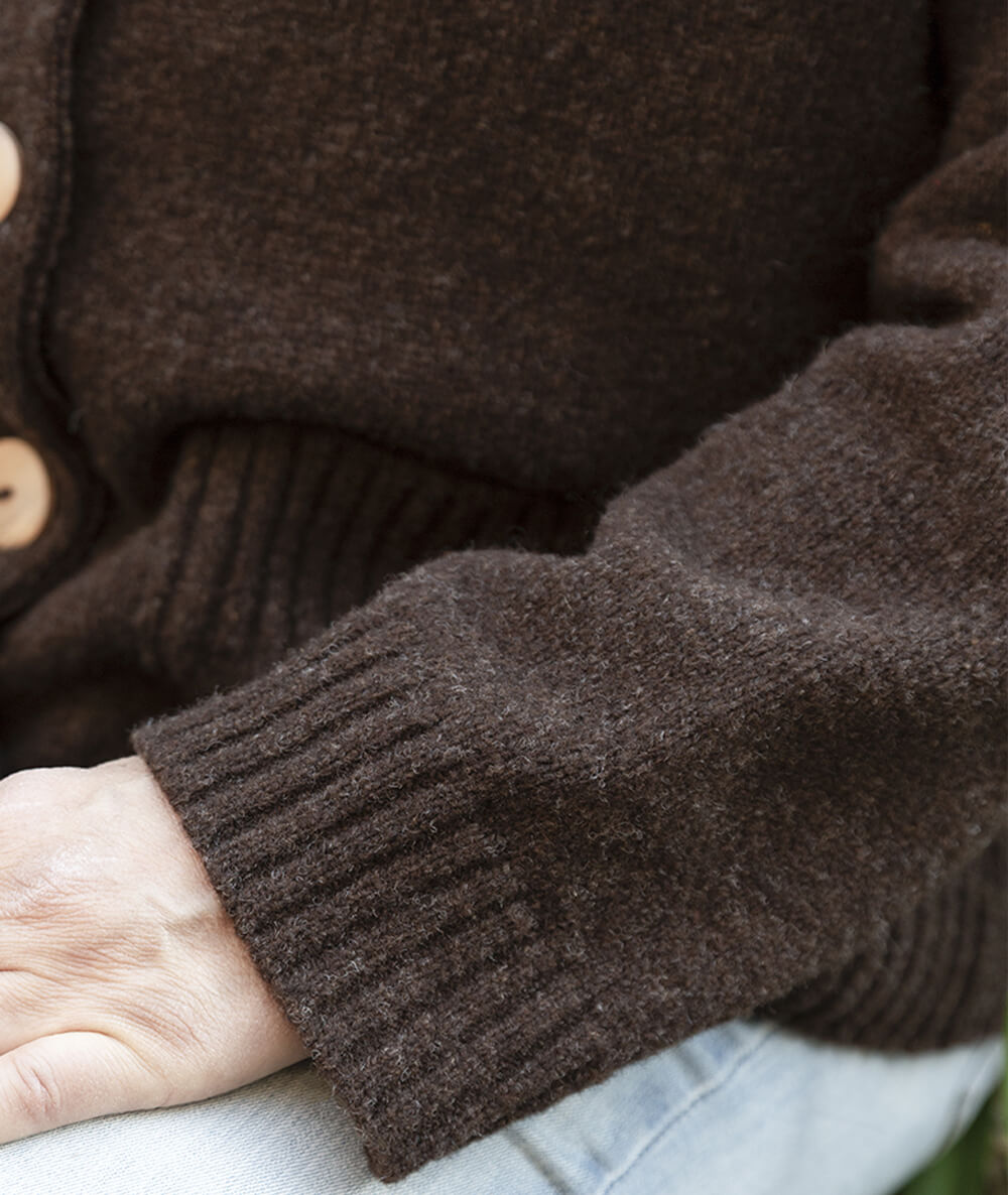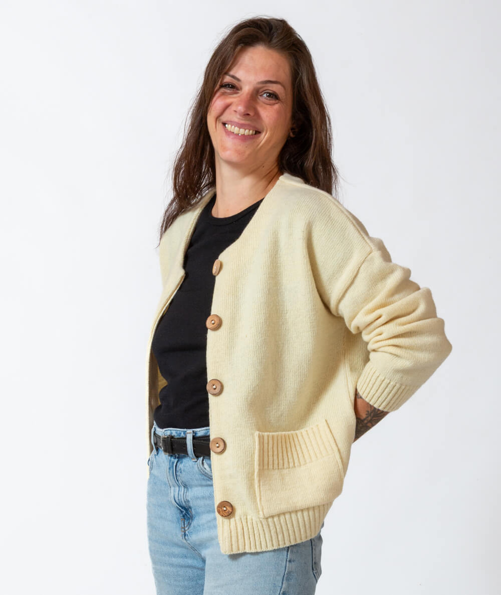 Maille jersey, coupe droite, manches basses, poches jersey et côtes devant, boutons en bois d'olivier.