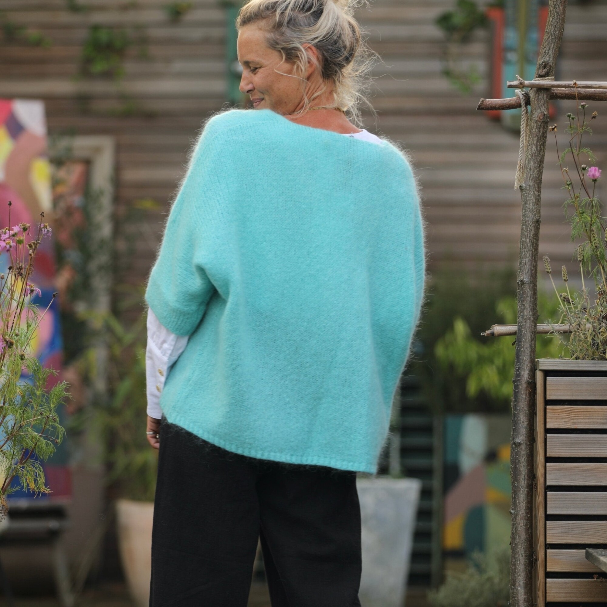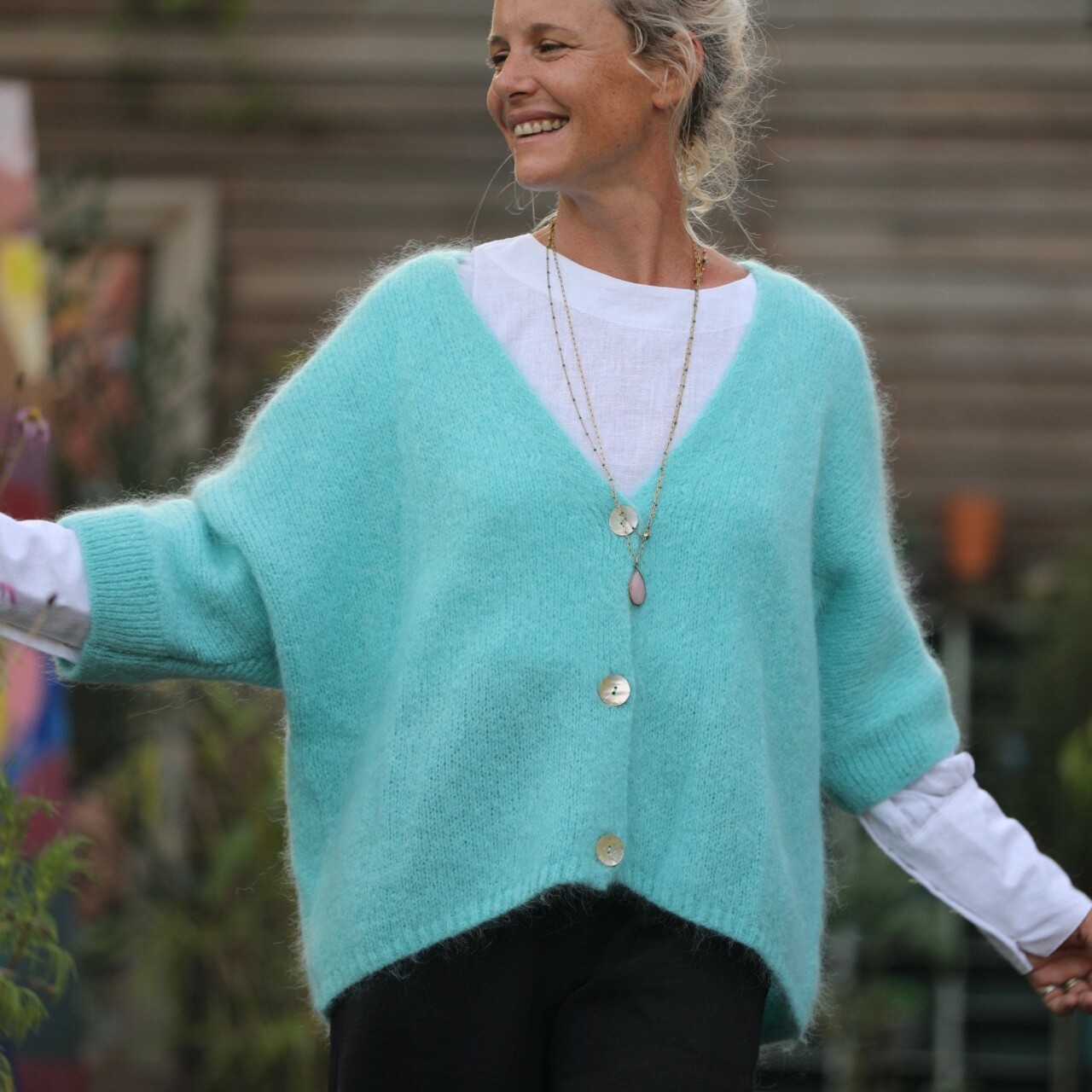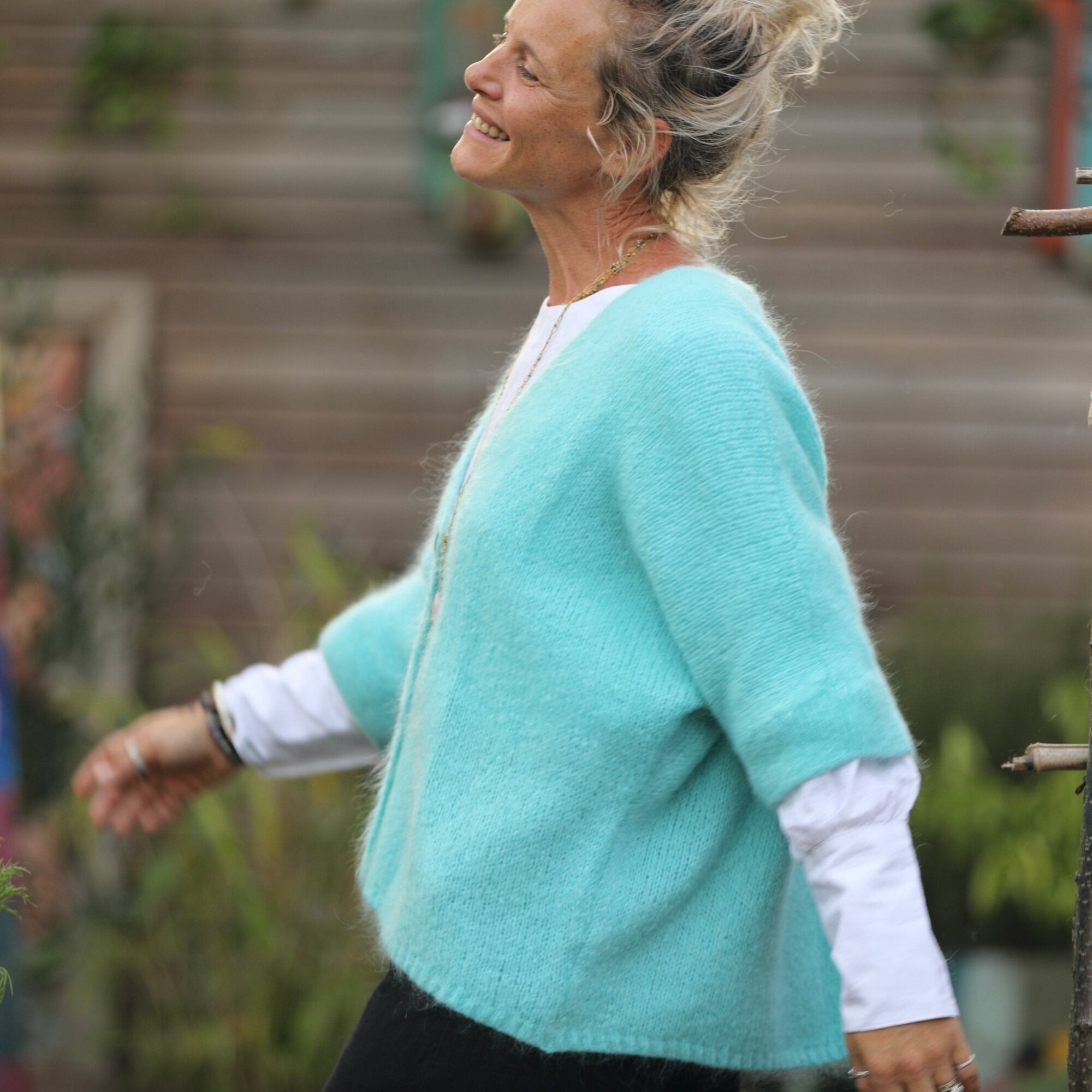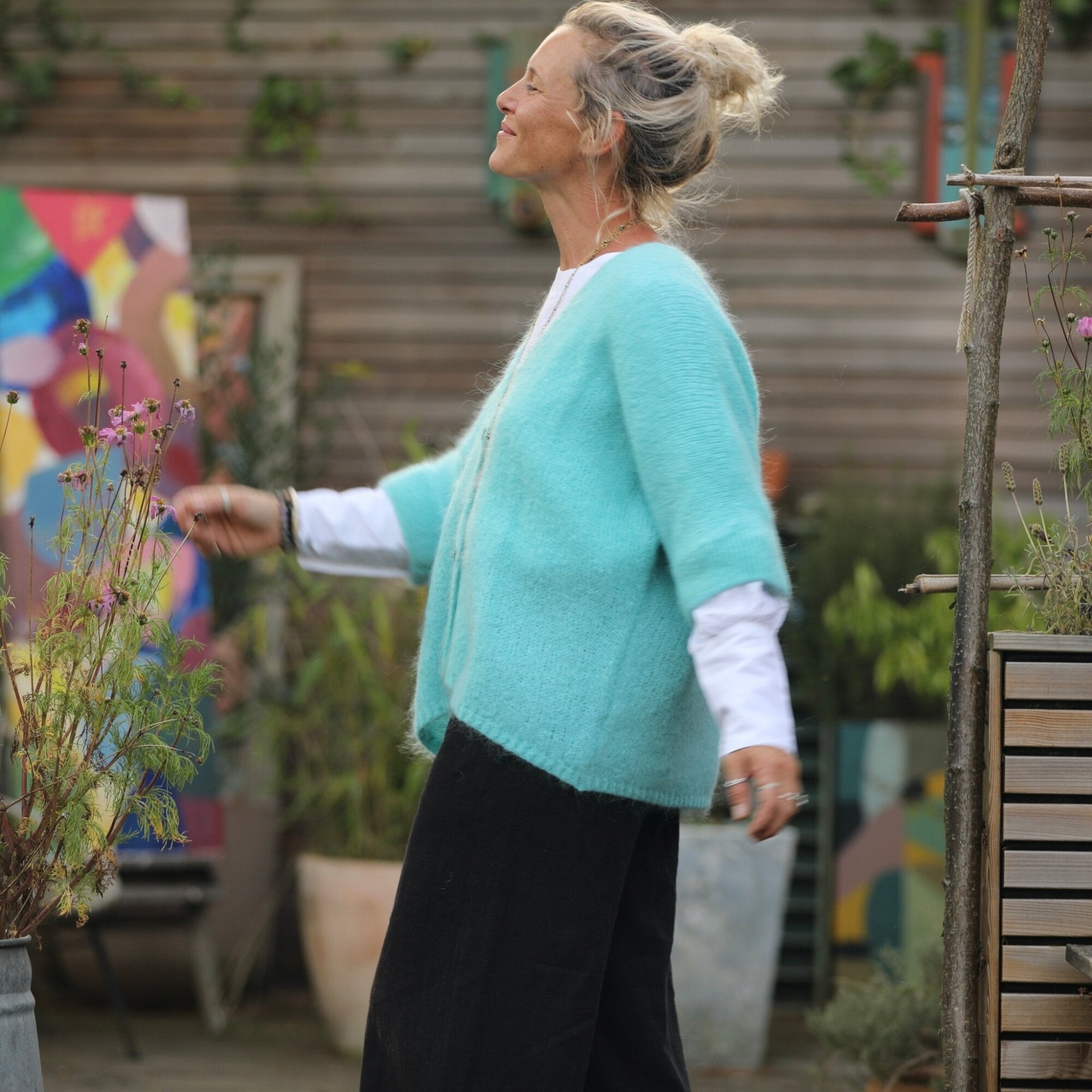 Voici Hana, un gilet à manches kimono doté de manches mi-longues. Il se ferme élégamment avec trois boutons de nacre.