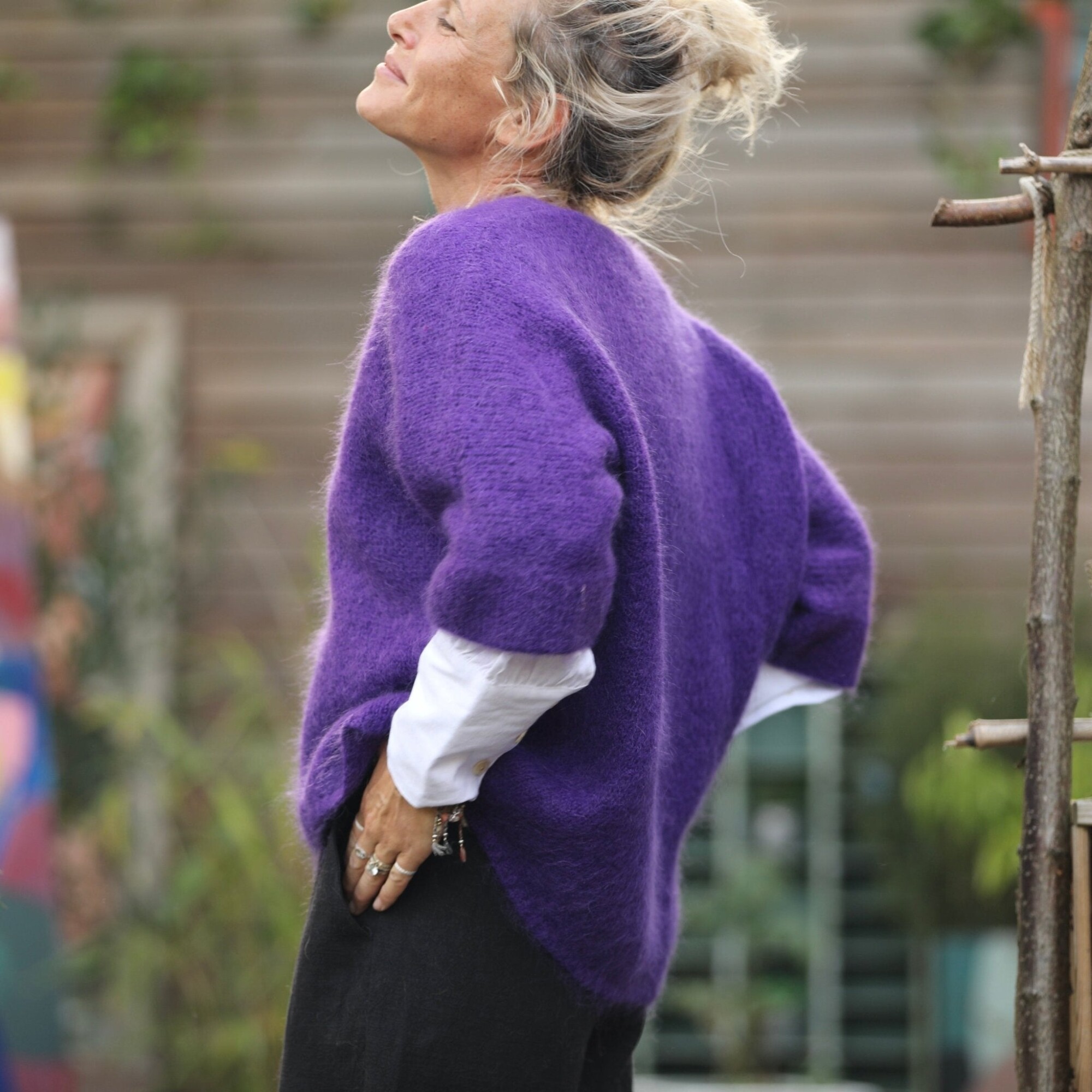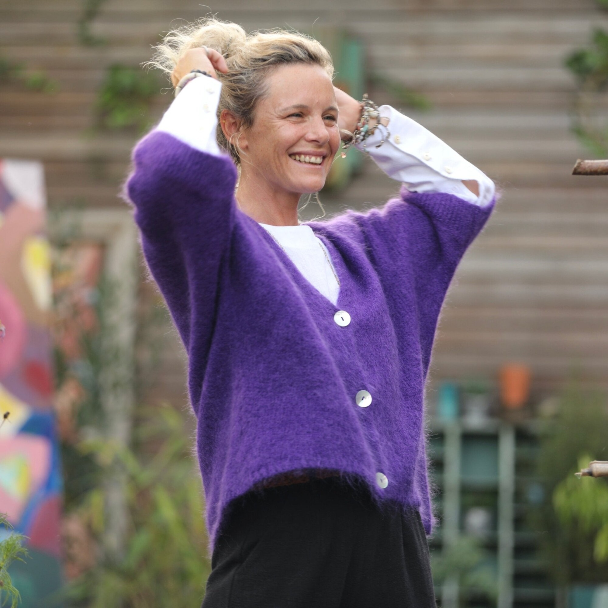 Voici Hana, un gilet à manches kimono doté de manches mi-longues. Il se ferme élégamment avec trois boutons de nacre.