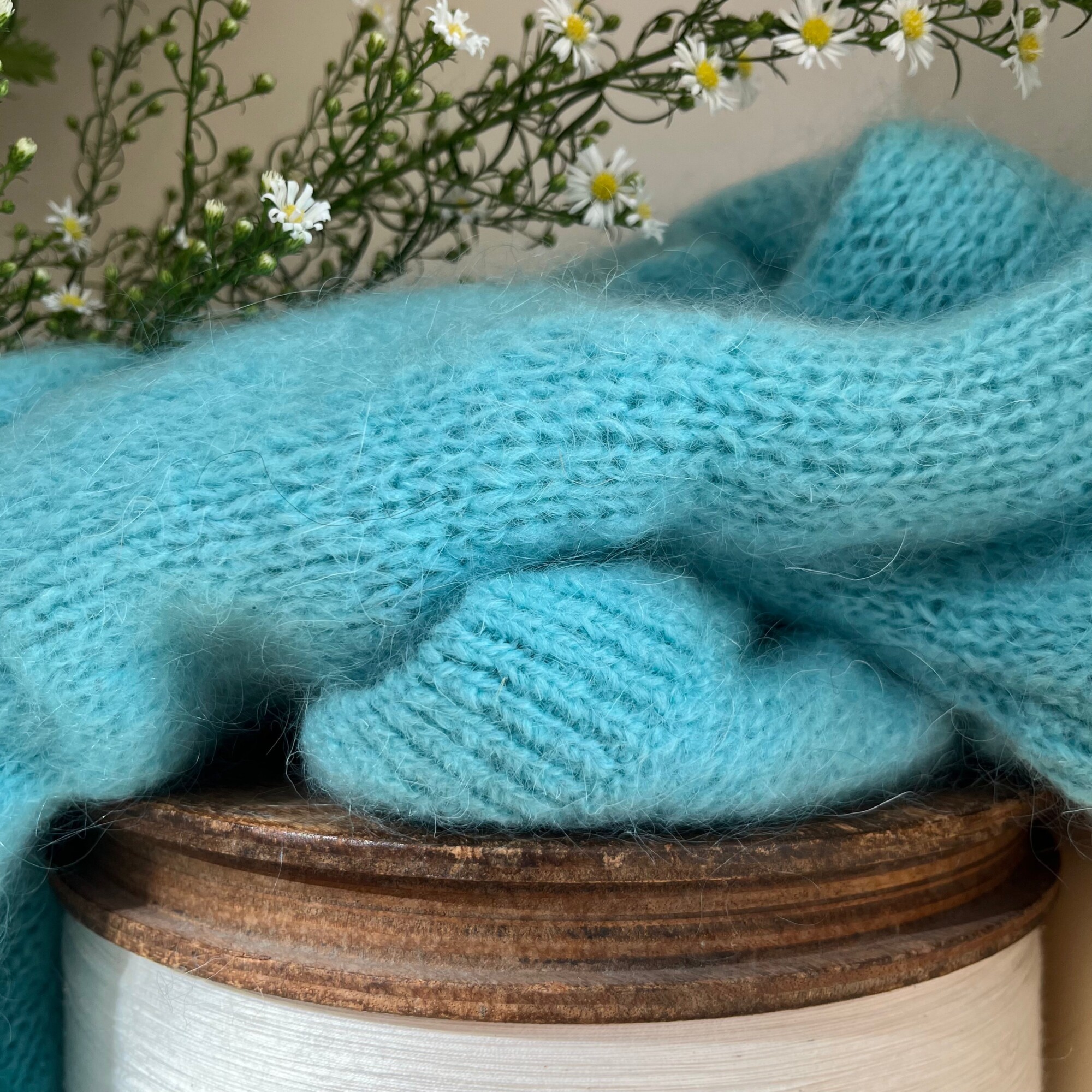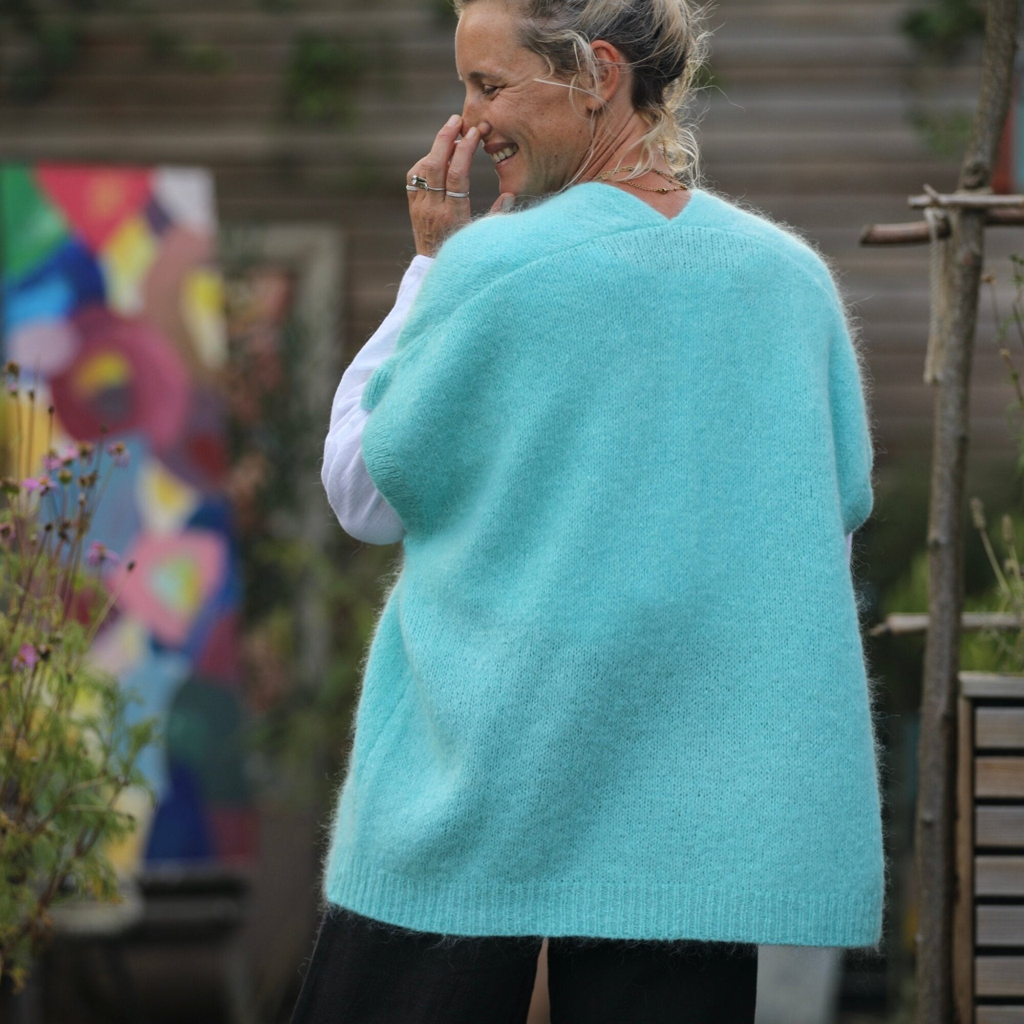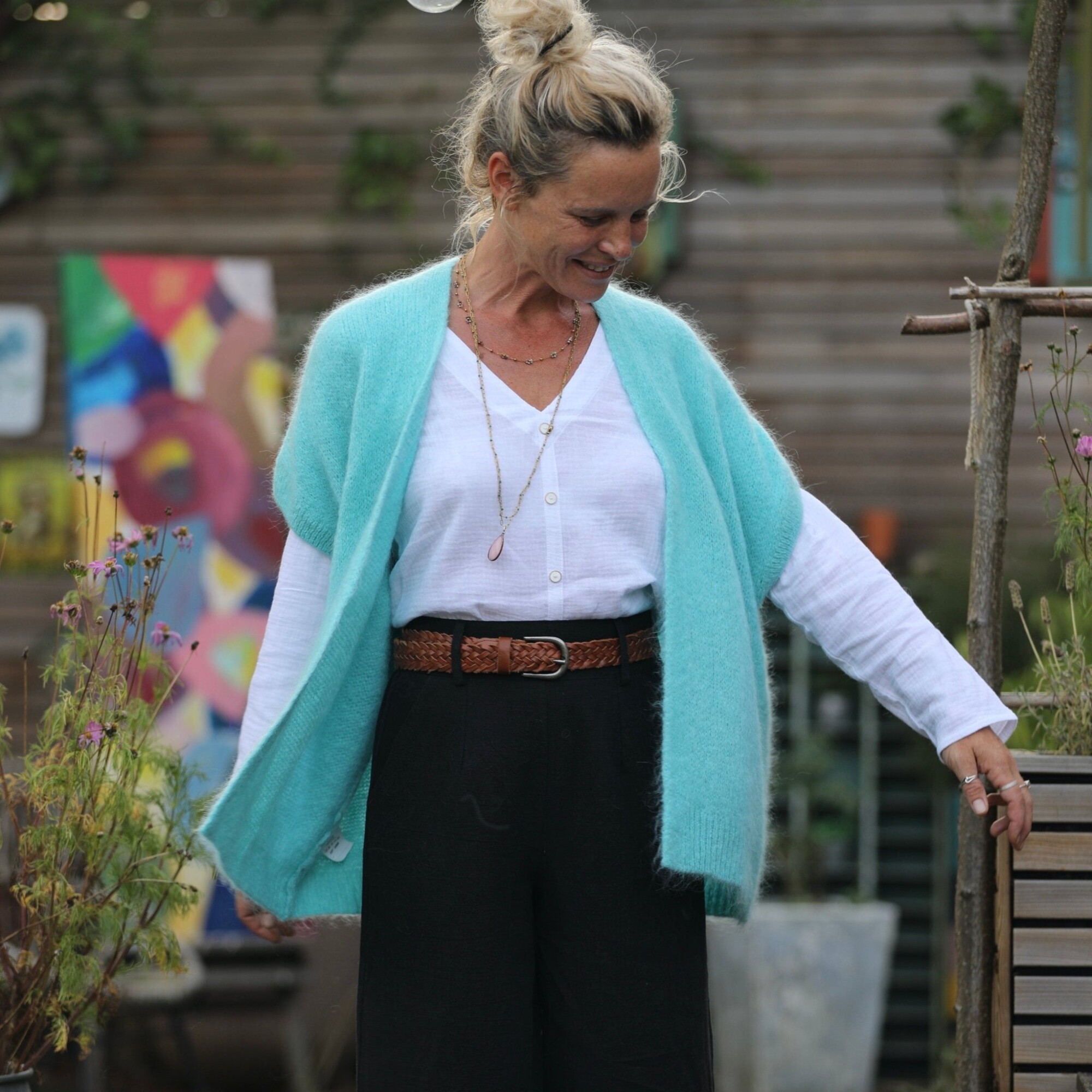 Mireille est un gilet-cape conçu pour être porté par-dessus une tenue. Avec ses manches courtes, il met en valeur les manches d'une blouse ou d'une robe, et peut être superposé pour ajouter une touche de chaleur.