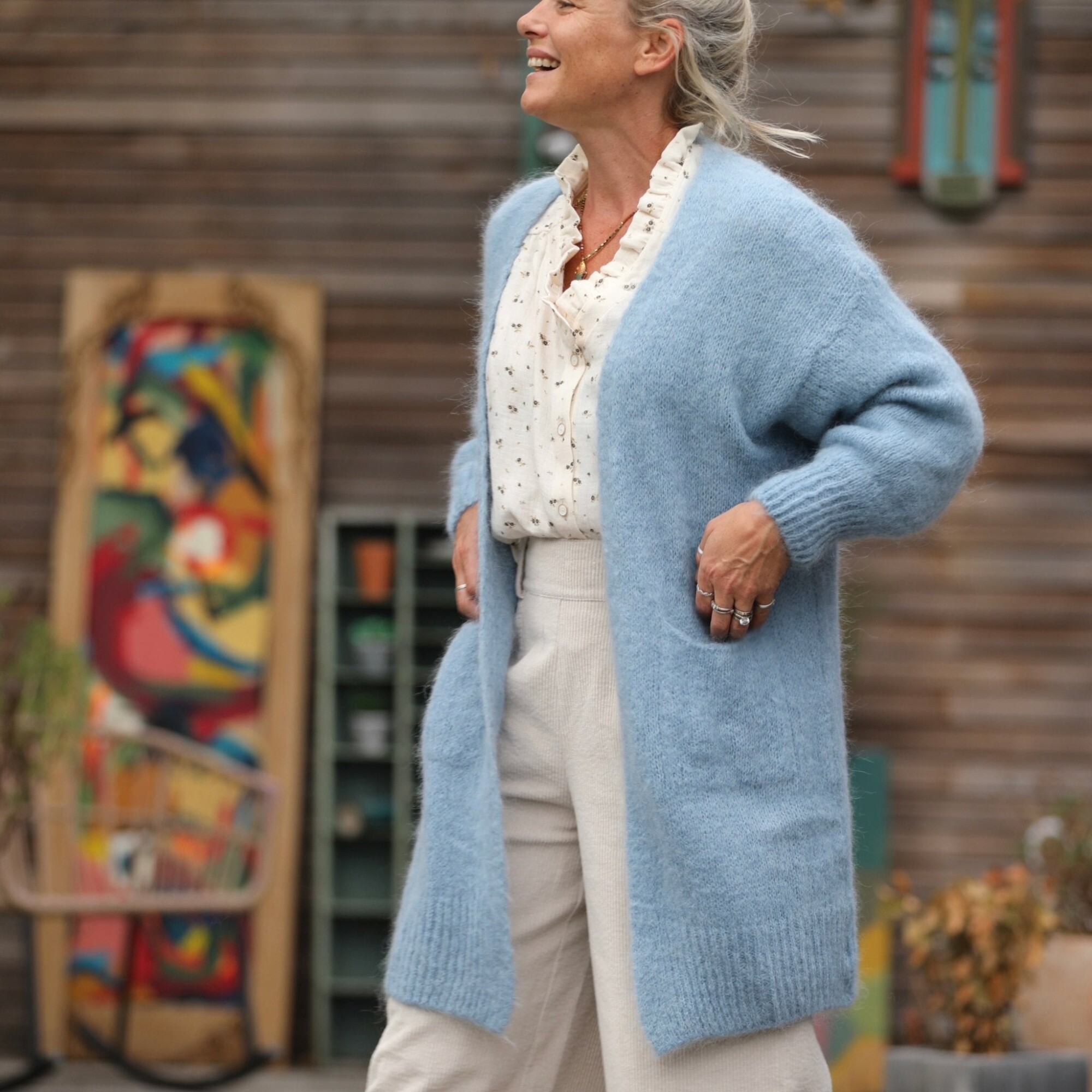 Naïs – Gilet mi-long enveloppant, fabriqué en Italie. Ses lignes généreuses et son allure décontractée en font une pièce facile à porter au quotidien.