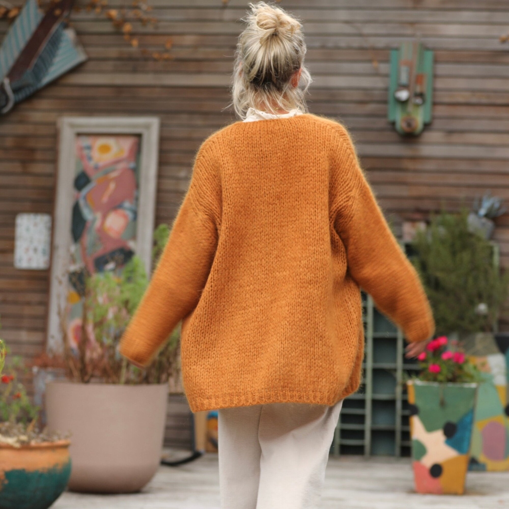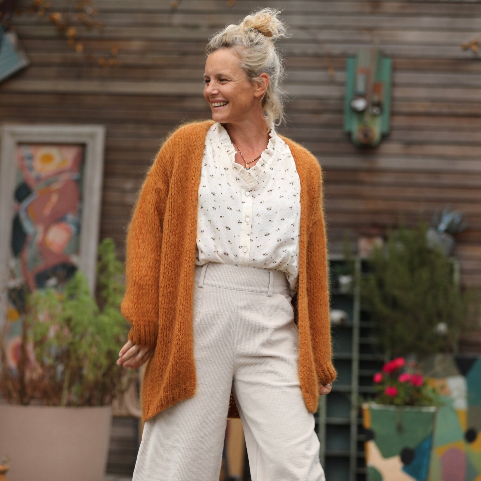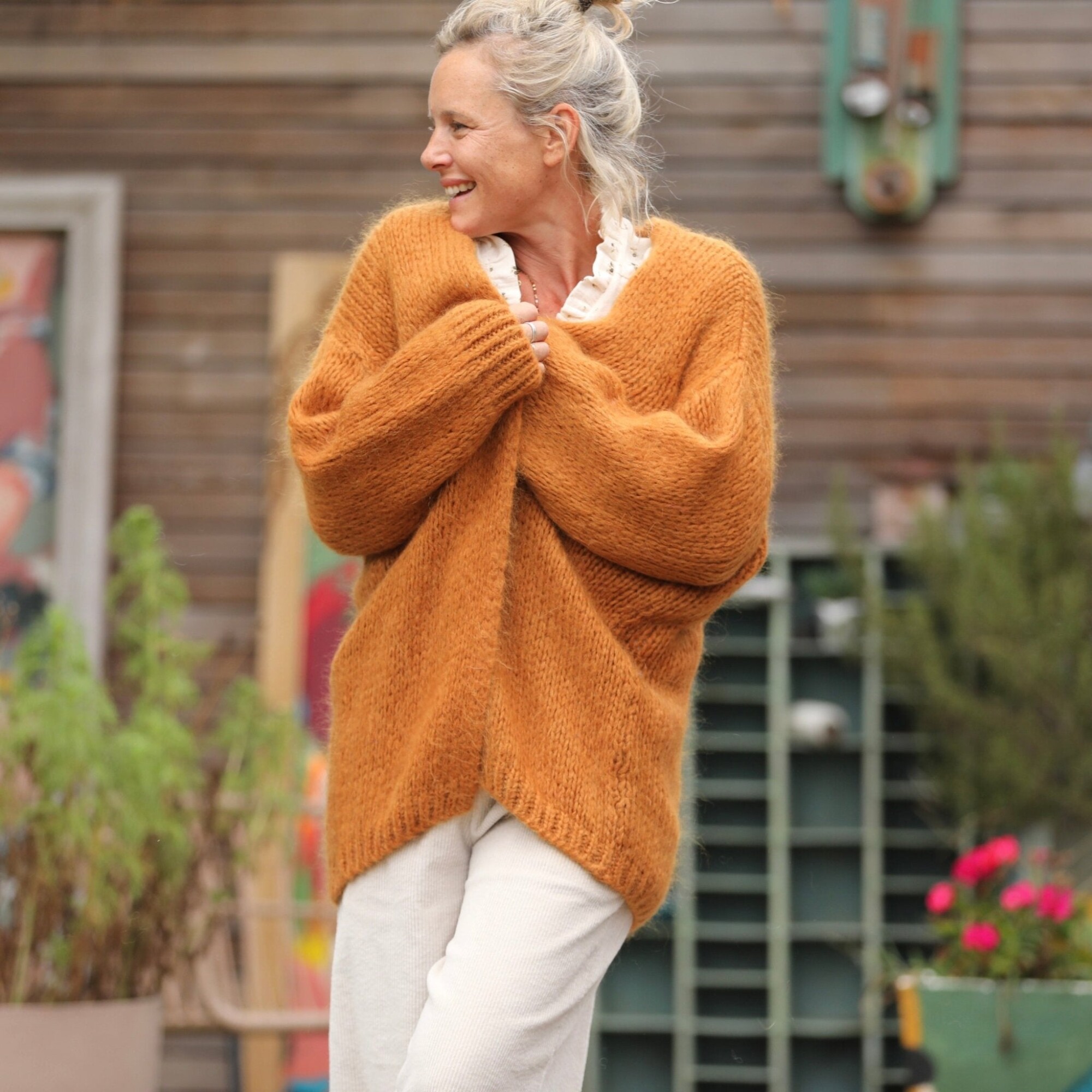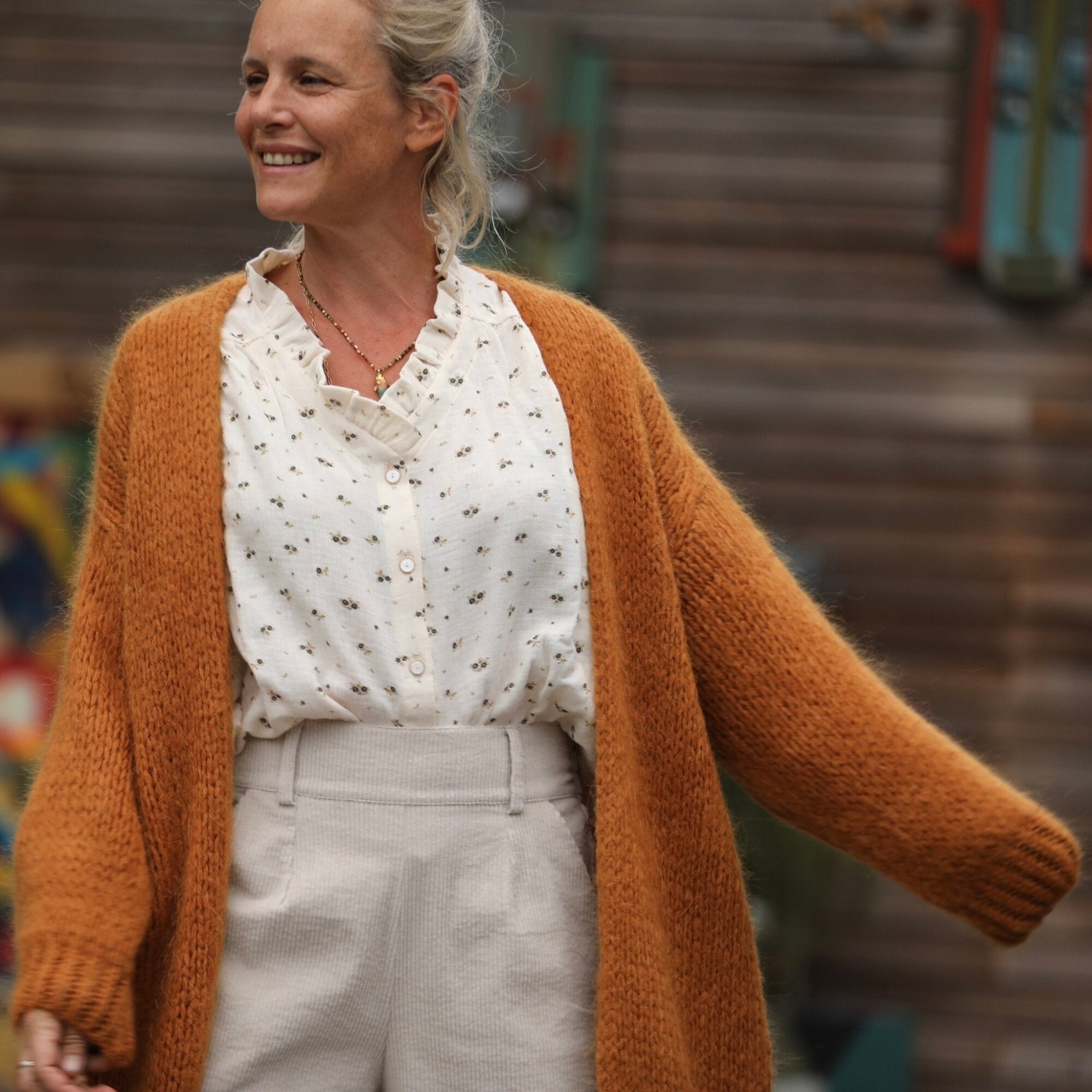 Voici Prisca,. Tricoté dans une maille large et généreuse, ce pull offre un tombé lourd et rassurant : il enveloppe sans serrer, apporte une chaleur diffuse et une présence douce.