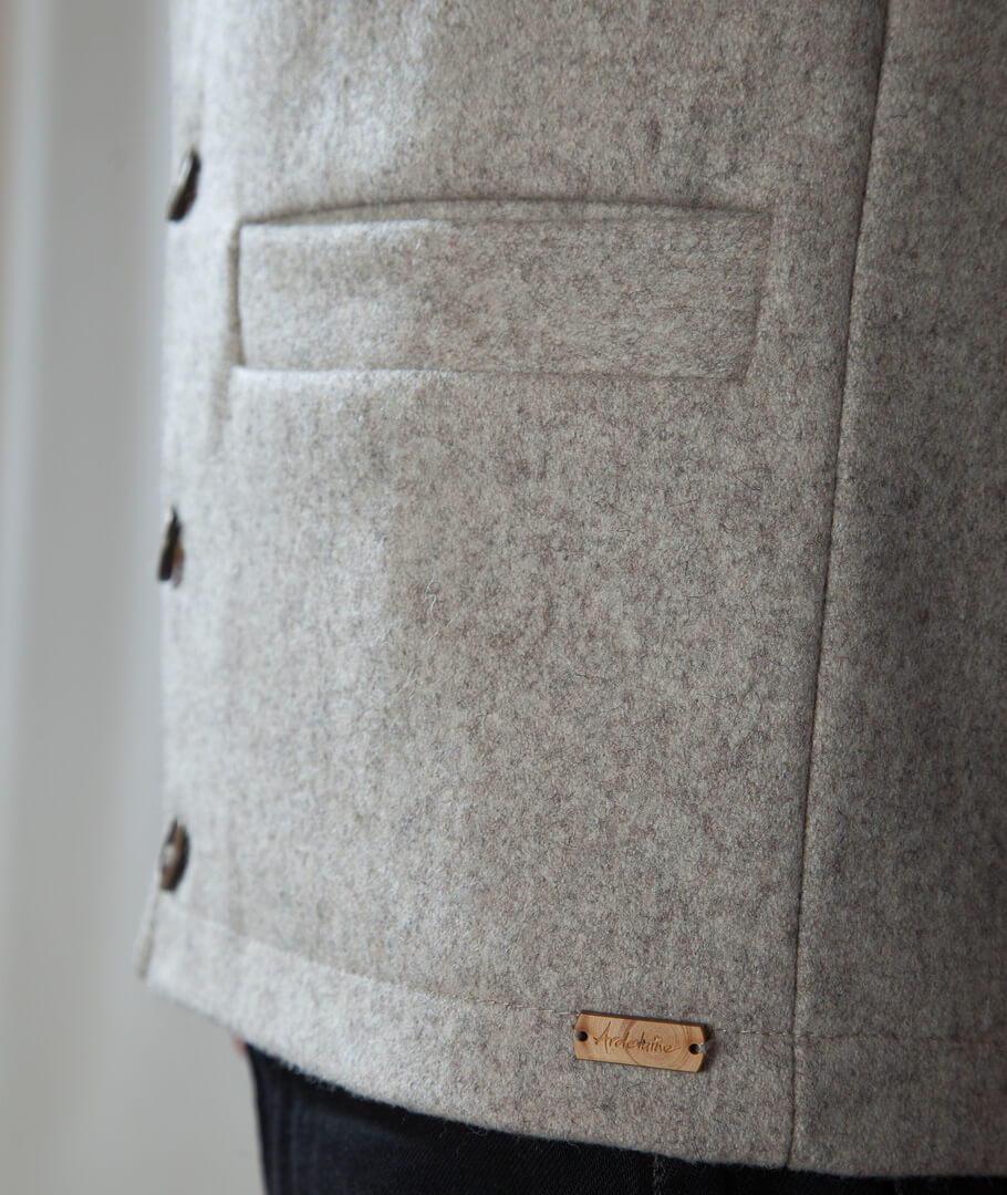 Fabriqué en feutre tissé, ce vêtement allie 80 % de laine recyclée à 20 % de pure laine vierge. Longueur: 66 cm. Coupe classique, deux poches devant, boutons en bois pour le beige et en corrozo pour le coloris noir, doublure en coton biologique à l'interieur. Disponible en couleur naturelle, sans teinture.