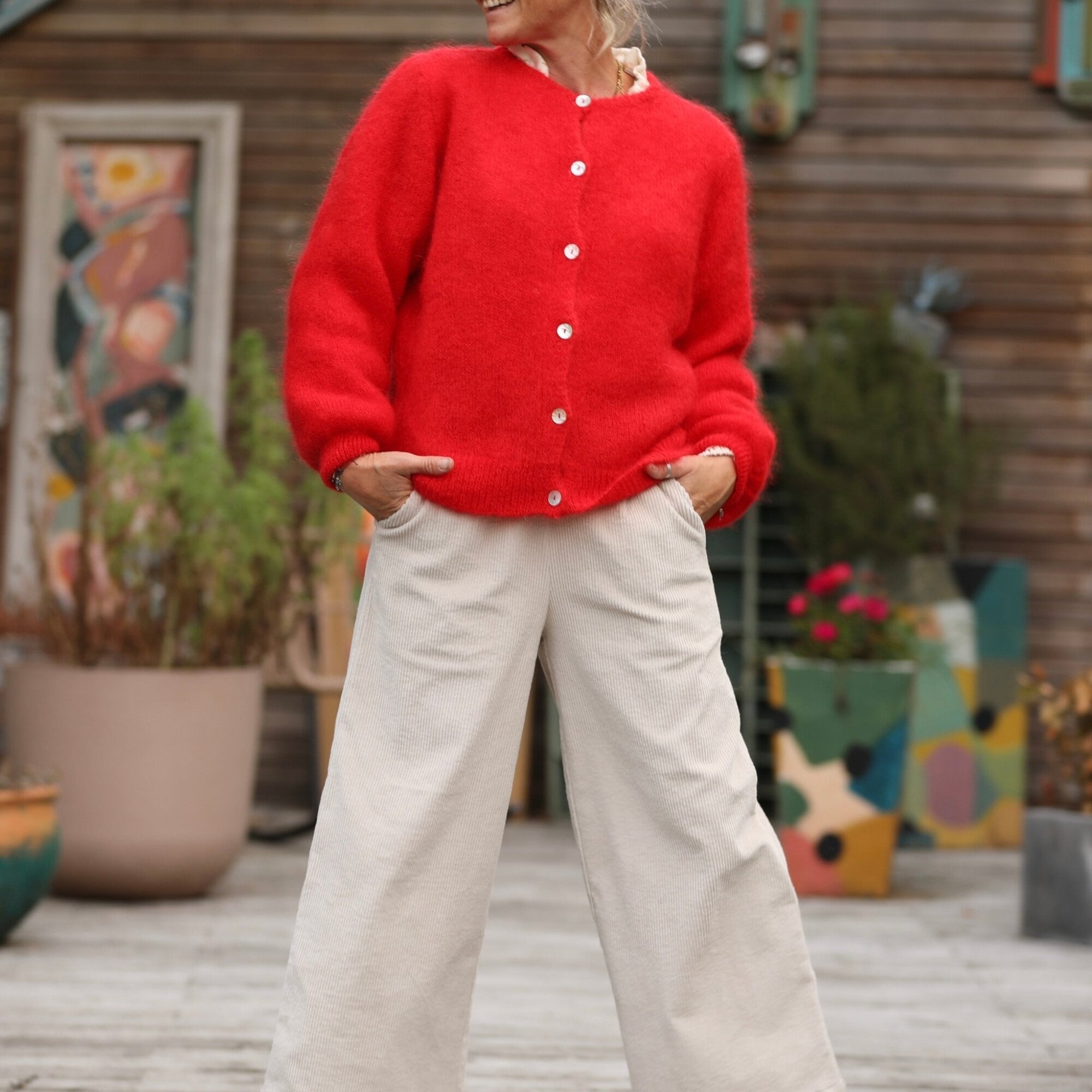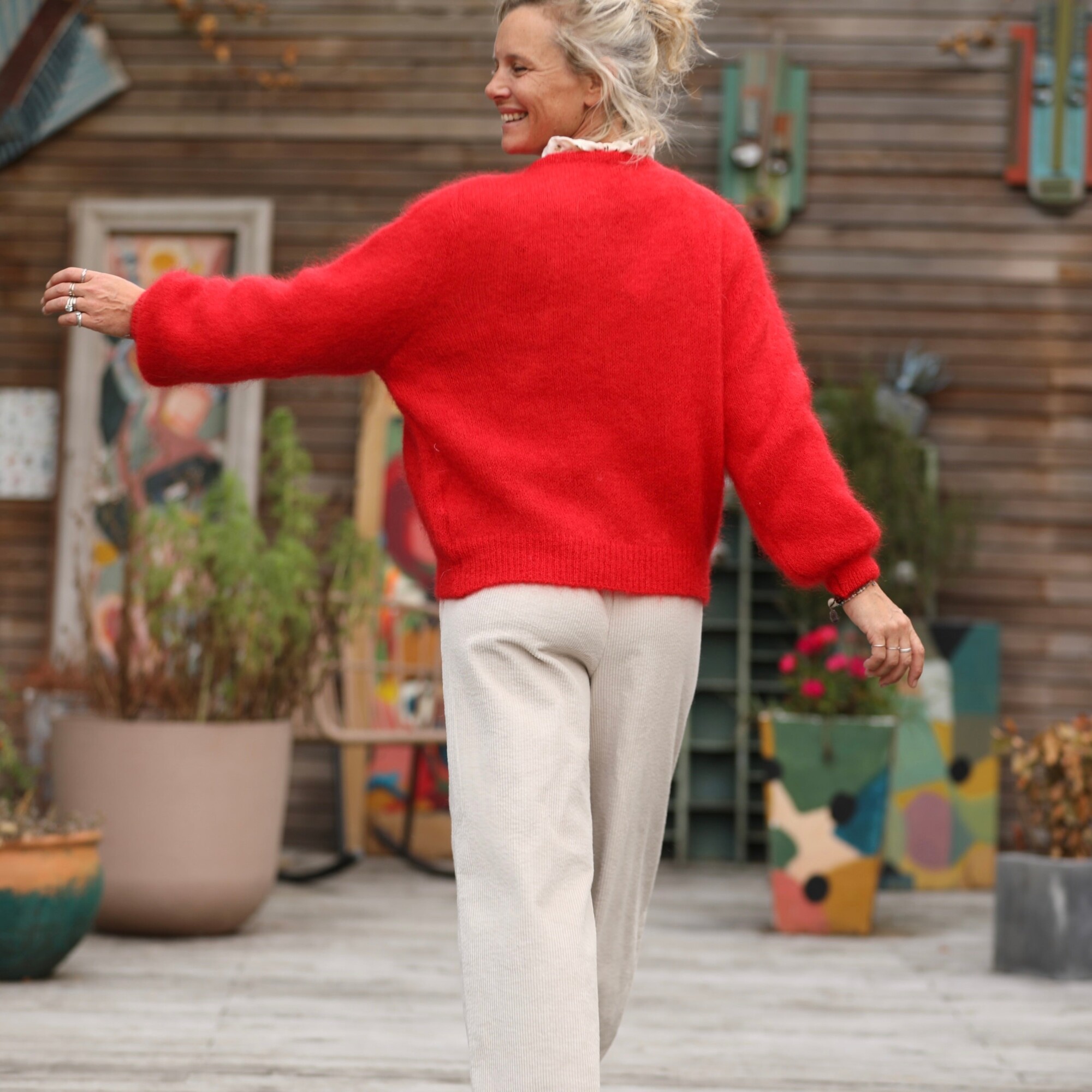 Sélène – Gilet en mohair au charme intemporel. Sa coupe légèrement ample et son col rond lui donnent une allure féminine et décontractée.