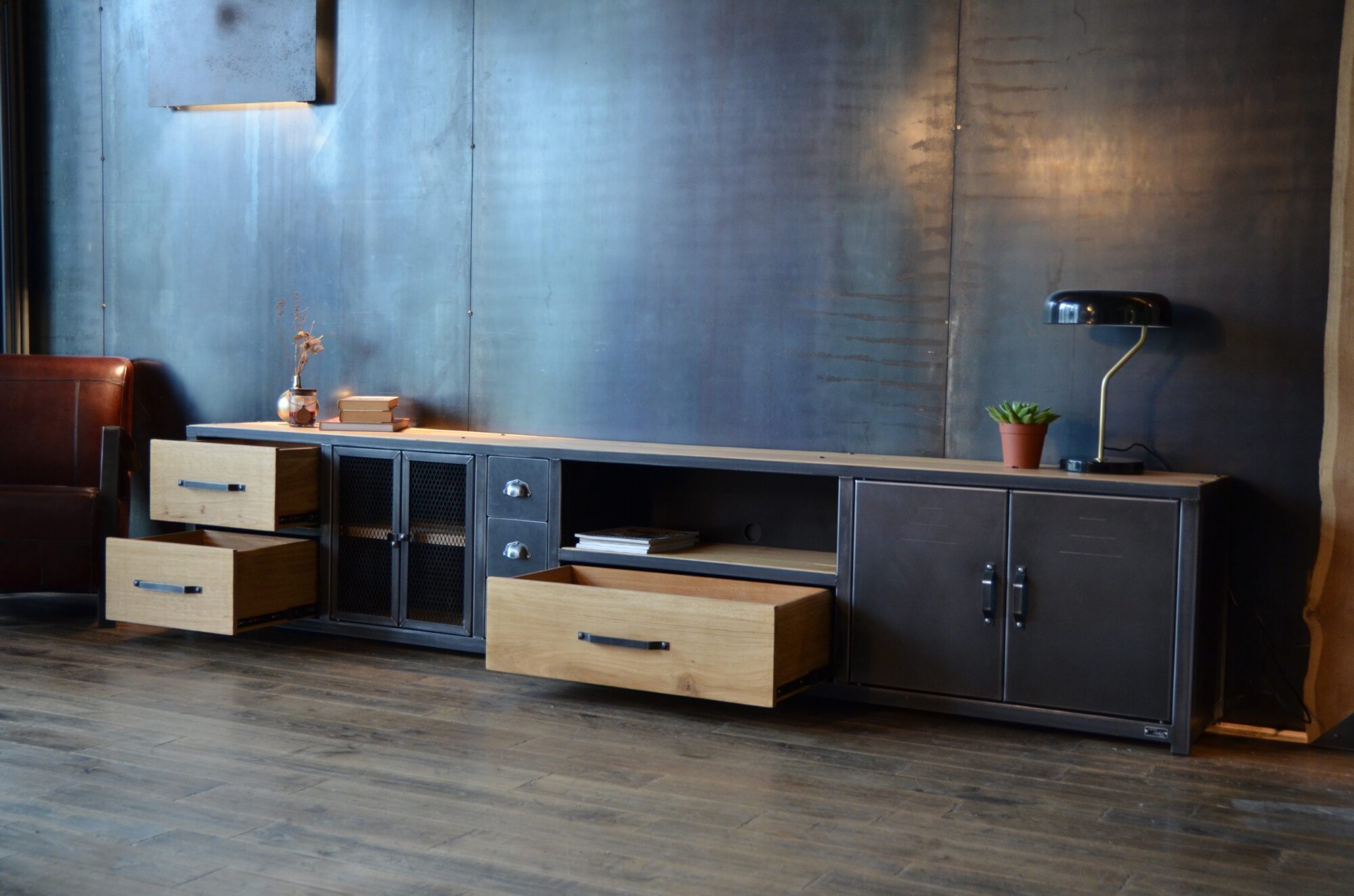 Une ligne de force architecturale pour votre salon. Pièce magistrale de 300 cm, l’enfilade PHÉBUS est forgée à la main pour structurer les grands espaces. Mariant un plateau en chêne massif français et une structure en acier indestructible, elle est conçue pour supporter les équipements multimédias les plus lourds sans aucune flexion. Entièrement personnalisable (tiroirs, portes grillagées, niches), ce meuble sur mesure est fabriqué à la demande dans notre atelier de Mayenne pour un intérieur au caractère radical.