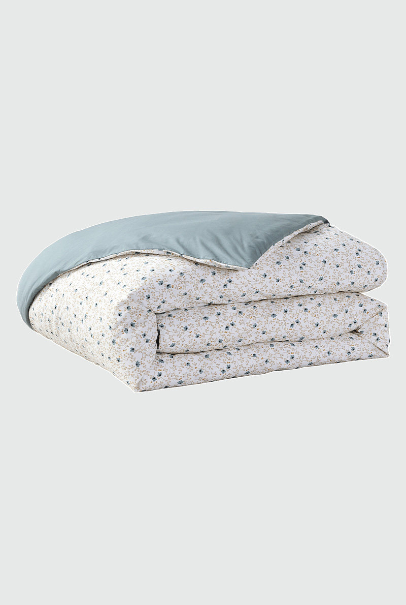 Avec Fleurs de lin, direction les champs et la campagne durant l'été, là où le soleil éveillent doucement les boutons bleus de ces fleurs délicates. Une nature sauvage reproduite, ici, en un micro-motif coloré, presque un faux-uni. Un dessin contrasté par un revers bleu vert, donnant à l'ensemble un esprit poétique et frais parfait pour insuffler l'esprit des beaux jours dans la chambre à coucher.