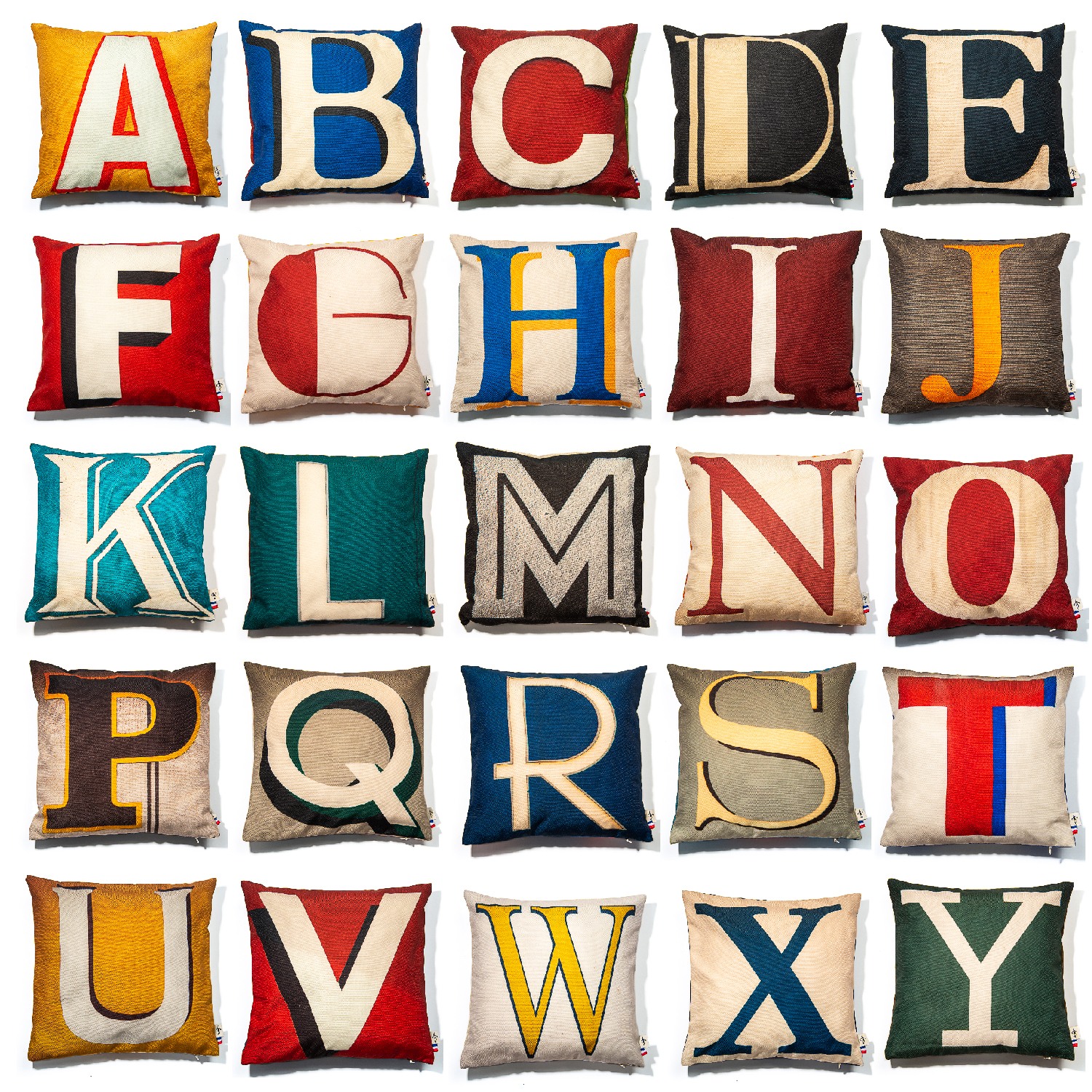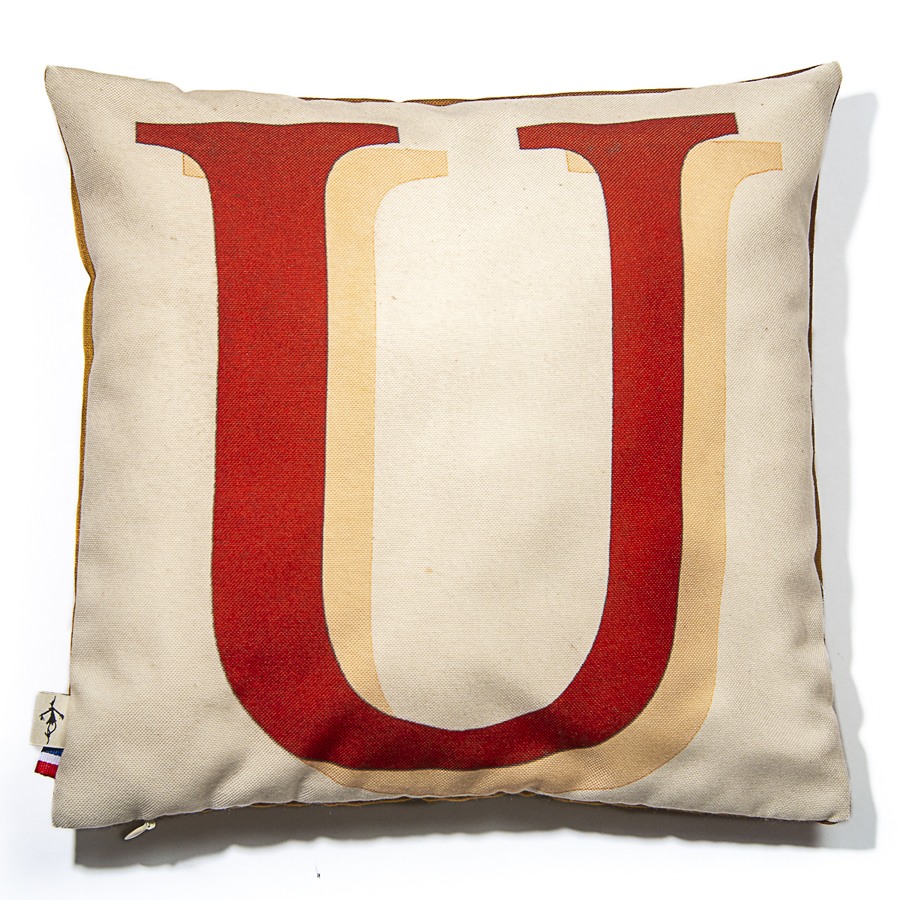 Housse de coussin alphabet lettre U, comme Utopie, Ubuesque, Usine ! Personnalisez votre déco, écrivez vos messages avec ces coussins made in France.