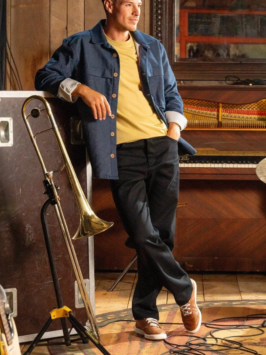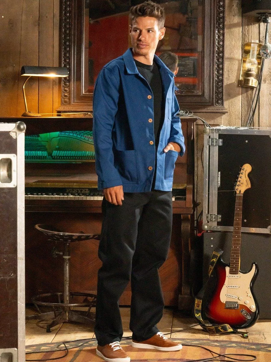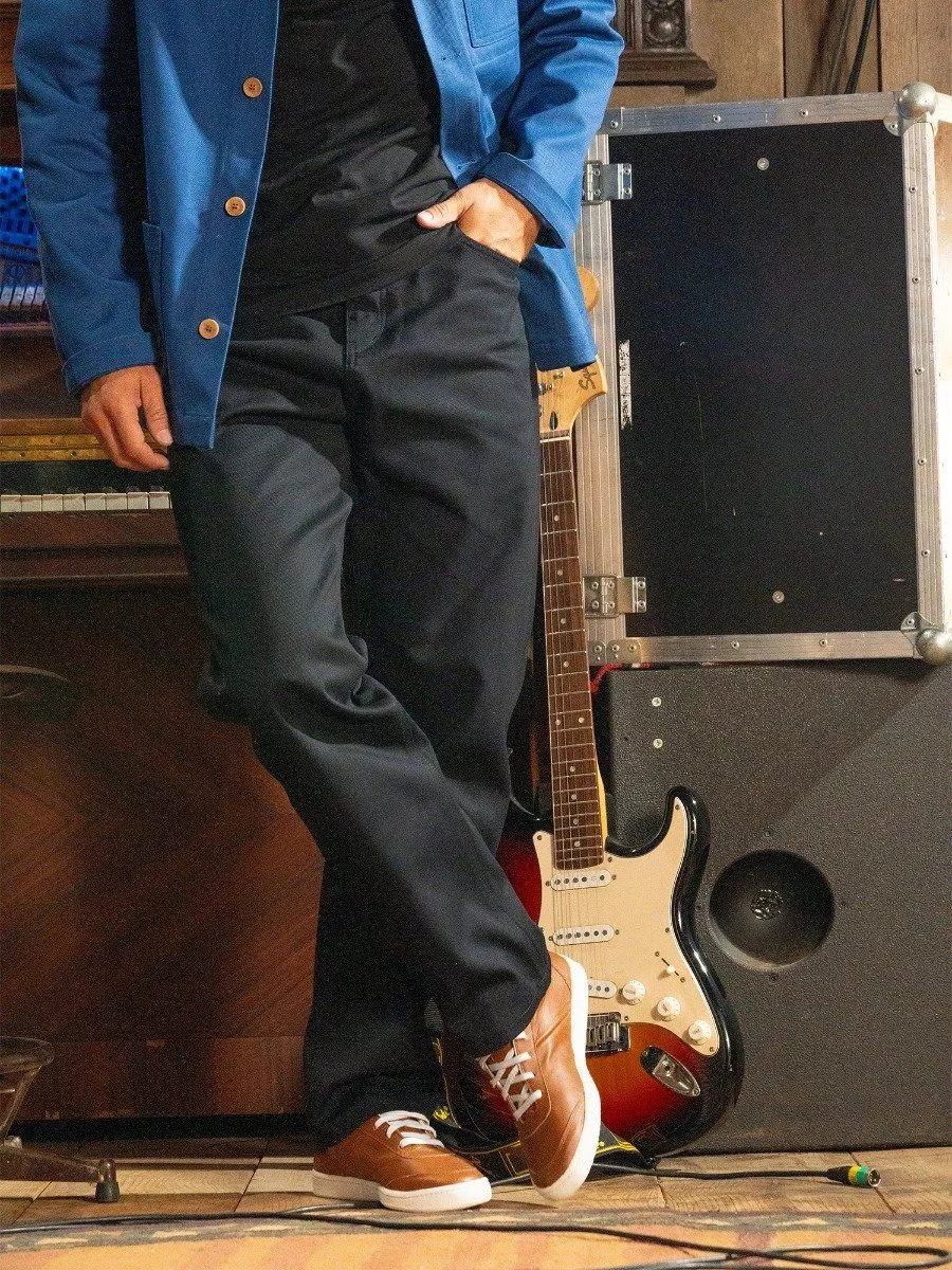 LE JEANS LARGE HOMME COTON BIO NOIR Le jeans taille haute homme noir 115N revisite le classique du denim dans une version large et confortable. Confectionné en coton bio uni et tissé en France, ce jeans made in France reprend tout l’ADN 1083 : une fabrication locale, responsable et durable.