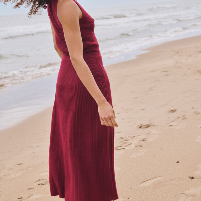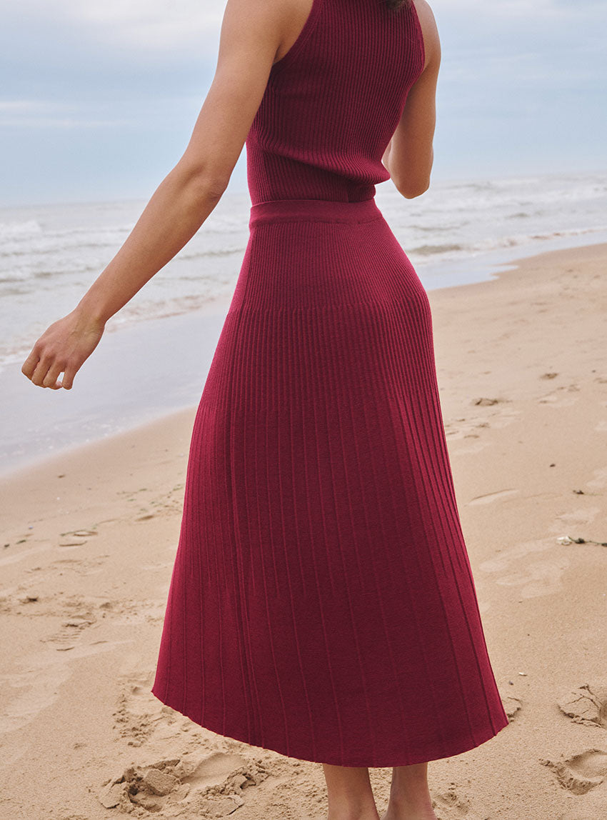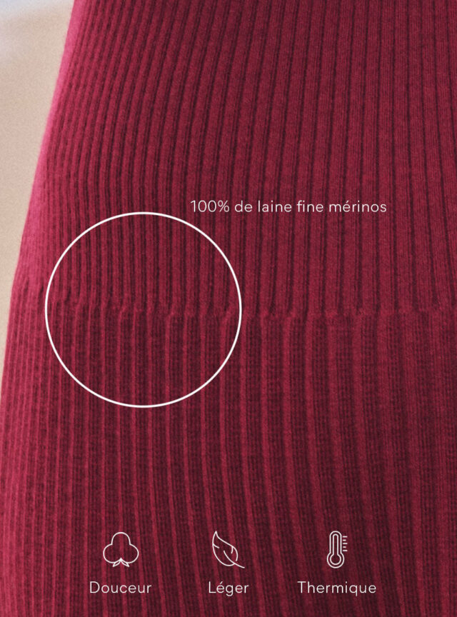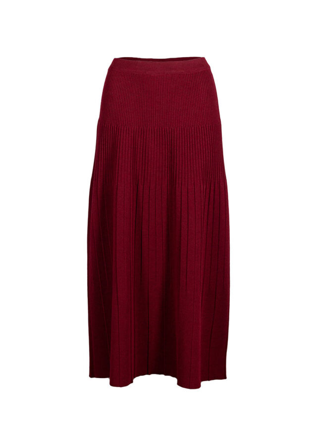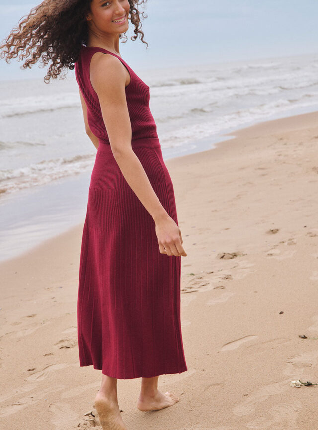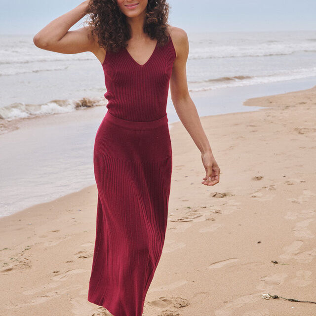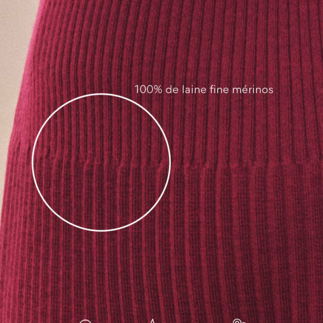 La jupe Alexandra en rouge bordeaux mise sur l'élégance du mouvement. Confectionnée en 100 % laine mérinos, elle offre une chaleur naturelle tout en restant fluide grâce à sa maille jersey longue plissée. Sa taille élastiquée assure un confort parfait au quotidien. Une pièce féminine et intemporelle à porter aussi bien chic que décontractée.