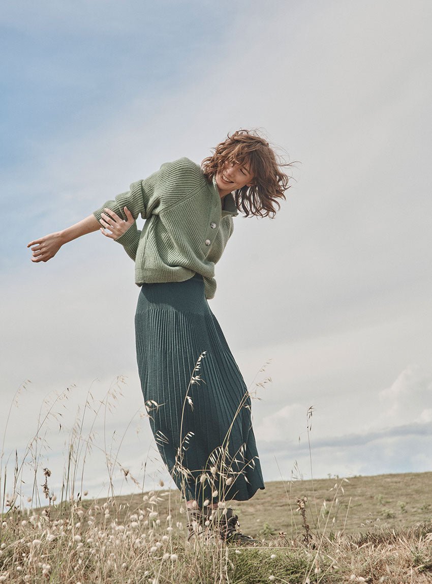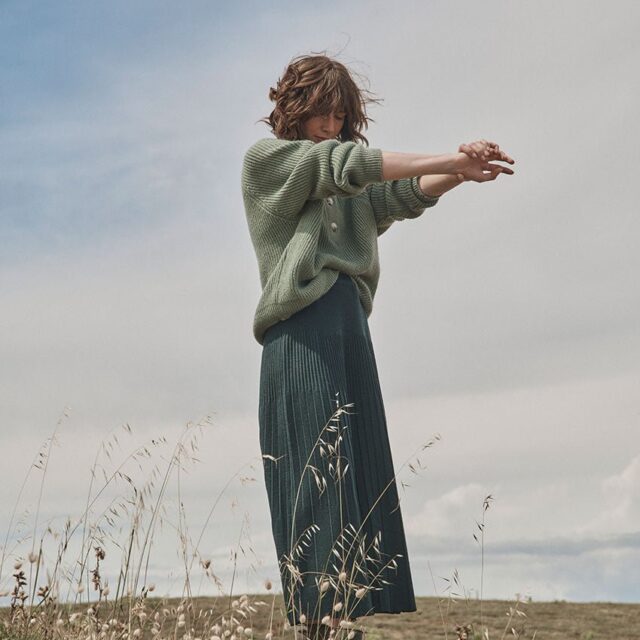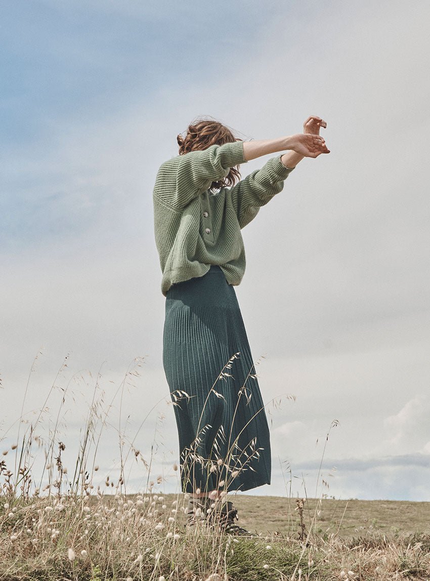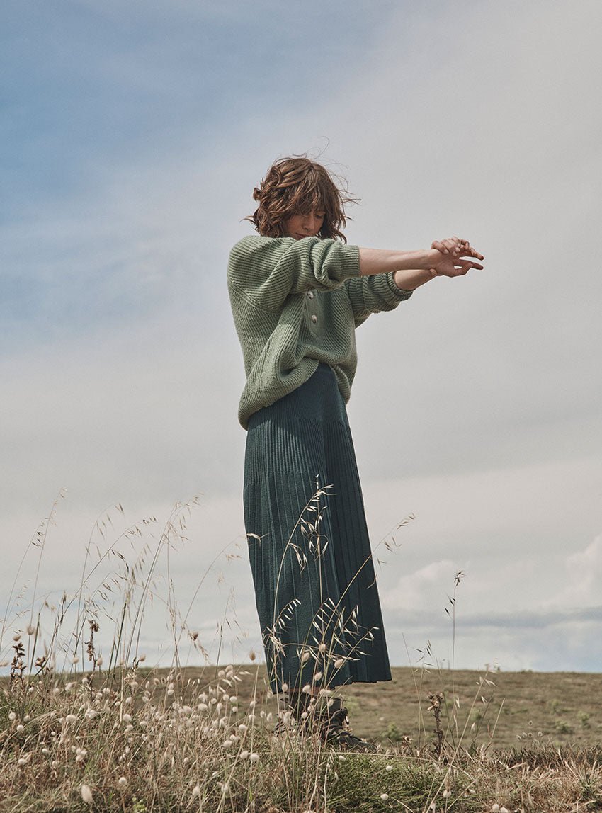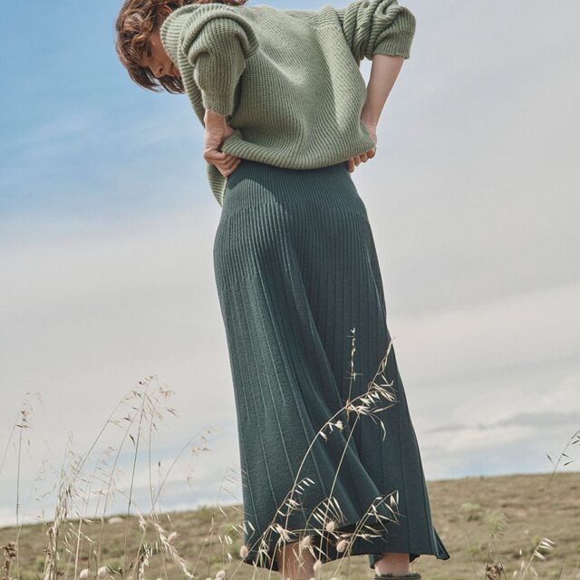 La jupe Alexandra en vert sombre joue la carte de l’élégance discrète. Tricotée en maille jersey 100 % laine mérinos, elle combine douceur, chaleur et fluidité. Sa coupe longue plissée crée un mouvement gracieux, tandis que la taille élastiquée assure une tenue confortable. Une pièce raffinée et facile à associer.