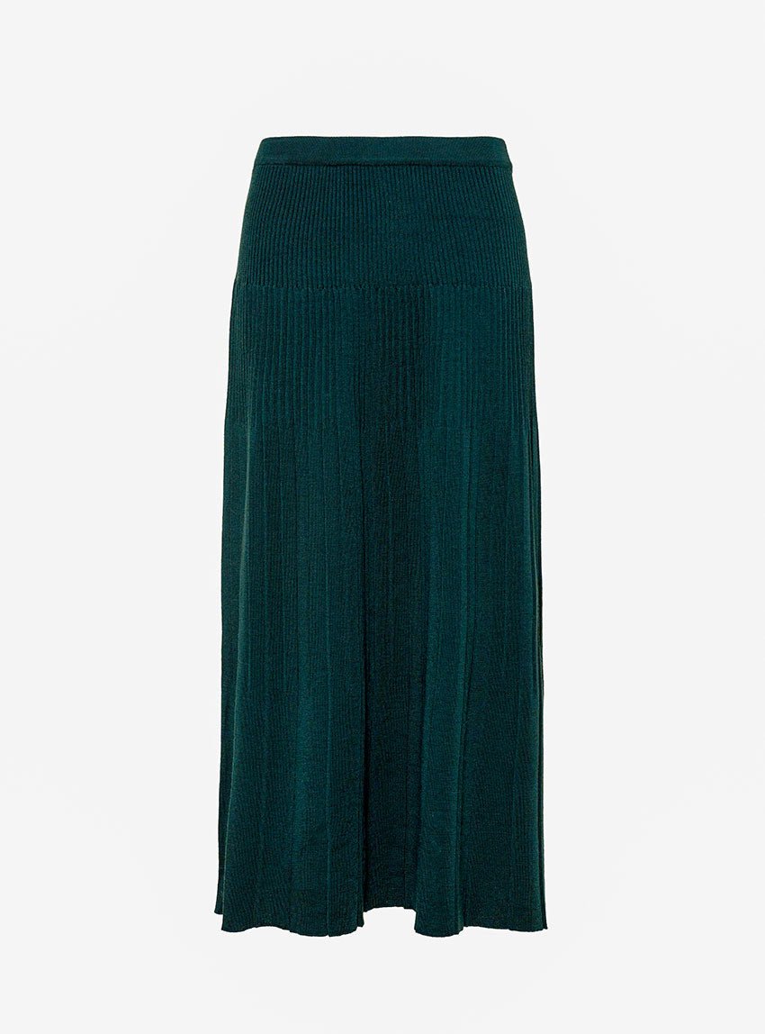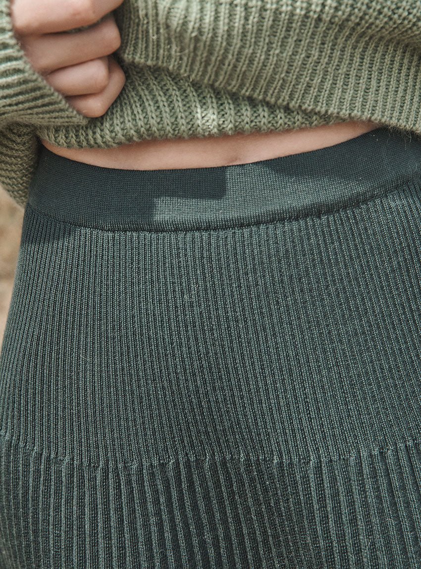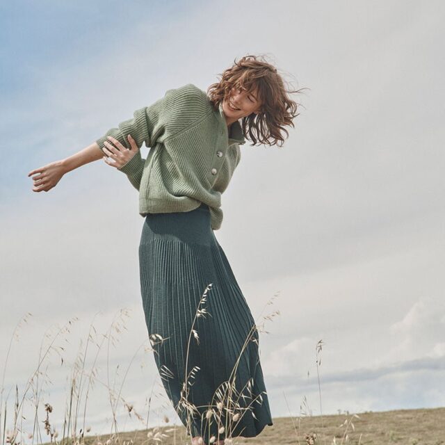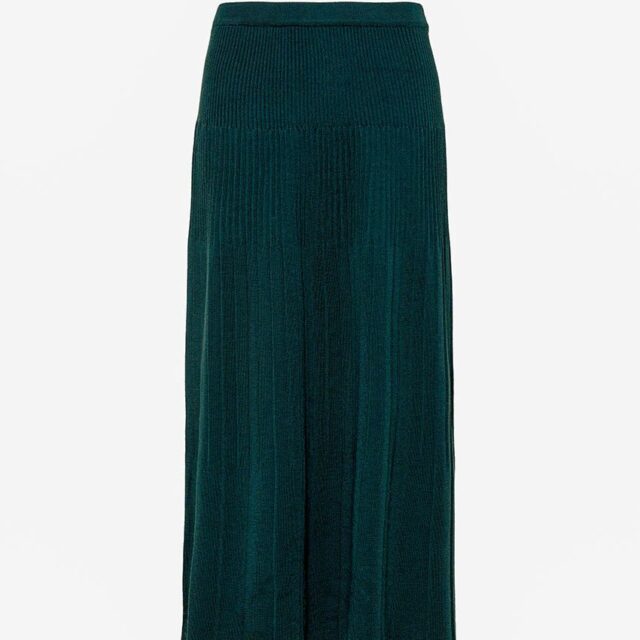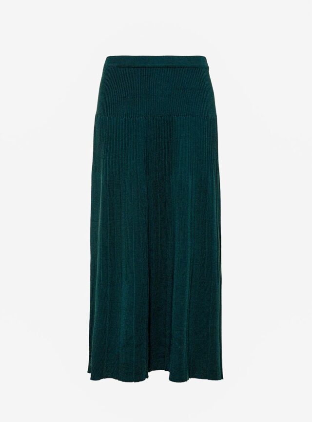 La jupe Alexandra en vert sombre joue la carte de l’élégance discrète. Tricotée en maille jersey 100 % laine mérinos, elle combine douceur, chaleur et fluidité. Sa coupe longue plissée crée un mouvement gracieux, tandis que la taille élastiquée assure une tenue confortable. Une pièce raffinée et facile à associer.