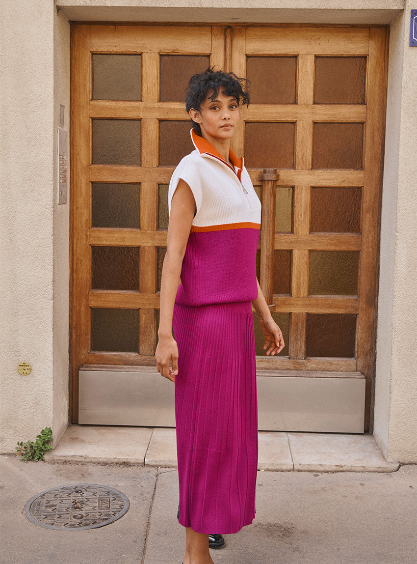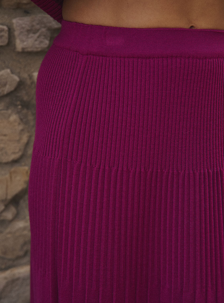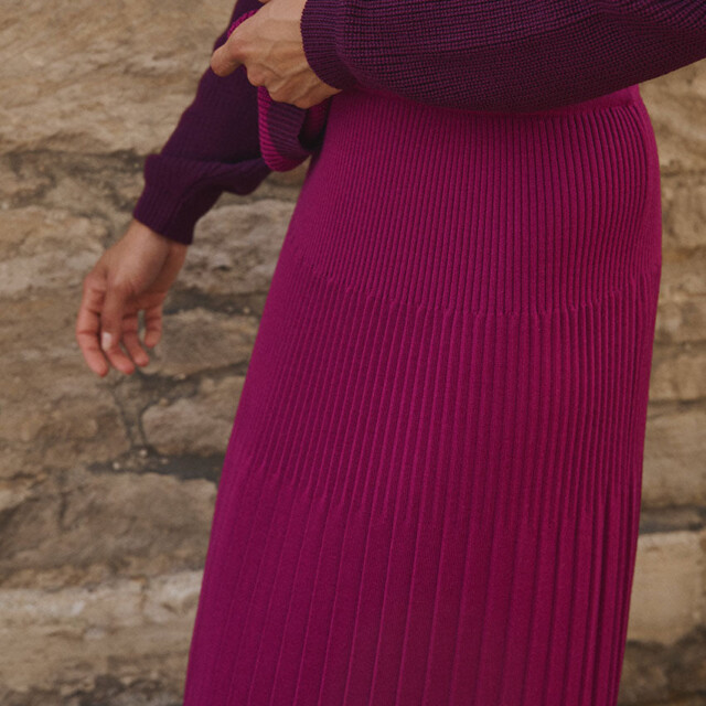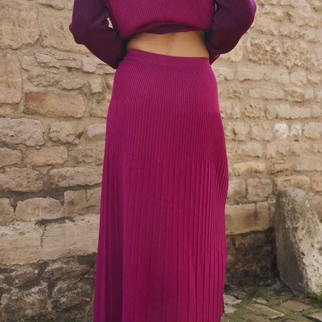 La jupe Alexandra en violet améthyste apporte une touche féminine et vibrante au vestiaire. Conçue en maille jersey 100 % laine mérinos, elle est à la fois chaude et fluide. Sa coupe longue plissée crée un joli mouvement, tandis que la taille élastiquée garantit un confort impeccable. Une pièce élégante qui se suffit à elle-même.