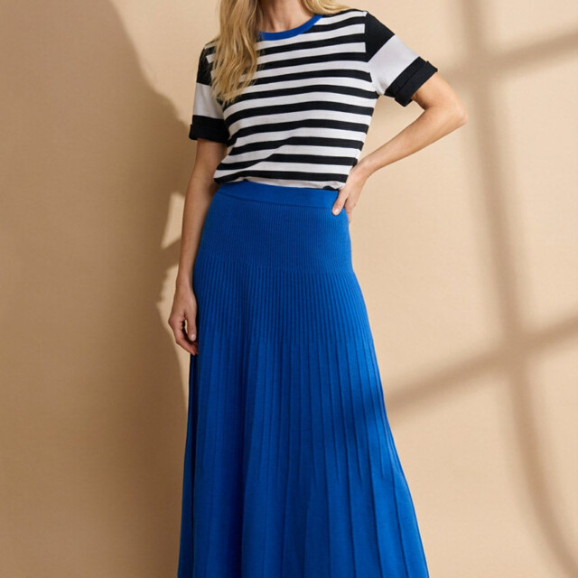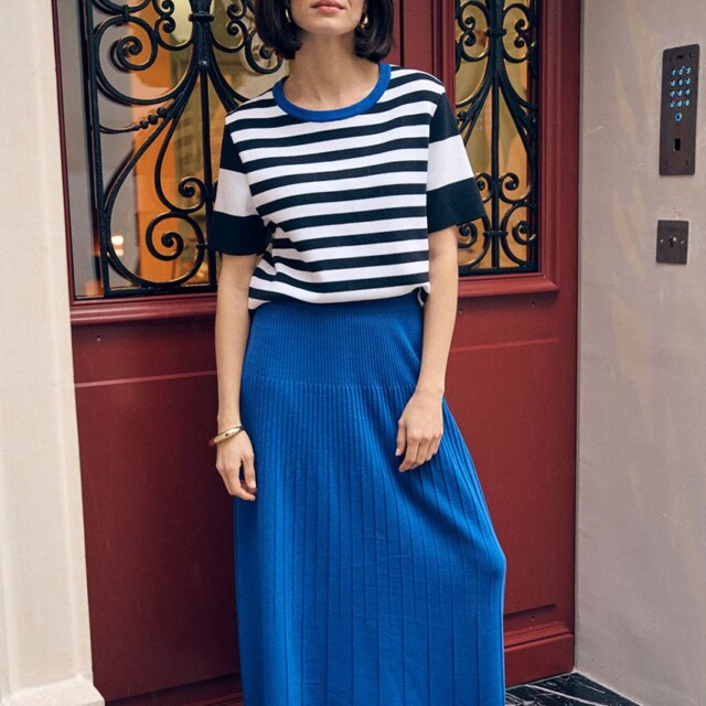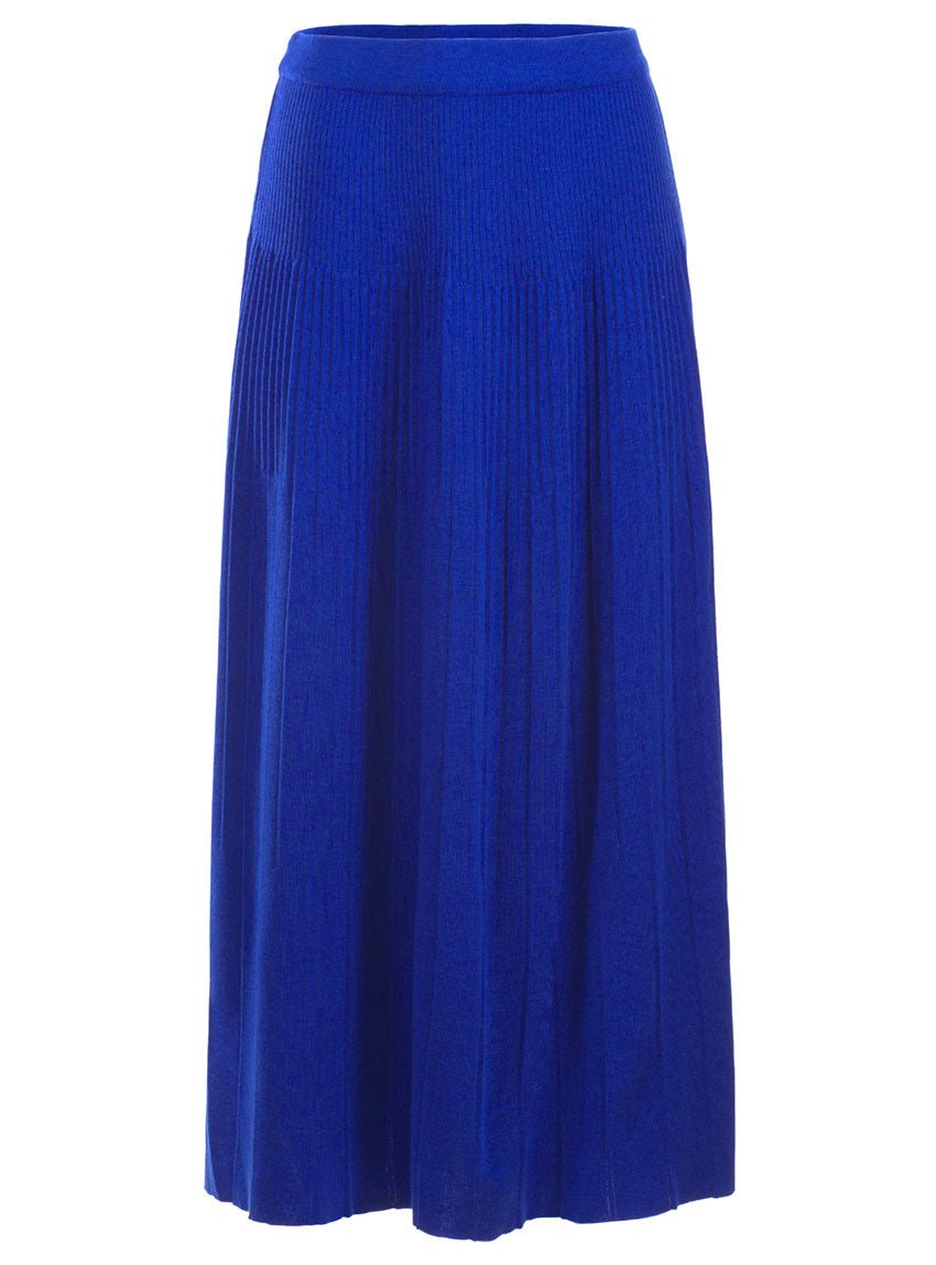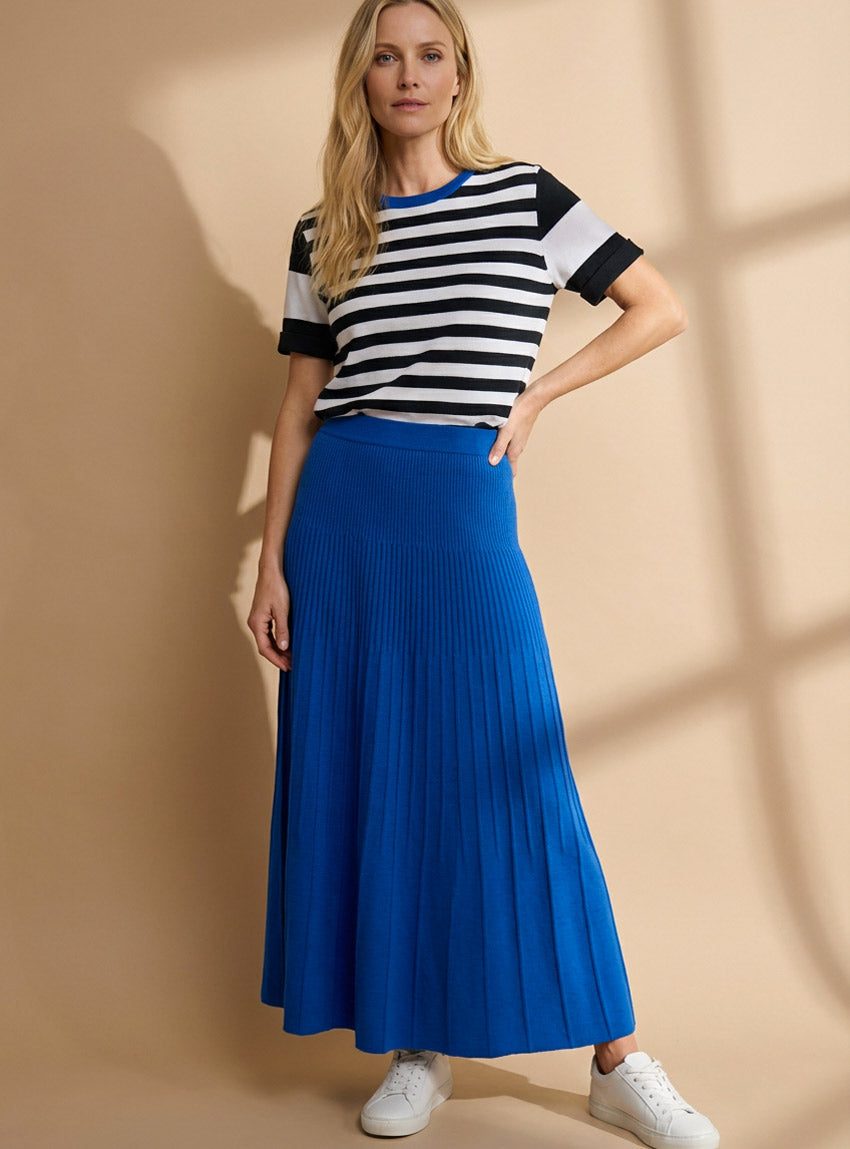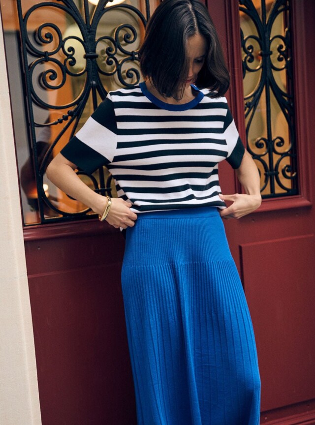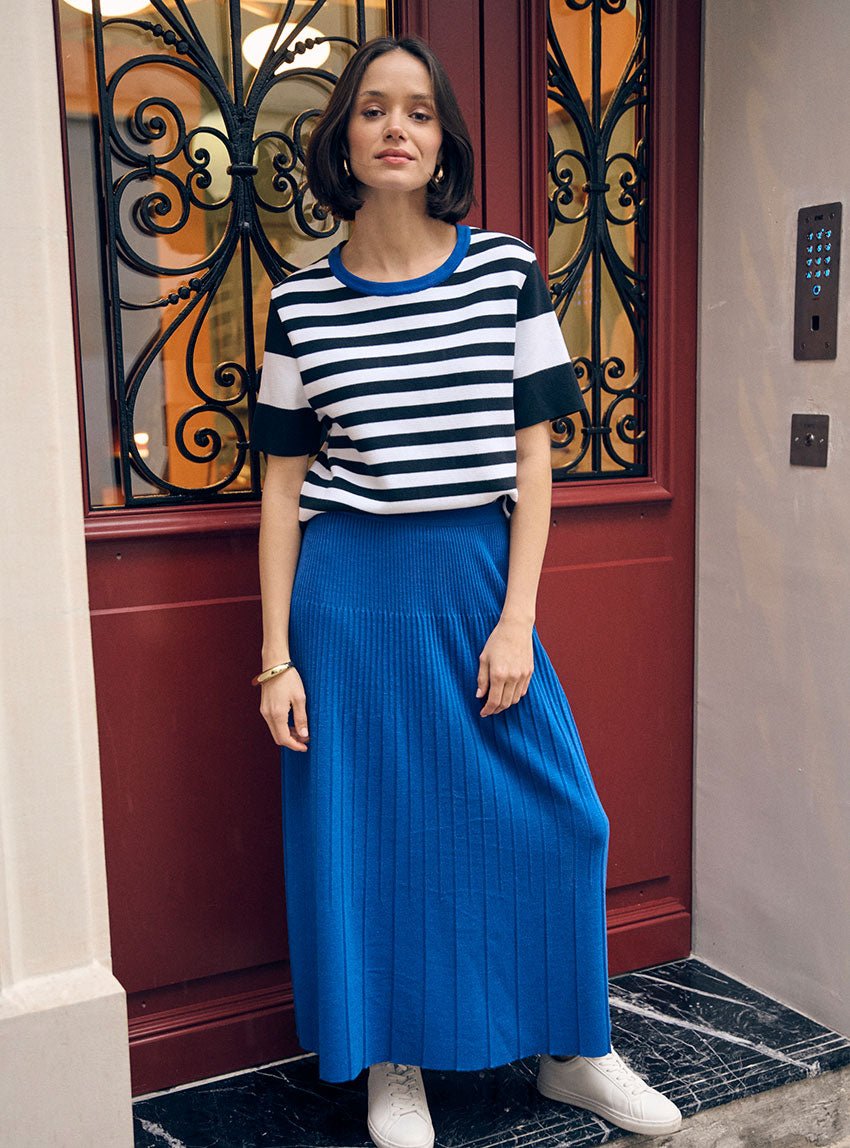 La jupe Alexandra en bleu électrique affirme une allure audacieuse et moderne. Confectionnée en maille jersey 100 % laine mérinos, elle offre douceur et mouvement grâce à sa coupe longue plissée. Sa taille élastiquée garantit un confort parfait. Une pièce forte qui dynamise instantanément la silhouette.