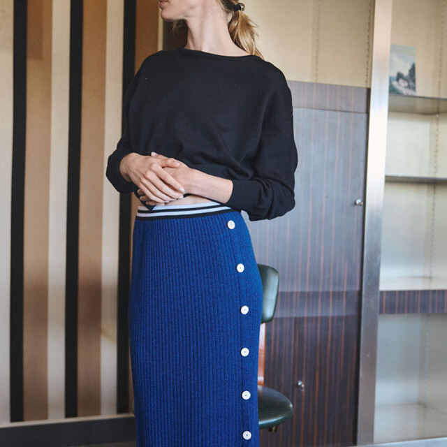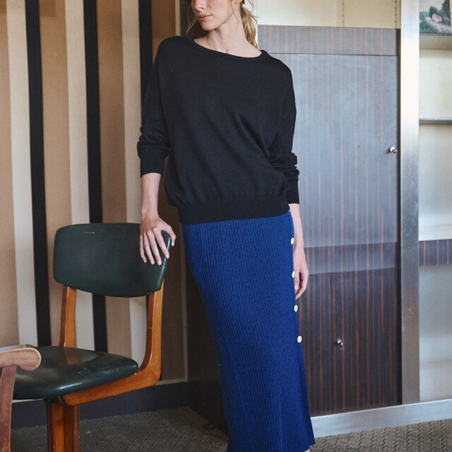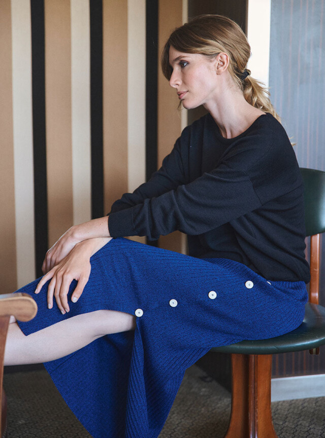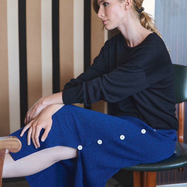 La jupe Charlotte en bleu mouliné dévoile une allure longue et moderne, sublimée par la texture raffinée de sa maille côtelée Richelieu. Confectionnée en 100 % laine mérinos fine, elle assure chaleur, souplesse et structure. Sa ceinture tubulaire rayée élastiquée offre un maintien confortable, tandis que la fausse patte de boutonnage à six boutons apporte une touche chic et graphique. Une pièce élégante et lumineuse, facile à associer.
