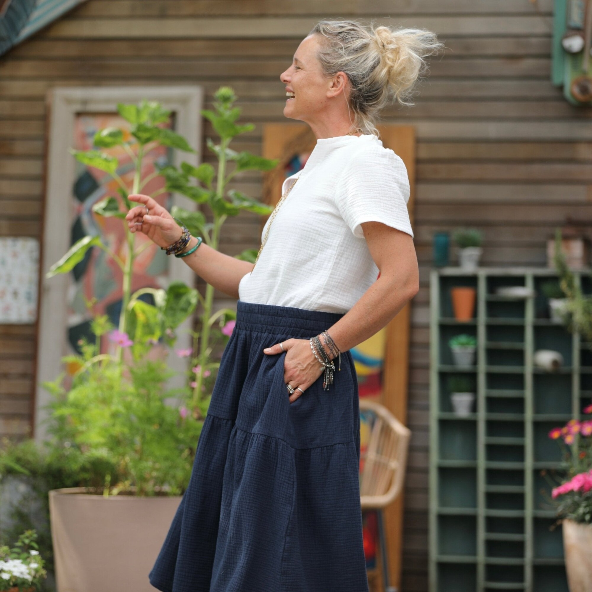 Sarah : une jupe à la ceinture élastiquée de 6 cm de large, agrémentée d’un jeu de volants et de fronces pour un style bohème. Elle offre une belle aisance à la taille et dispose de deux poches latérales.