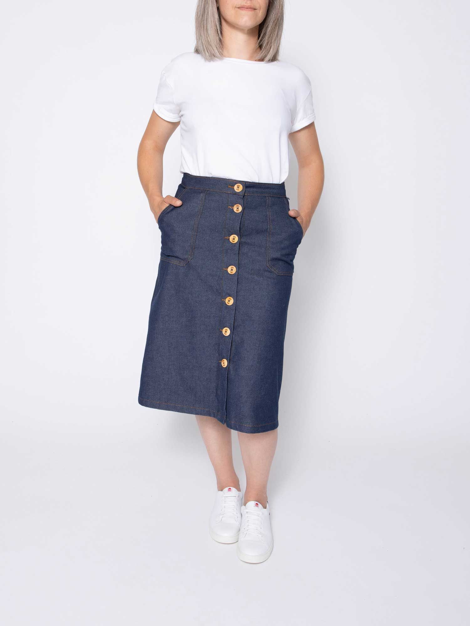 LA JUPE MIDI EVASÉE La jupe Midi évasée par 1083 et Les Jupons de Louison, deux acteurs du made in France ! Vous hésitez entre une jupe courte et une jupe longue ? Optez pour l'entre-deux avec la jupe midi 293 ! Née dans les années 50, la jupe midi fait son grand retour. Nous avons voulu la façonner à notre image, en jeans 100% coton bio tout en apportant une touche d'élégance avec ses boutons en bois de buis du Jura qui la ferme sur le devant.