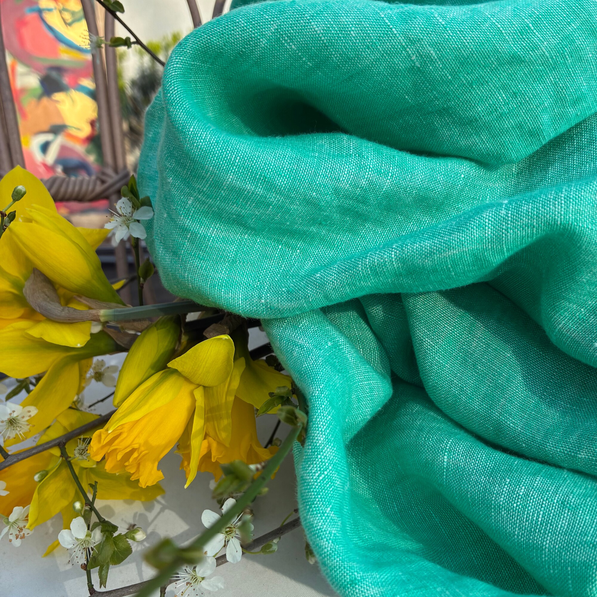 Maya se décline ici dans une version lumineuse et pleine d’énergie. Confectionnée en lin chiné vert pep’s, elle apporte fraîcheur et caractère à la silhouette tout en conservant une élégance naturelle.