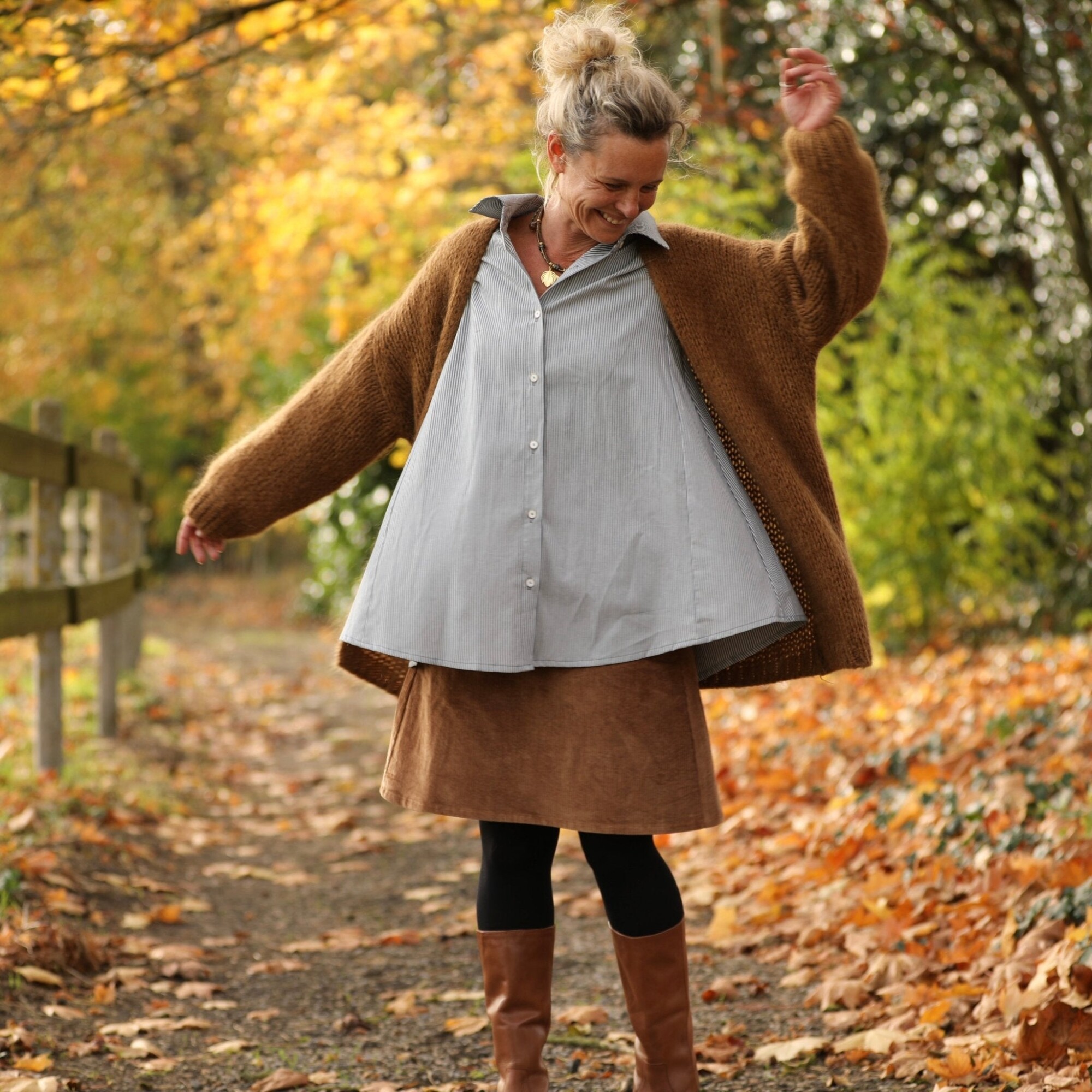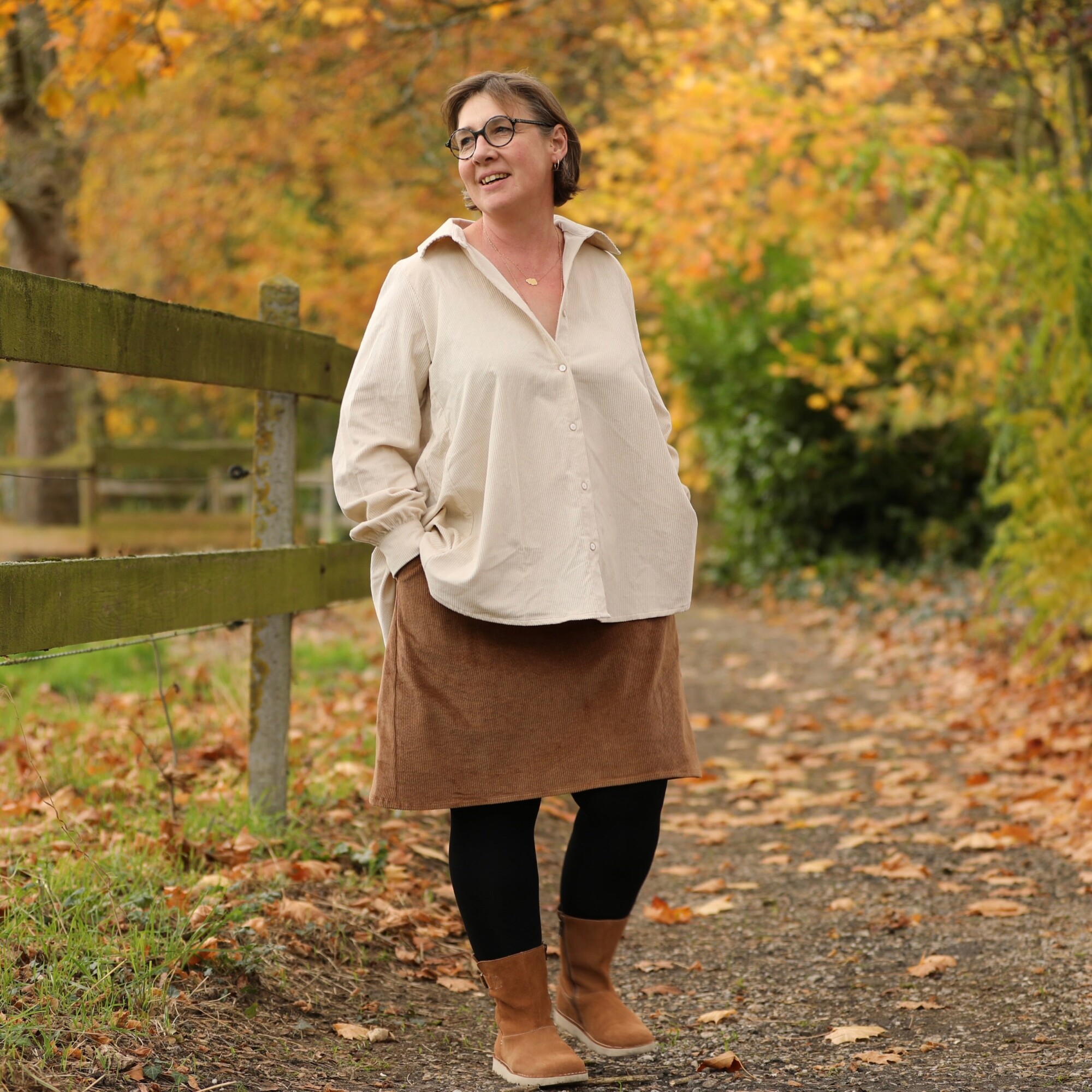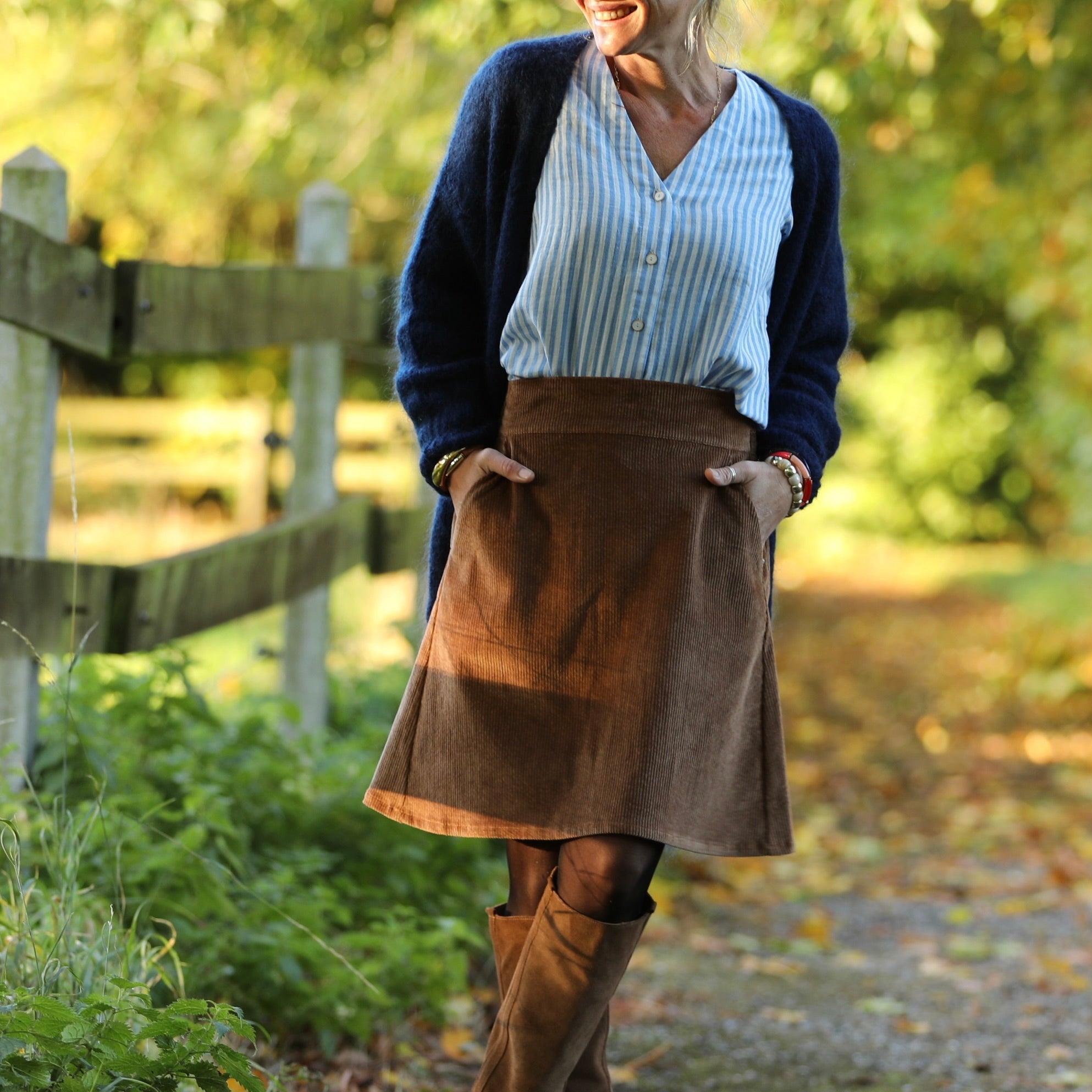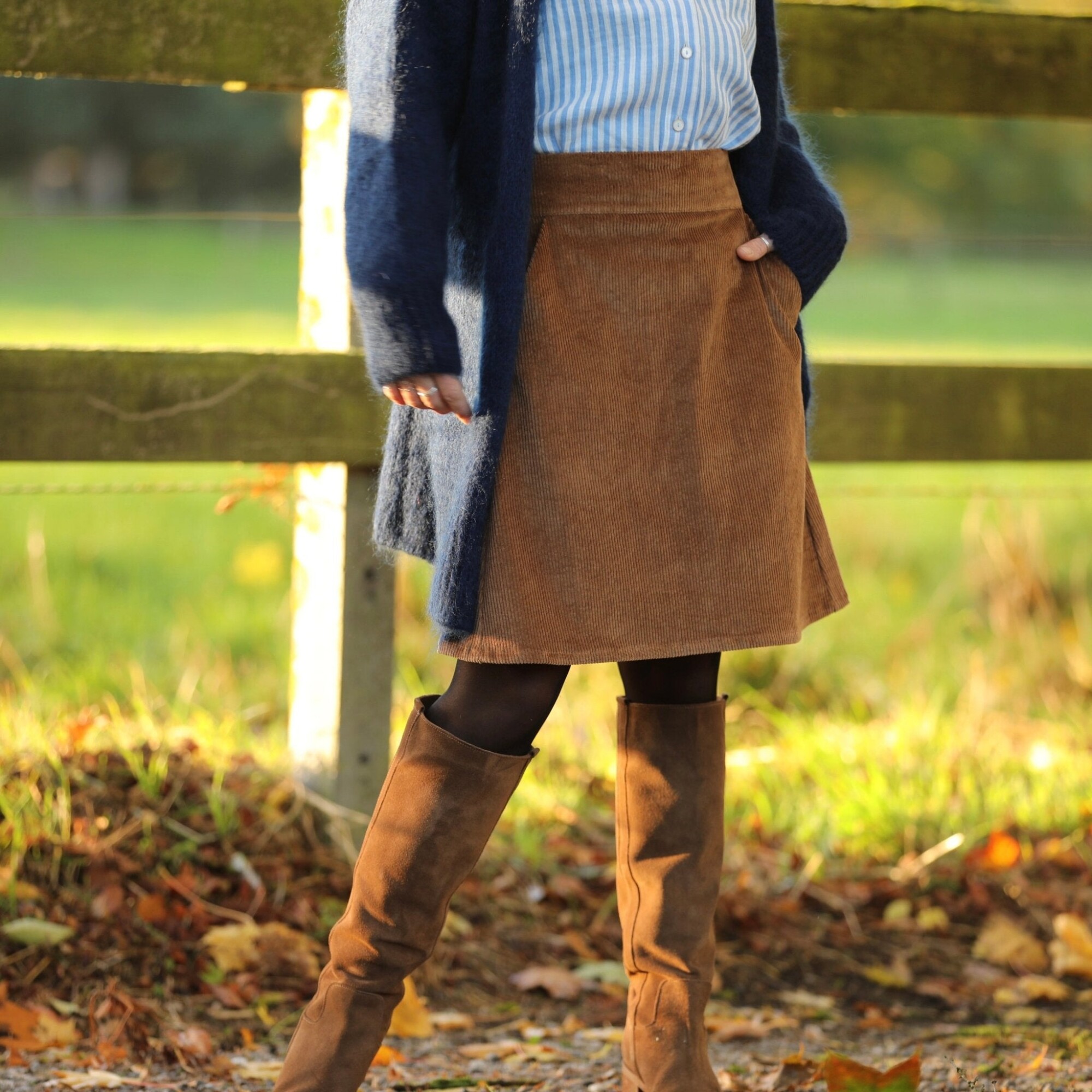 Coupe La jupe Maya en velours côtelé camel séduit par sa coupe trapèze féminine et sa belle matière texturée. Sa ceinture plate à l’avant et élastiquée au dos offrent confort et maintien, pour un tombé fluide qui met la silhouette en valeur avec naturel.