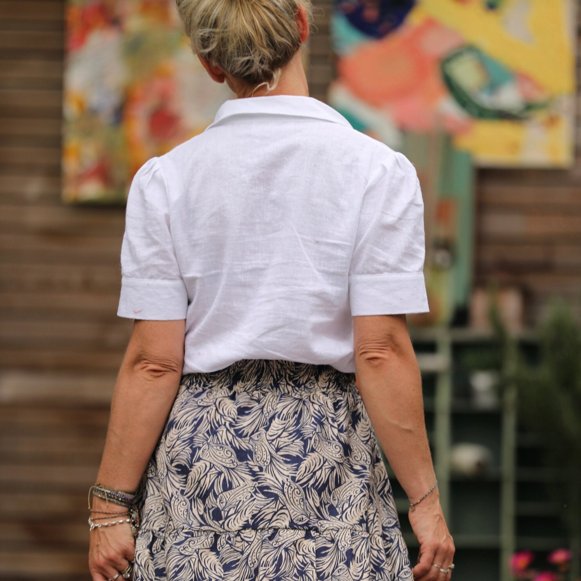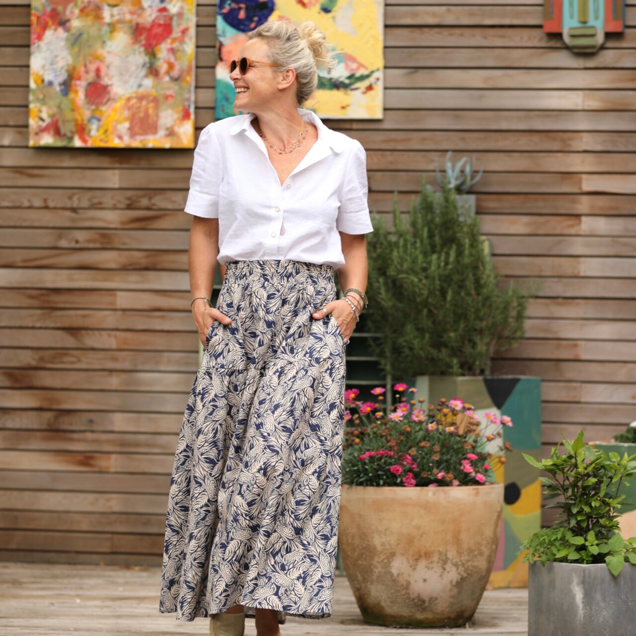 Sarah : une jupe à la ceinture élastiquée de 6 cm de large, agrémentée d’un jeu de volants et de fronces pour un style bohème. Elle offre une belle aisance à la taille et dispose de deux poches latérales.