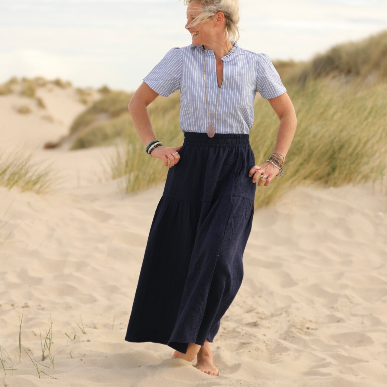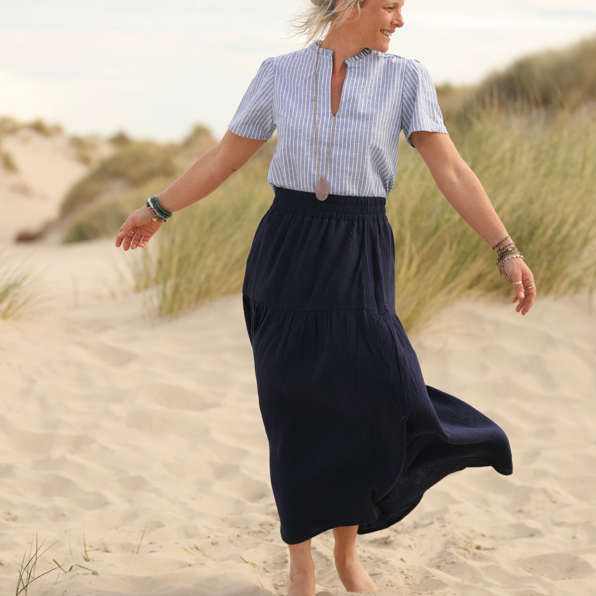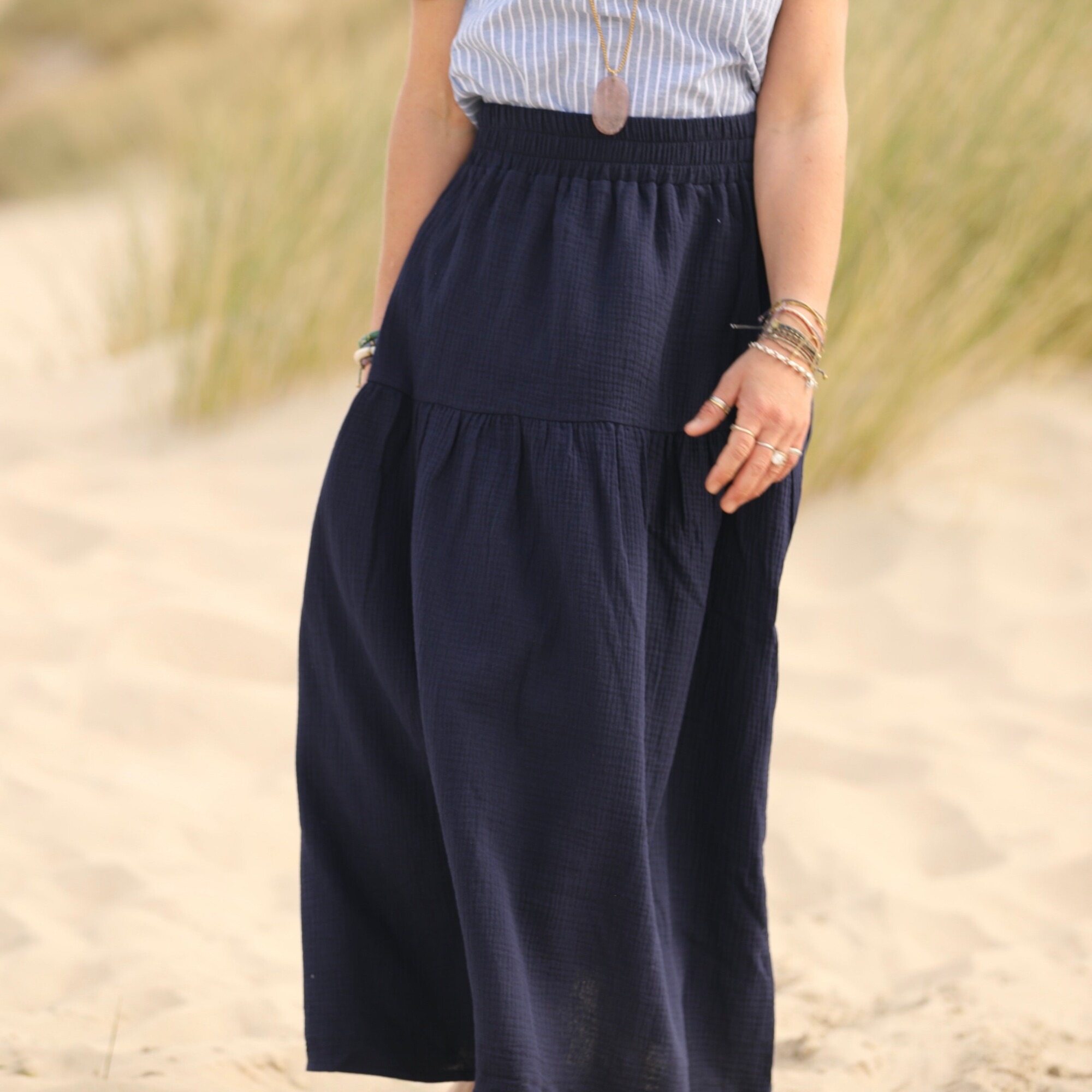 Sarah : une jupe à la ceinture élastiquée de 6 cm de large, agrémentée d’un jeu de volants et de fronces pour un style bohème. Elle offre une belle aisance à la taille et dispose de deux poches latérales.