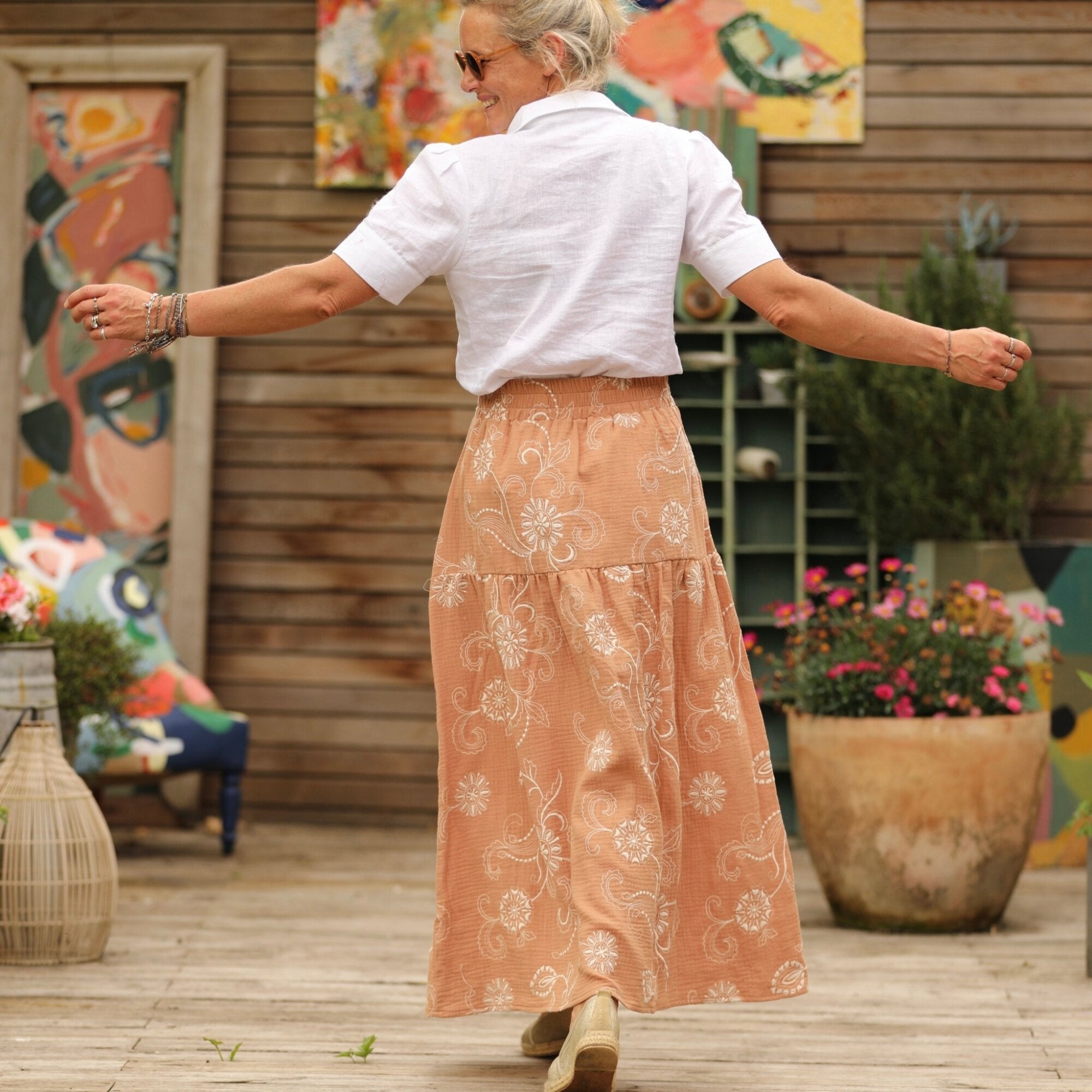 Jupe Sarah - double gaze de coton brodée camel