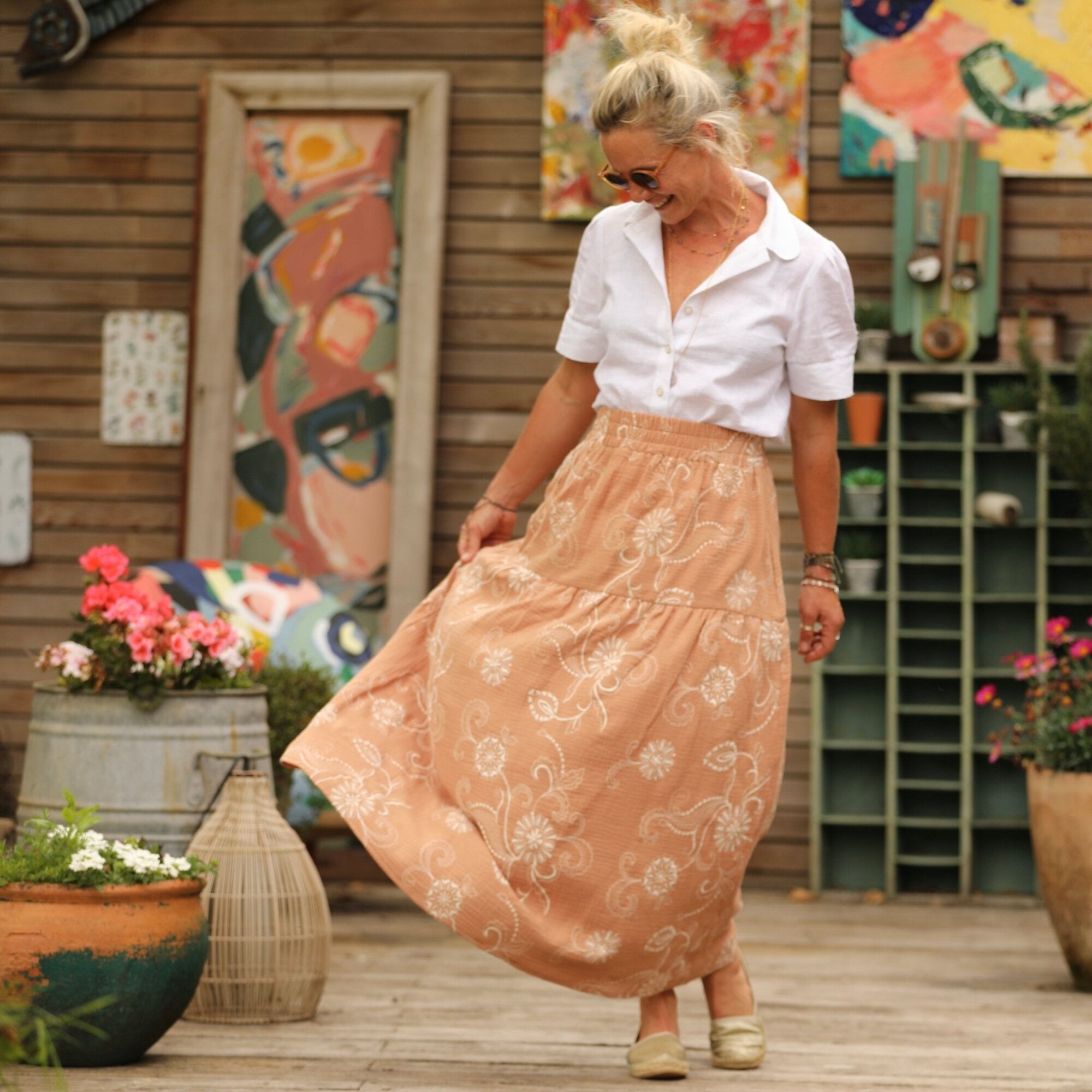 Sarah : une jupe à la ceinture élastiquée de 6 cm de large, agrémentée d’un jeu de volants et de fronces pour un style bohème. Elle offre une belle aisance à la taille et dispose de deux poches latérales.