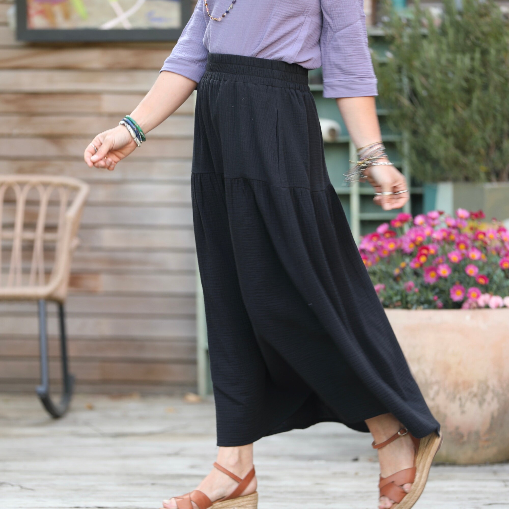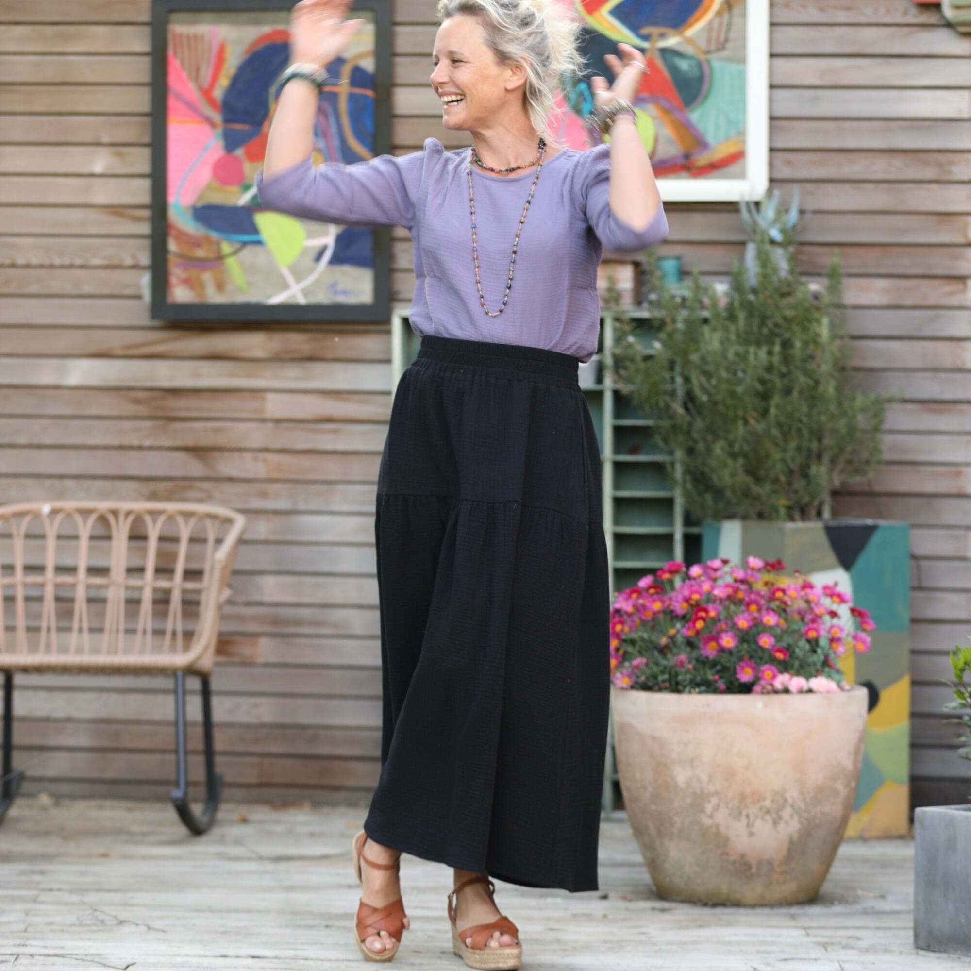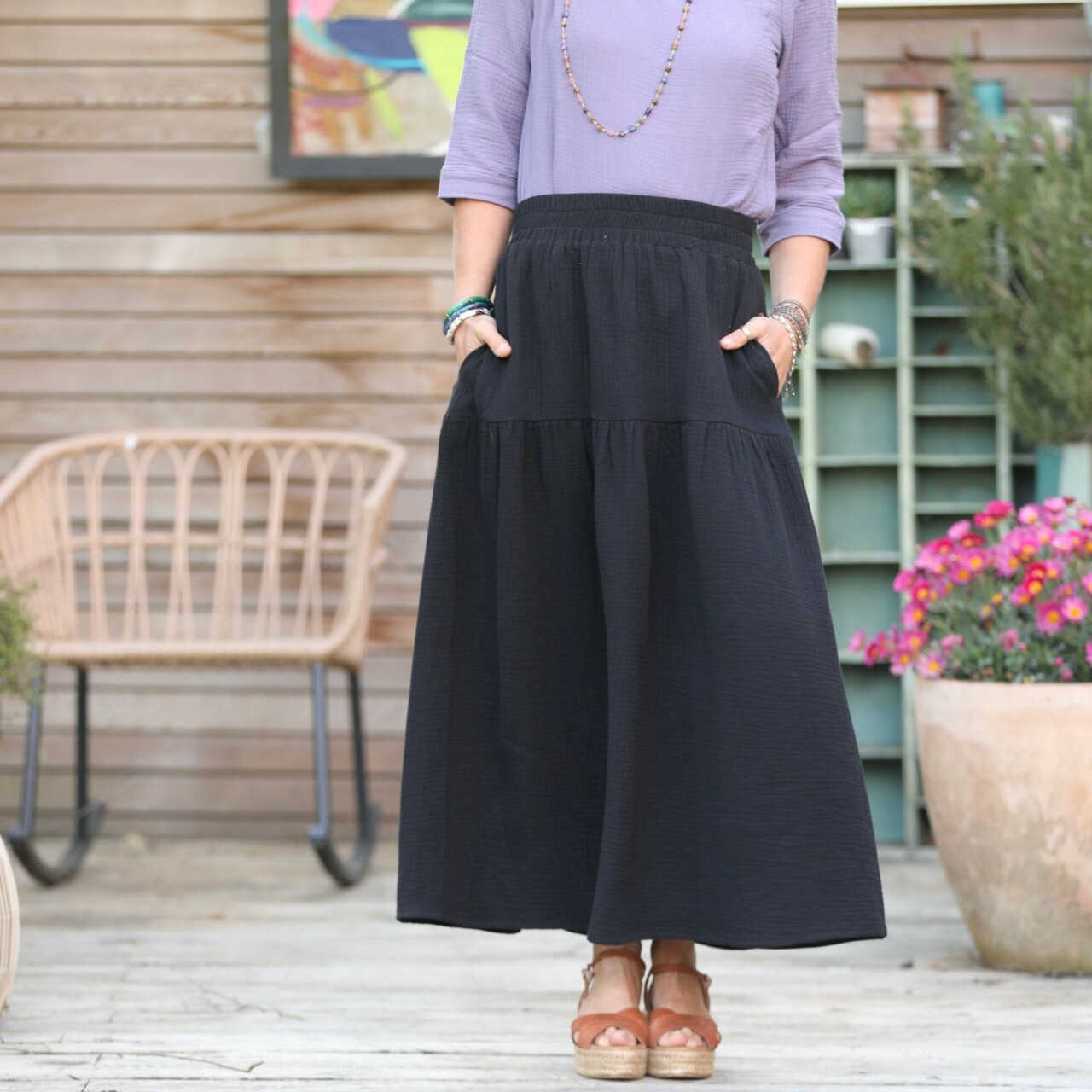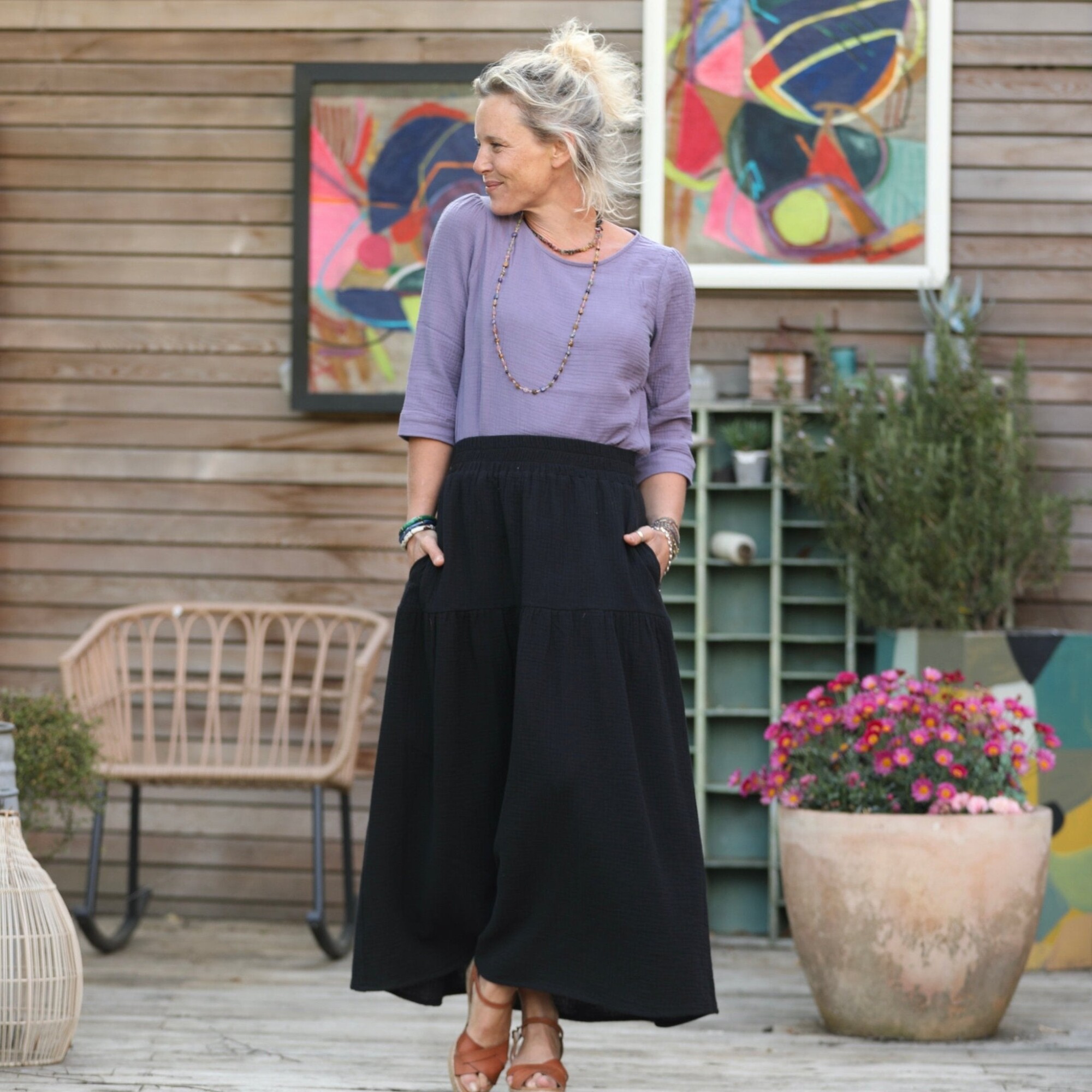 Sarah : une jupe à la ceinture élastiquée de 6 cm de large, agrémentée d’un jeu de volants et de fronces pour un style bohème. Elle offre une belle aisance à la taille et dispose de deux poches latérales.