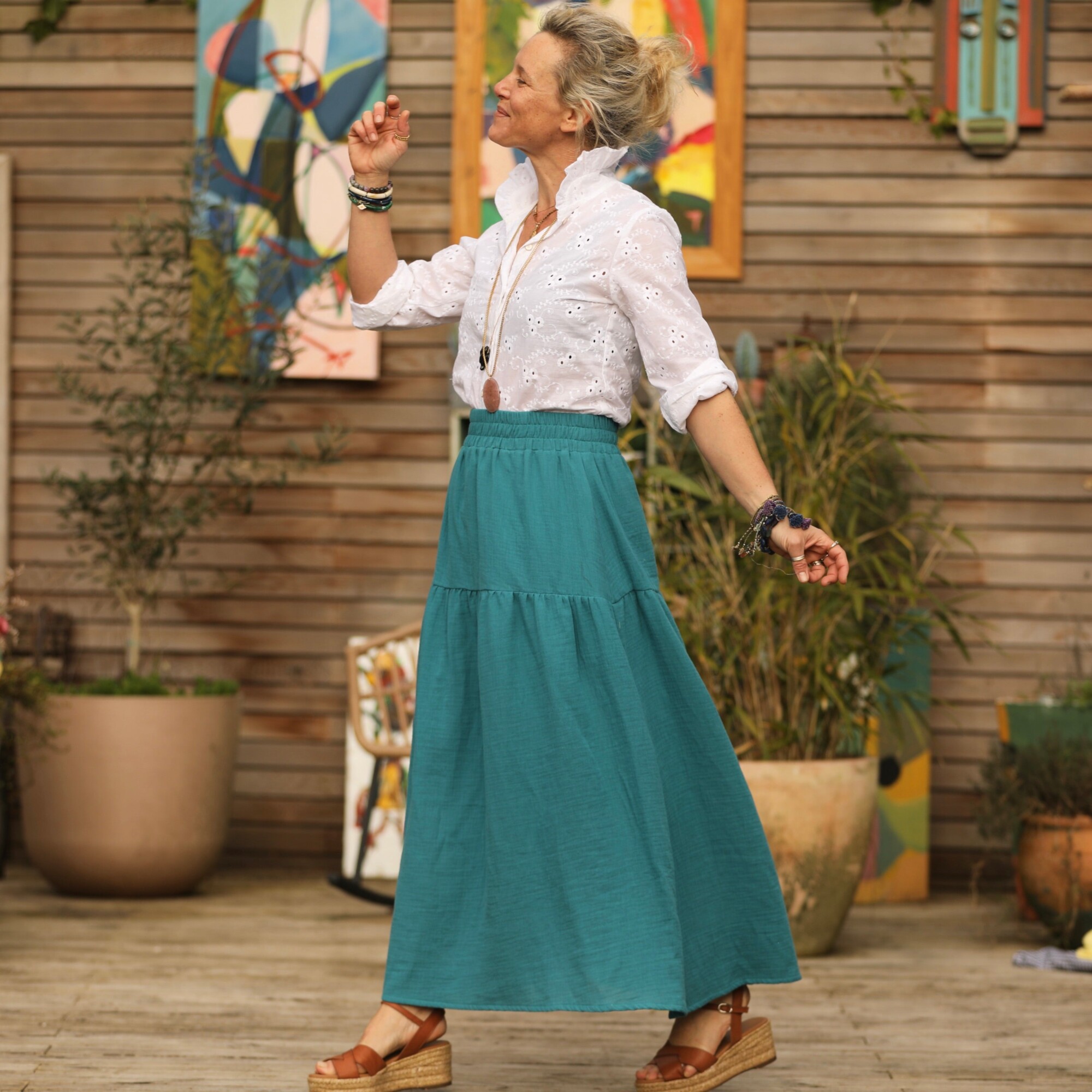 Sarah : une jupe à la ceinture élastiquée de 6 cm de large, agrémentée d’un jeu de volants et de fronces pour un style bohème. Elle offre une belle aisance à la taille et dispose de deux poches latérales.