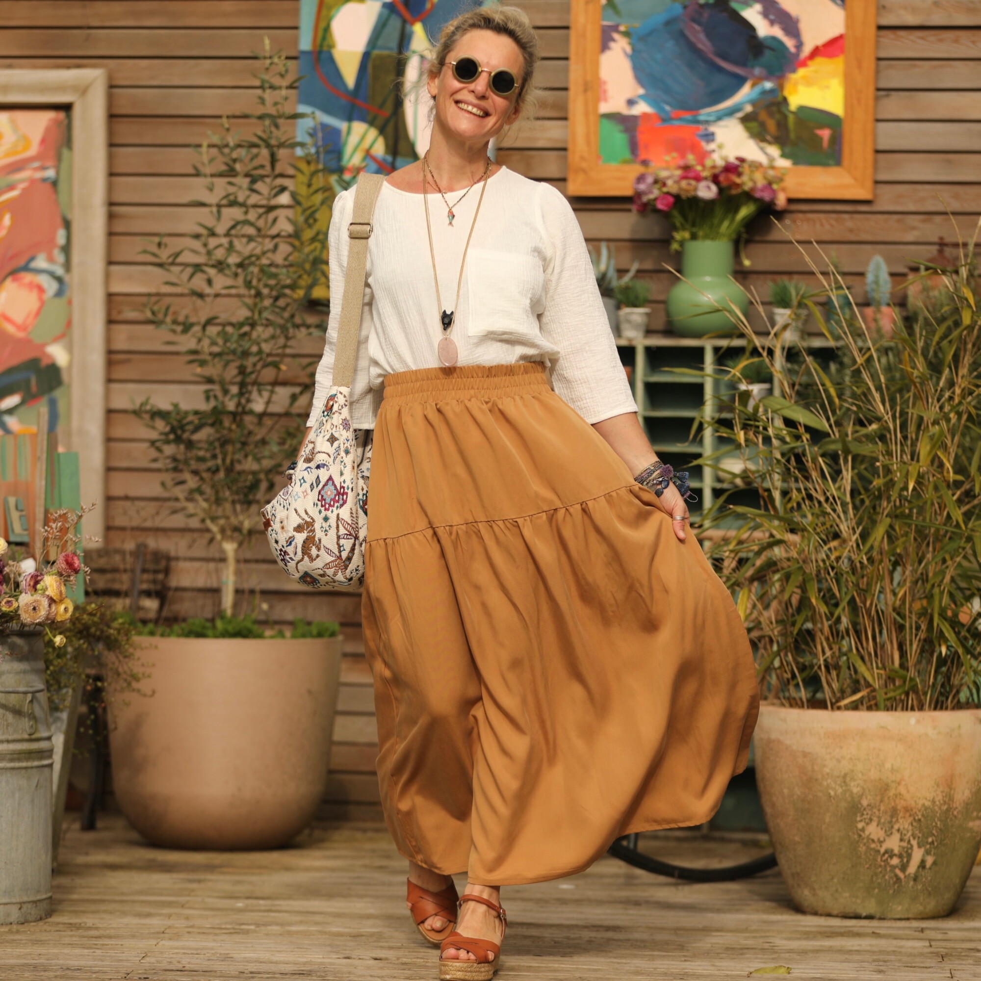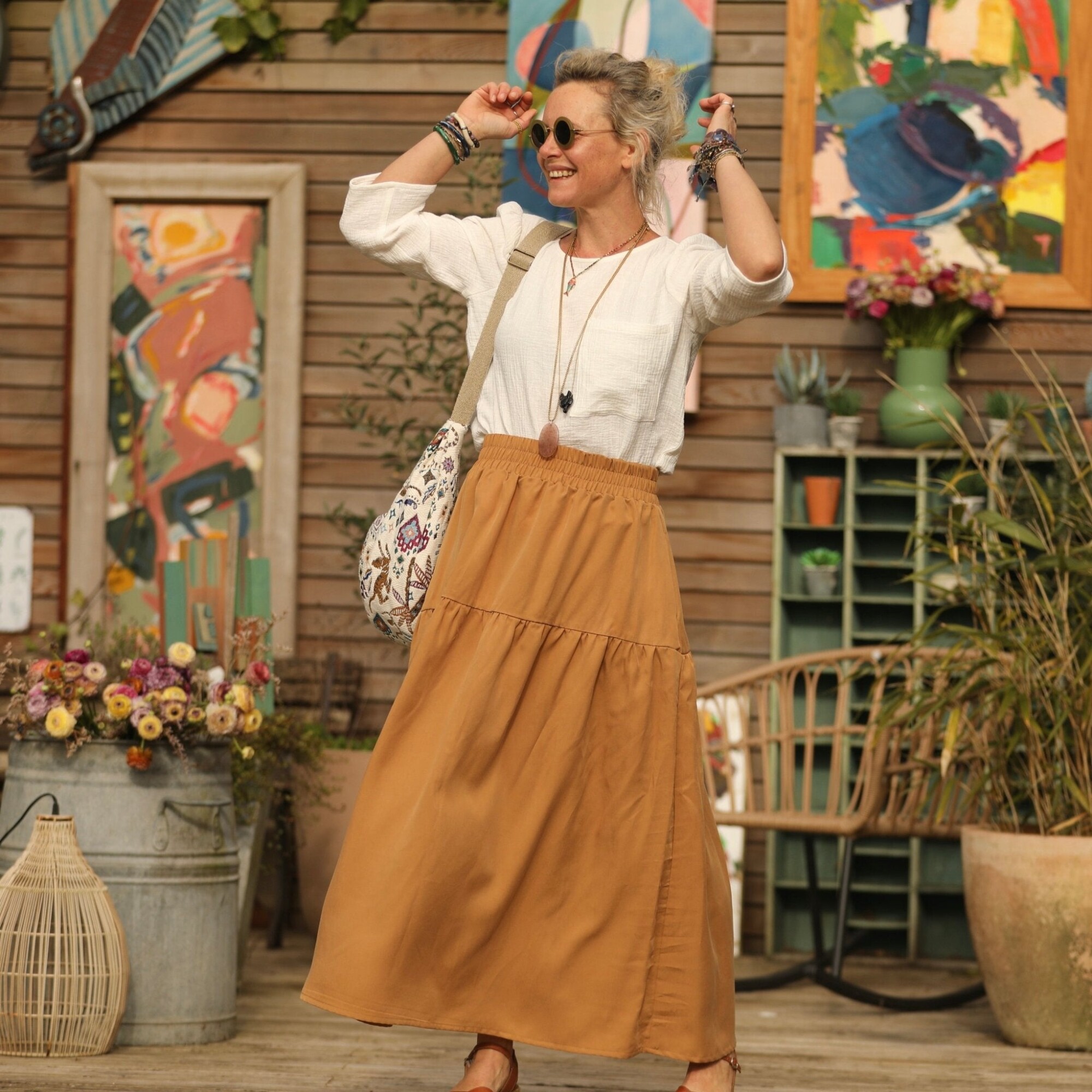 Sarah : une jupe à la ceinture élastiquée de 6 cm de large, agrémentée d’un jeu de volants et de fronces pour un style bohème. Elle offre une belle aisance à la taille et dispose de deux poches latérales.