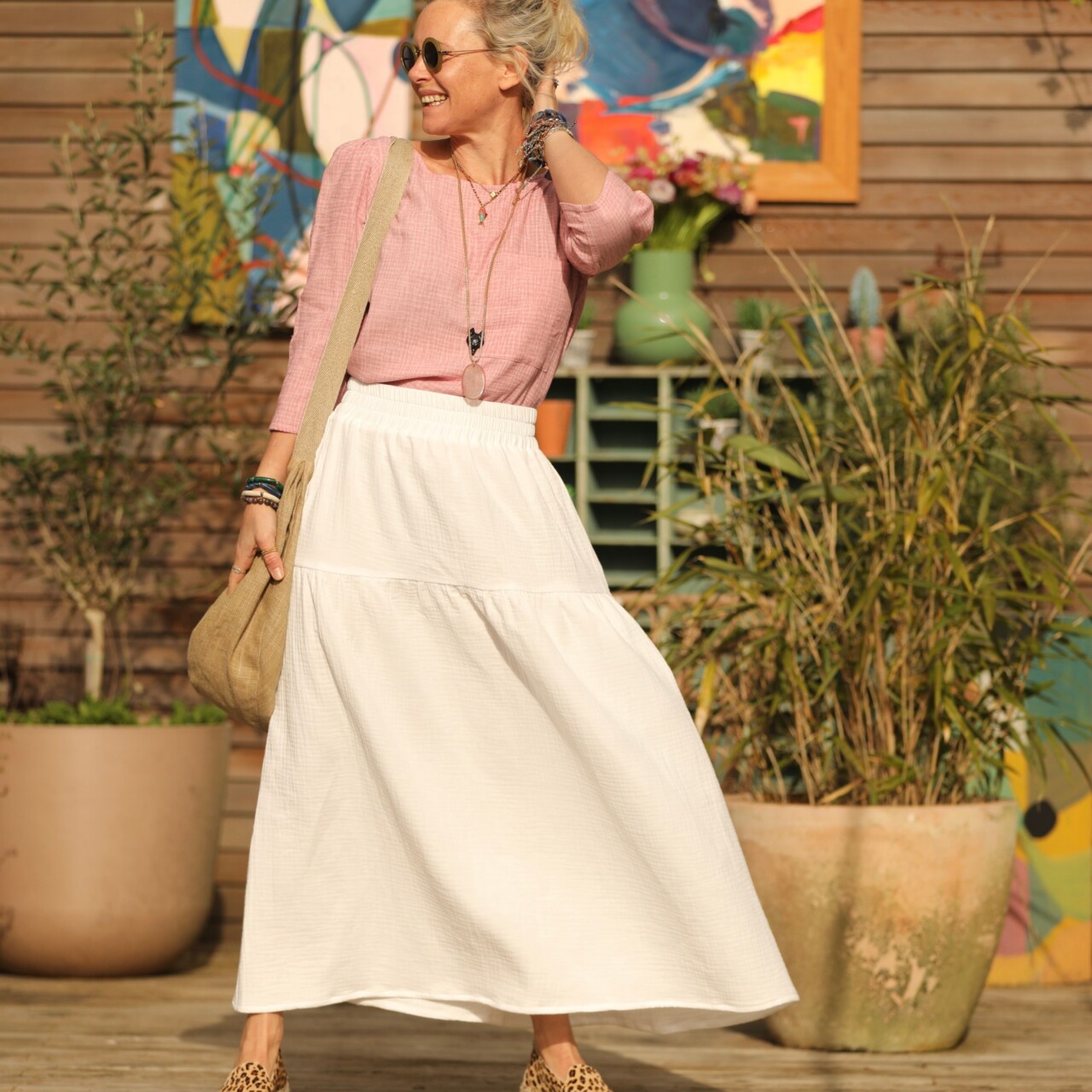 Sarah : une jupe à la ceinture élastiquée de 6 cm de large, agrémentée d’un jeu de volants et de fronces pour un style bohème. Elle offre une belle aisance à la taille et dispose de deux poches latérales.