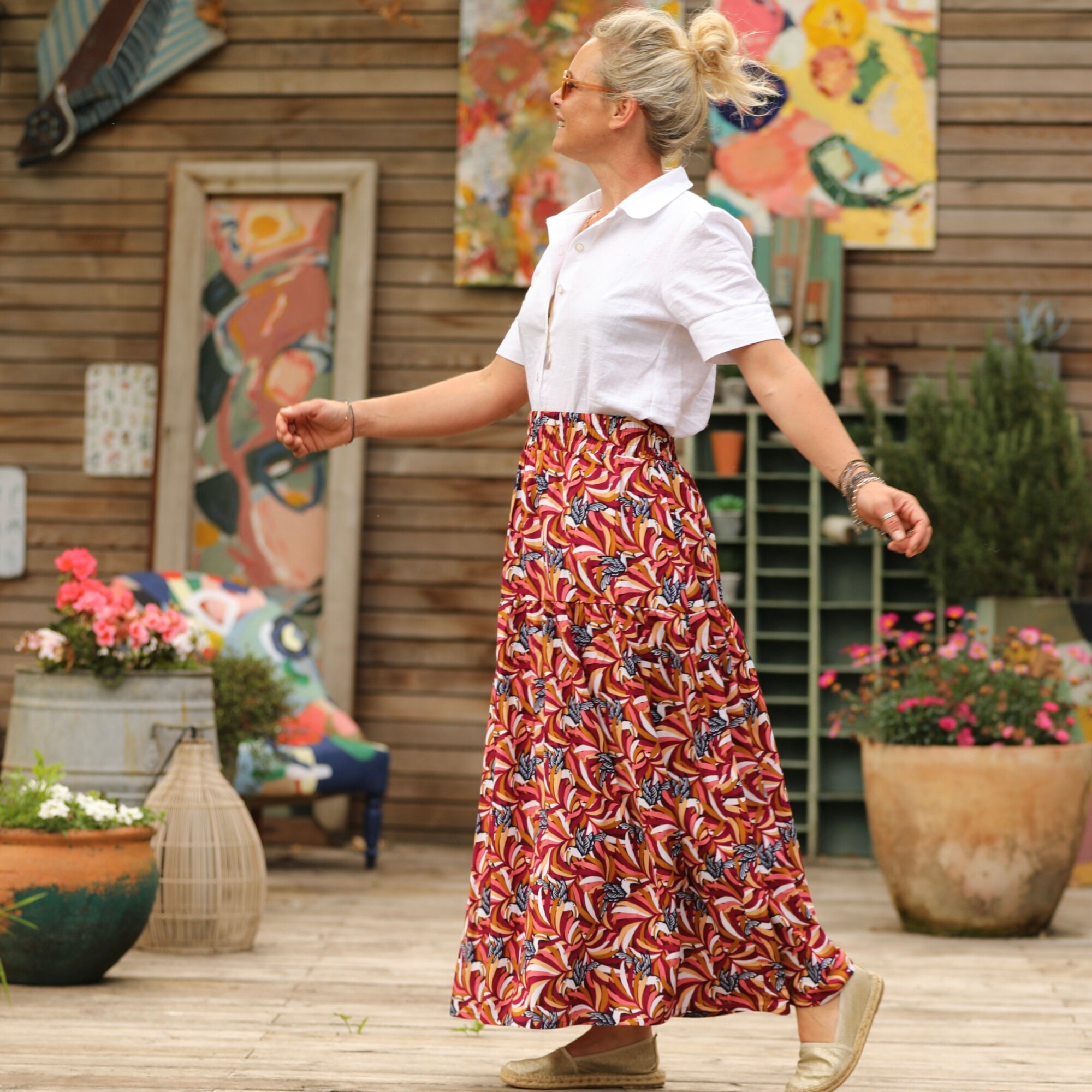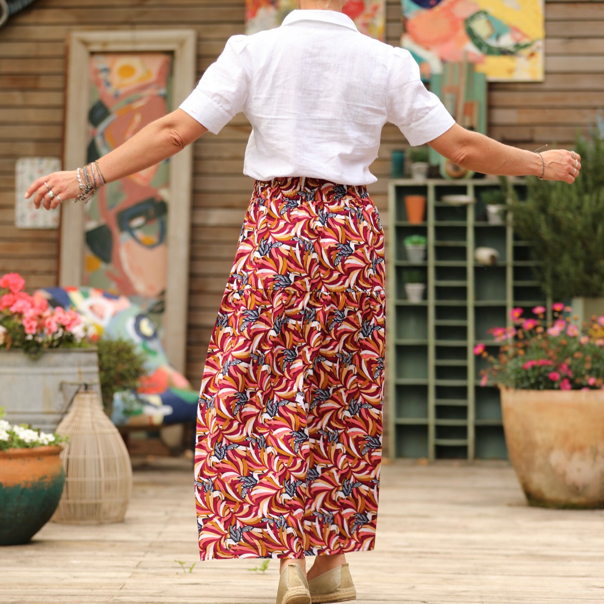 Sarah : une jupe à la ceinture élastiquée de 6 cm de large, agrémentée d’un jeu de volants et de fronces pour un style bohème. Elle offre une belle aisance à la taille et dispose de deux poches latérales.