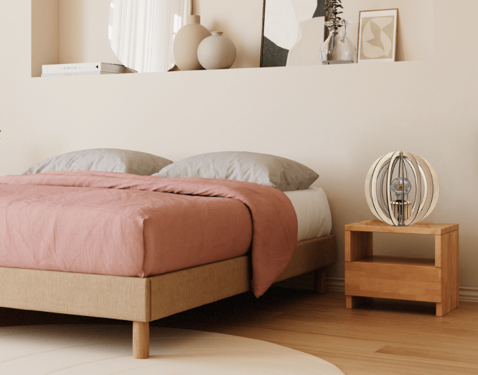Issue de la collaboration Atelier Loupiote x Kipli, la lampe à poser OYA en bois, façonne l’intérieur avec ses jeux d’ombres, sa lumière chaleureuse et son aspect naturel.