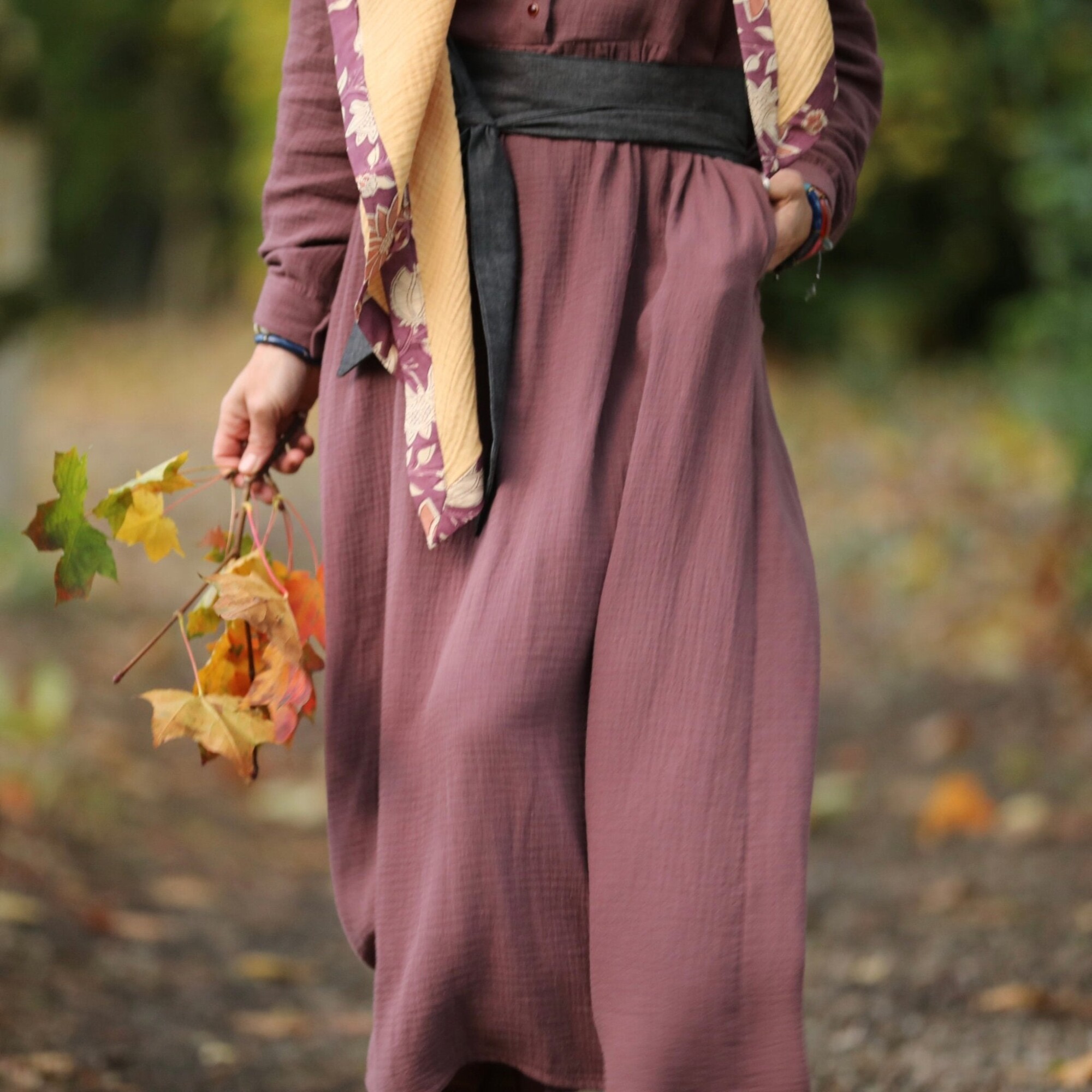 Calista est un foulard triangle aux dimensions généreuses (190 × 125 × 125 cm), conçu pour envelopper avec grâce et légèreté. Sa base en double gaze de coton offre une texture aérienne et douce.