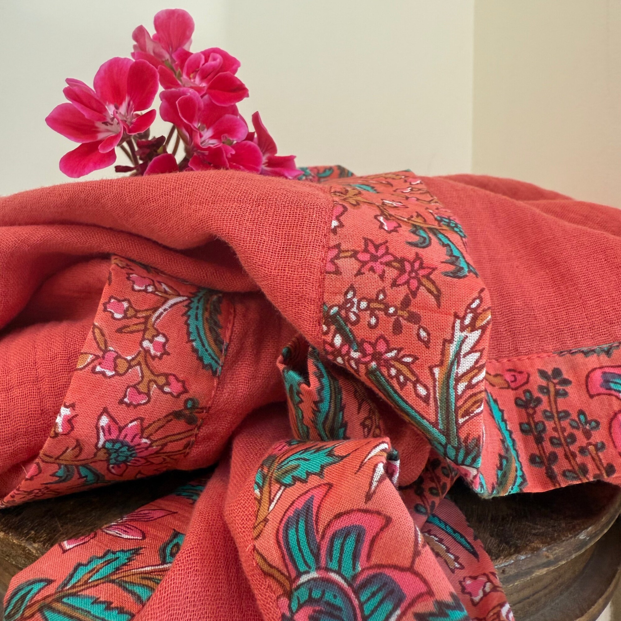 Calista est un foulard triangle aux dimensions généreuses (190 × 125 × 125 cm), conçu pour envelopper avec grâce et légèreté. Sa base en double gaze de coton offre une texture aérienne et douce.