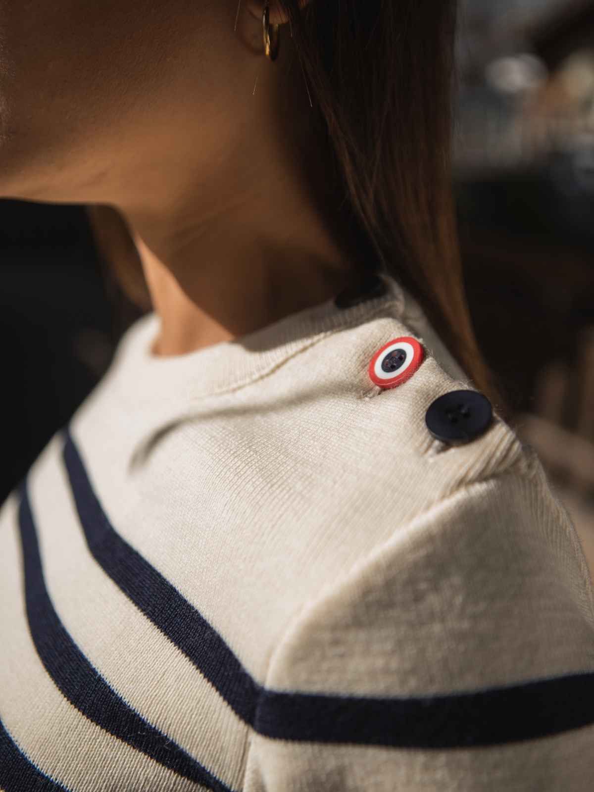 Le pull marin rayé débarque chez Tranquille Emile ! Notre nouveau pull Le Navigateur est en 100% pure laine de mérinos avec 3 boutons sur l’épaule. Une coupe légèrement ajustée, un petit col montant et un bouton cocarde pour une touche unique. Le tricotage est bien dense pour un pull robuste qui durera des années.Nos pulls sont tricotés et assemblés à Roanne dans une manufacture de plus de 35 ans d’existence pour un pull 100% Made in France. Ce pull a un col de 3 cm et 3 boutons sur l’épaule gauche pour une touche toute féminine. Chloé, notre mannequin mesure 1m70 et porte du S.
