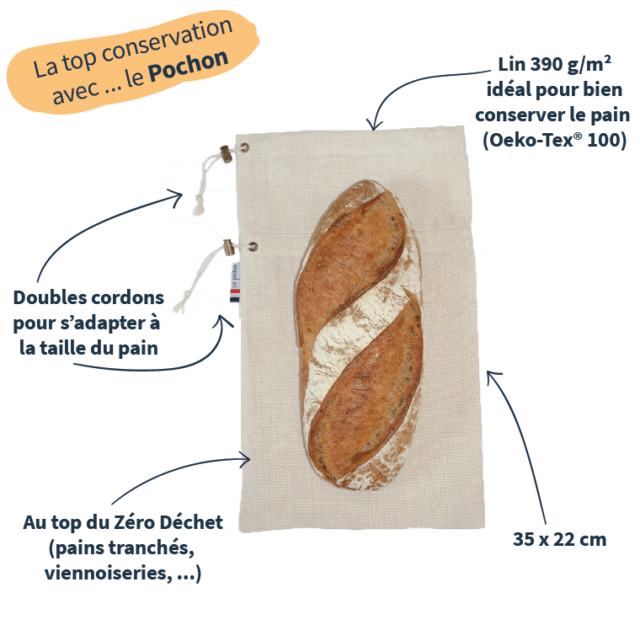 Le Pochon est un sac à pain en tissu 100% lin. Il est idéal pour conserver votre pain à la maison.Vous pourrez y ranger un pain rectangulaire, un pain ovale, ou encore un reste de baguette. A noter : il n'est pas adapté aux pains ronds (pour cela, voir plutôt le Gourmand).Le lin épais de qualité permet d’optimiser la conservation du pain. Il le protège de l’air, tout en le laissant suffisamment respirer. Le phénomène de rassissement est ainsi retardé.Le Pochon est une alternative durable aux emballages papiers de la boulangerie. Vous pourrez l’emporter avec vous et y glisser directement votre pain, pain tranché, voire les croissants du dimanche matin !Fabriqué en France (Anjou), par notre atelier de couture partenaire ESAT qui soutient l'inclusion de personnes en situation de handicap.Réutilisable et lavable en machine. Lin certifié Oeko-Tex® 100 (teintures sans substances nocives).