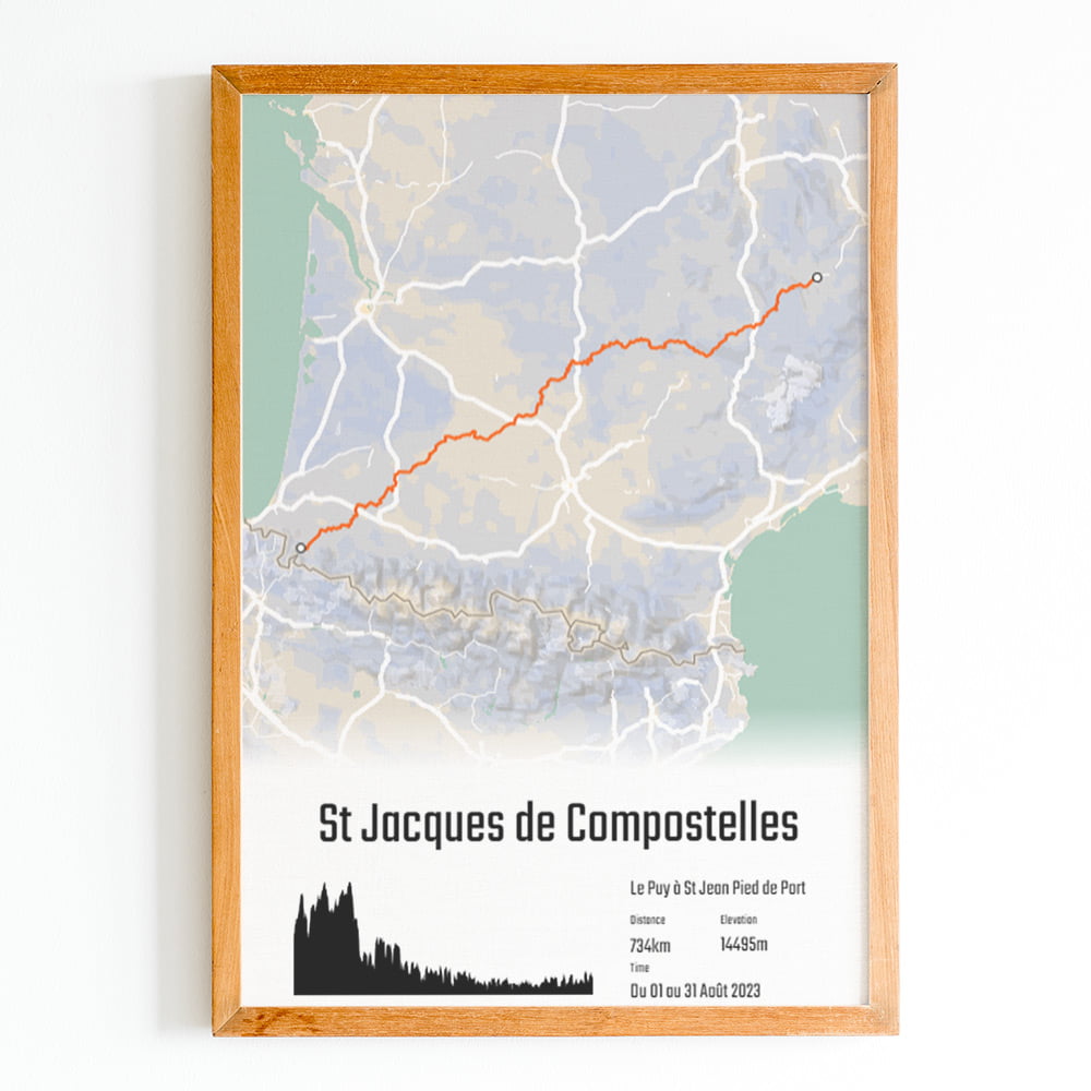 Cette affiche du parcours du chemin de Saint jacques de Compostelles est imprimée sur du papier brillant haute qualité.Pour créer un poster personnel et unique, ajoutez votre nom, votre numéro de dossard et votre temps d'arrivée.