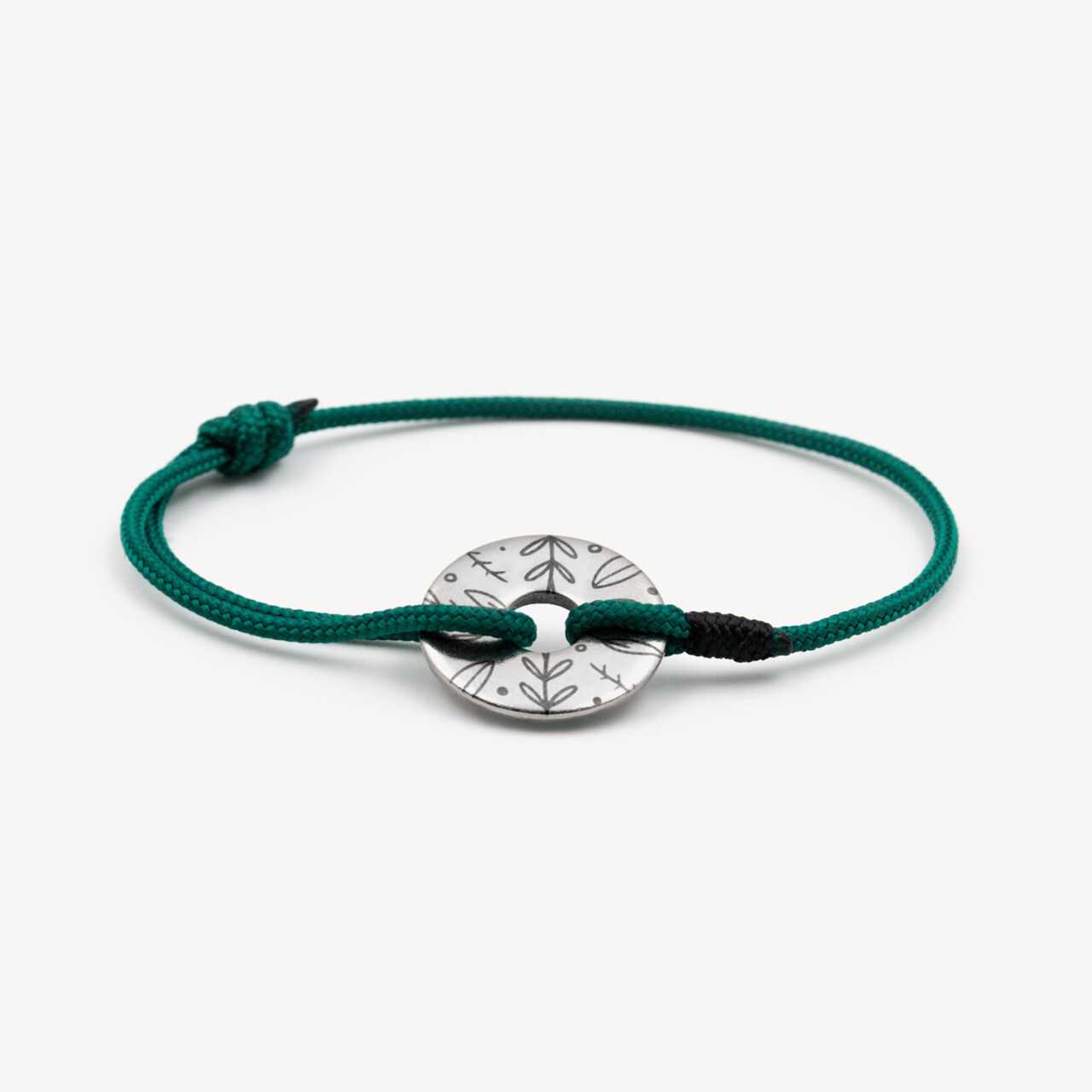 Bracelet pour femme Bracelet réglable grâce à son nœud coulissant Tour de poignet allant de 16cm à 20cm Bijou en acier inoxydable : Anneau 20mm trou de 6mm Paracorde Type 1 (2mm) : vert Nanoparacorde : noire Gravure laser : Feuille / Végétal