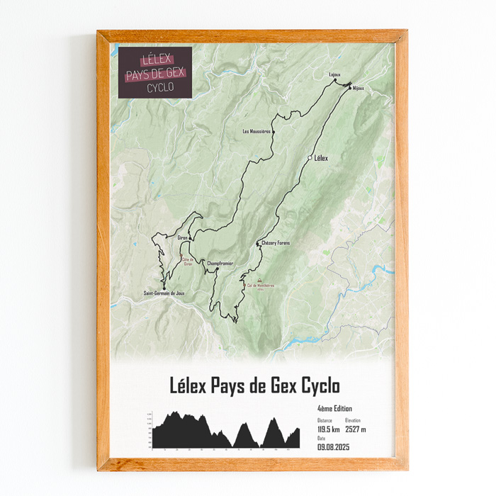 Cette affiche du parcours de la Lélex Pays de Gex Cyclo 120km est imprimée sur du papier brillant haute qualité.Pour créer un poster personnel et unique, ajoutez votre numéro de dossard, votre nom, prénom, votre temps d'arrivée ou le texte que vous souhaitez.