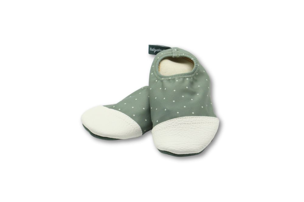Conçus en collaboration avec Babyatoutprix, nous vous proposons une jolie paire de chaussons au motif pois, les préférés de Noé. Cette couleur sauge , très à la mode, conviendra avec toutes les tenues. Parfaits pour les petits comme les grands ! Fabrication française. À utiliser en intérieur et en extérieur : piscine, mer, sable, jardin, terrasse ! Leur petit plus : ils limitent les glissades sur surfaces sèches et mouillées ! Ils seront parfaits pour les premiers pas de bébé !Aussi disponible en taille adulte.
