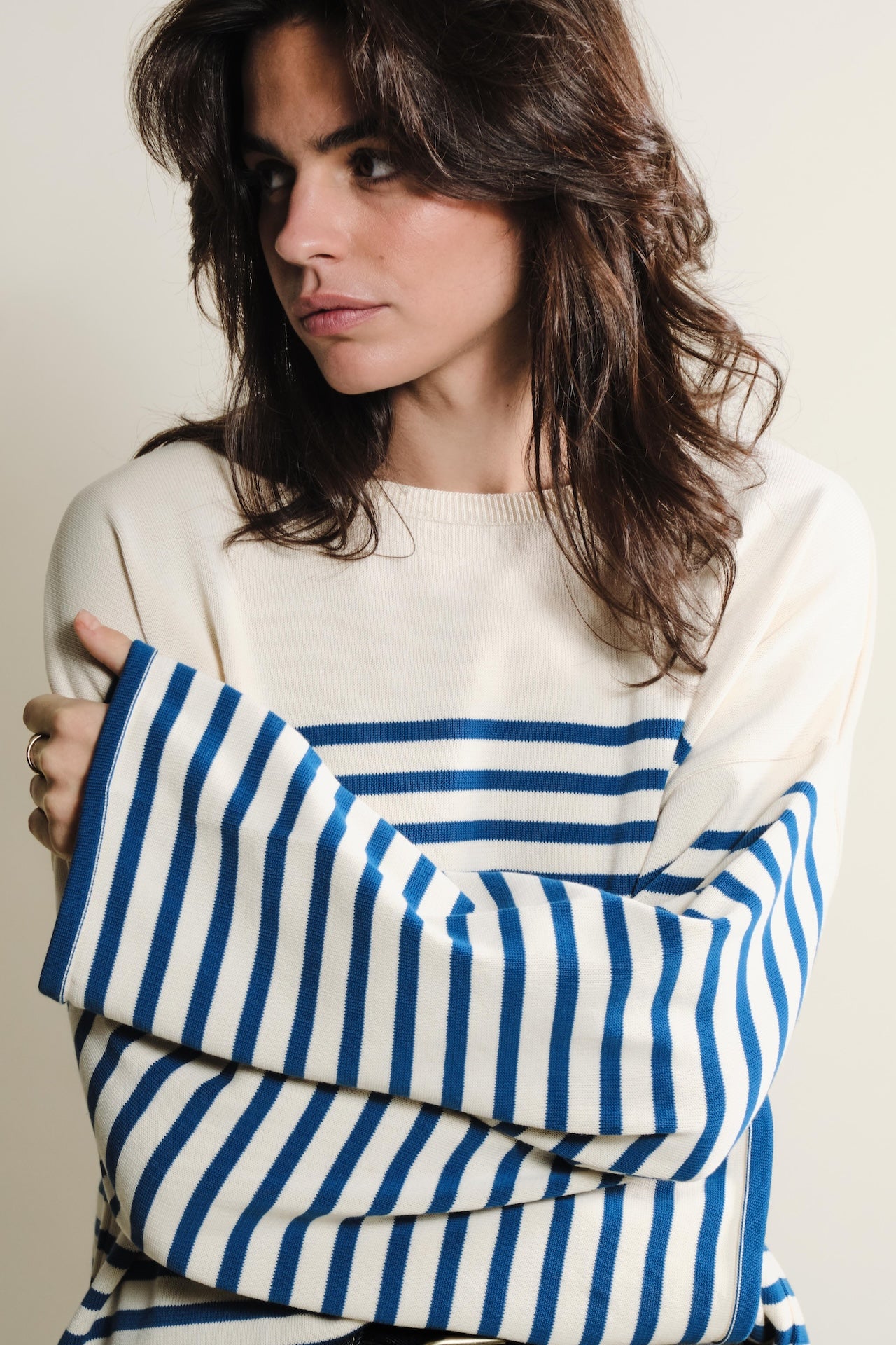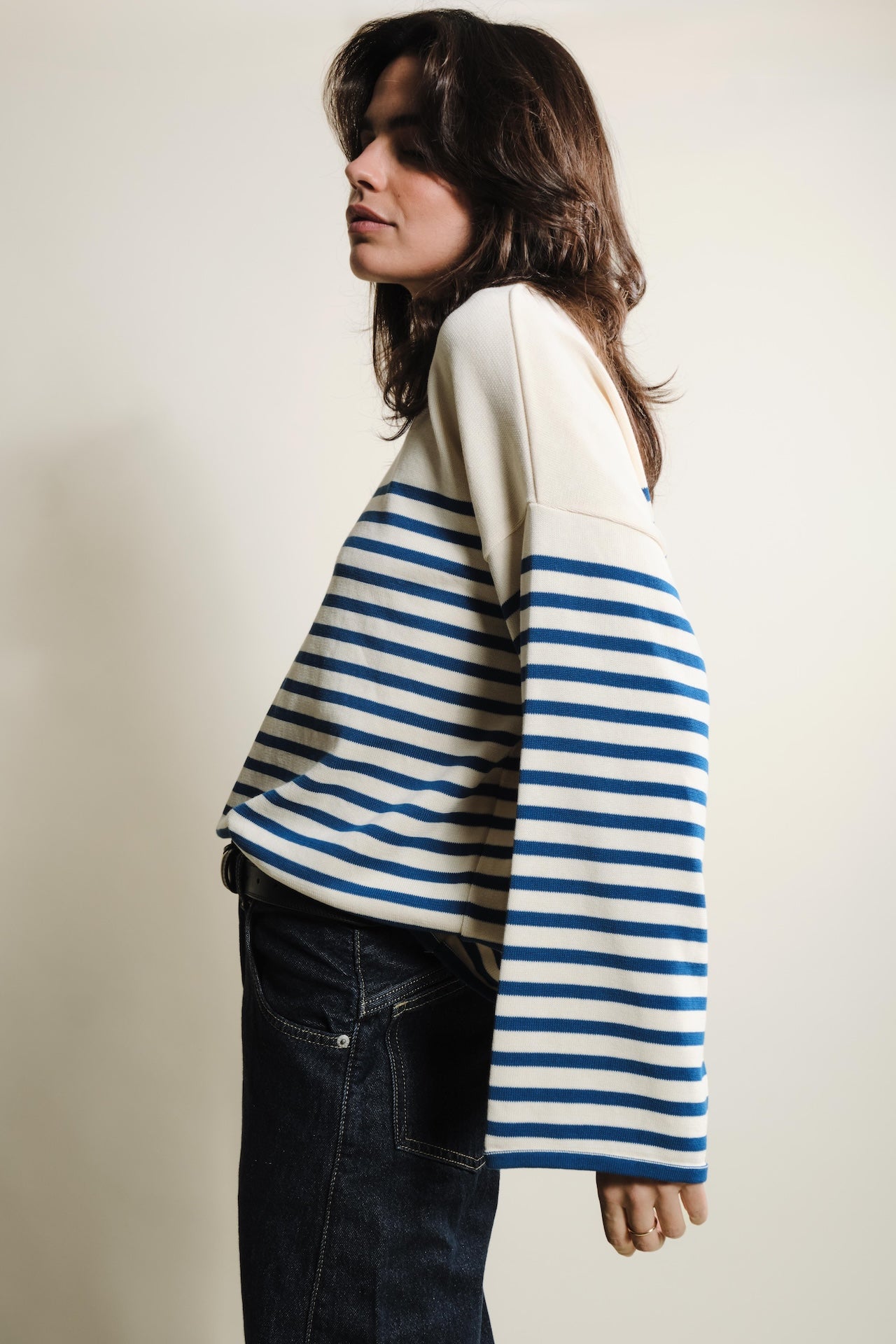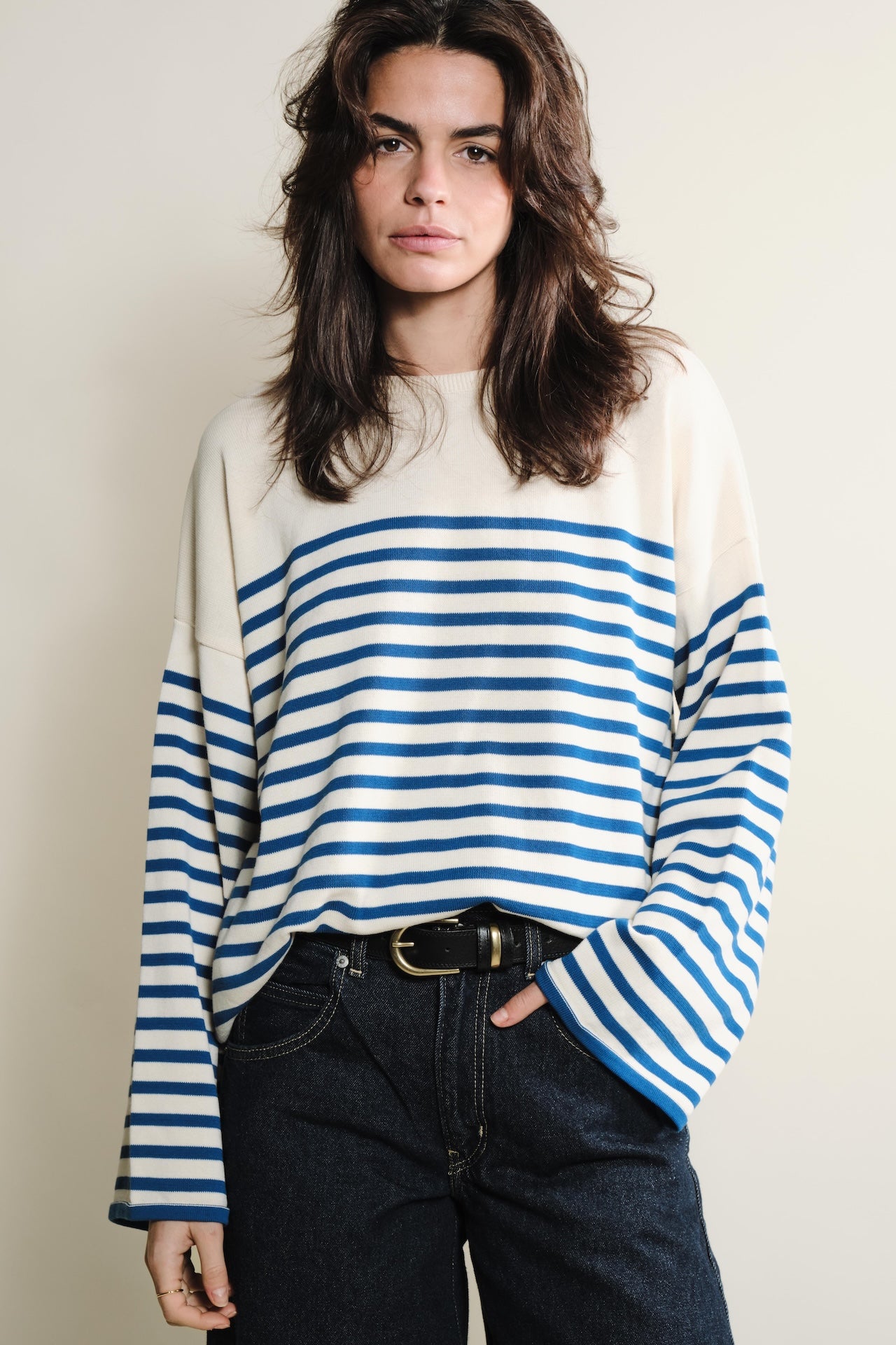 La maille Lori manches longues naturel / bleu roi propose une coupe ample et des épaules tombantes pour une silhouette élégante et confortable. Légère et respirante, elle convient parfaitement aux looks de mi-saison ou aux journées plus douces. Le tricotage en jersey révèle de délicates rayures, et le fil sec au toucher frais apporte un confort agréable tout au long de la journée. Polyvalente, cette maille se porte seule ou superposée pour un style casual ou plus structuré. Conçue en coton 100 % biologique et certifiée GOTS, OCS Blended et OEKO-TEX® Standard 100, cette maille naturel / bleu roi combine qualité, style et responsabilité environnementale. Matière : 100% coton biologique, labellisé OEKO-TEX standard 100 Tricotage : jersey Coupe : ample, épaules tombantes Finitions : poignets larges Toucher : sec et frais